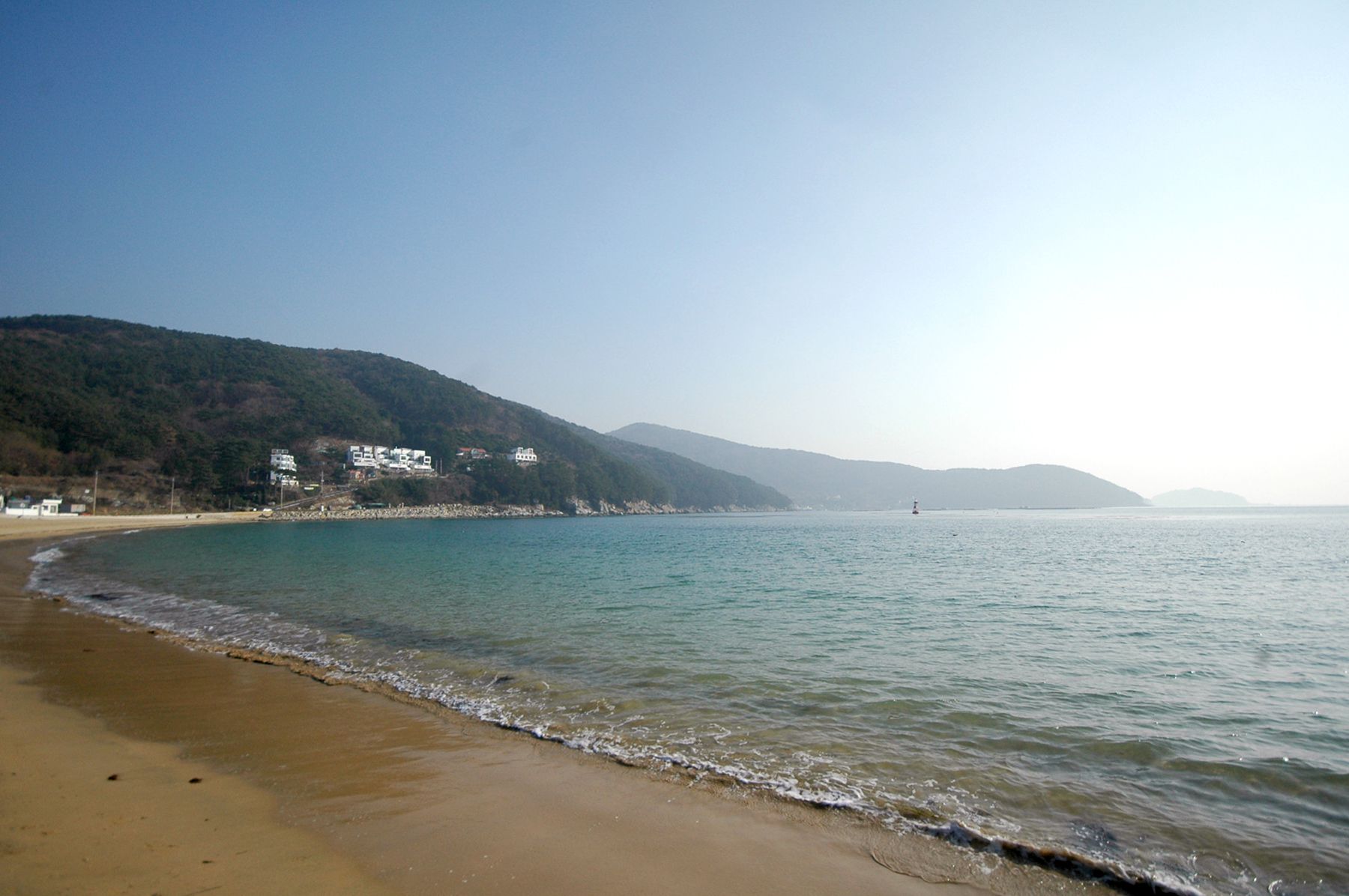 산으로 둘러싸여 더 아늑한 느낌이 드는 해수욕장으로