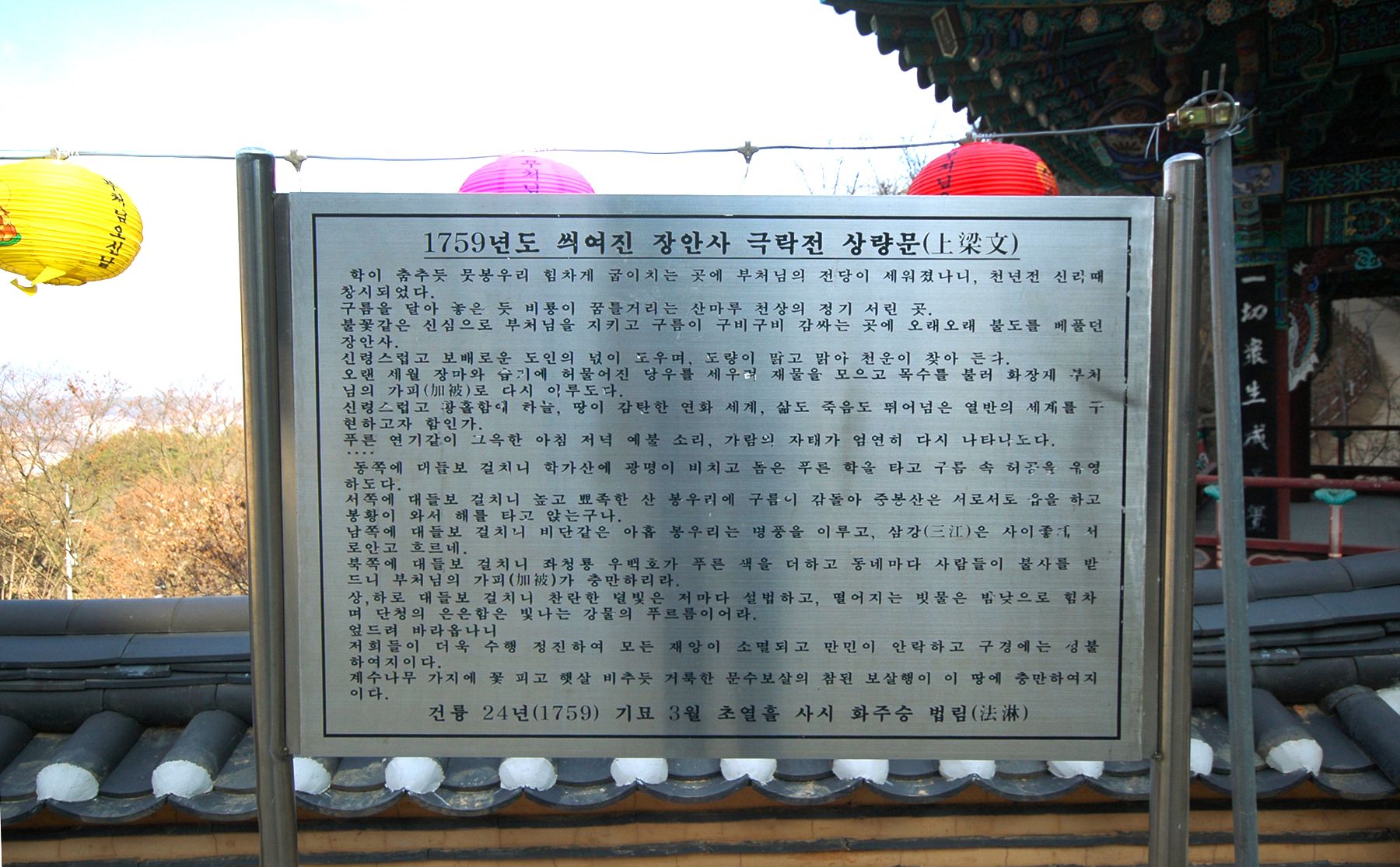 장안사는 1627년 덕잠이 중창하였고, 1709년 청민이 범종각을 중수하였습니다.