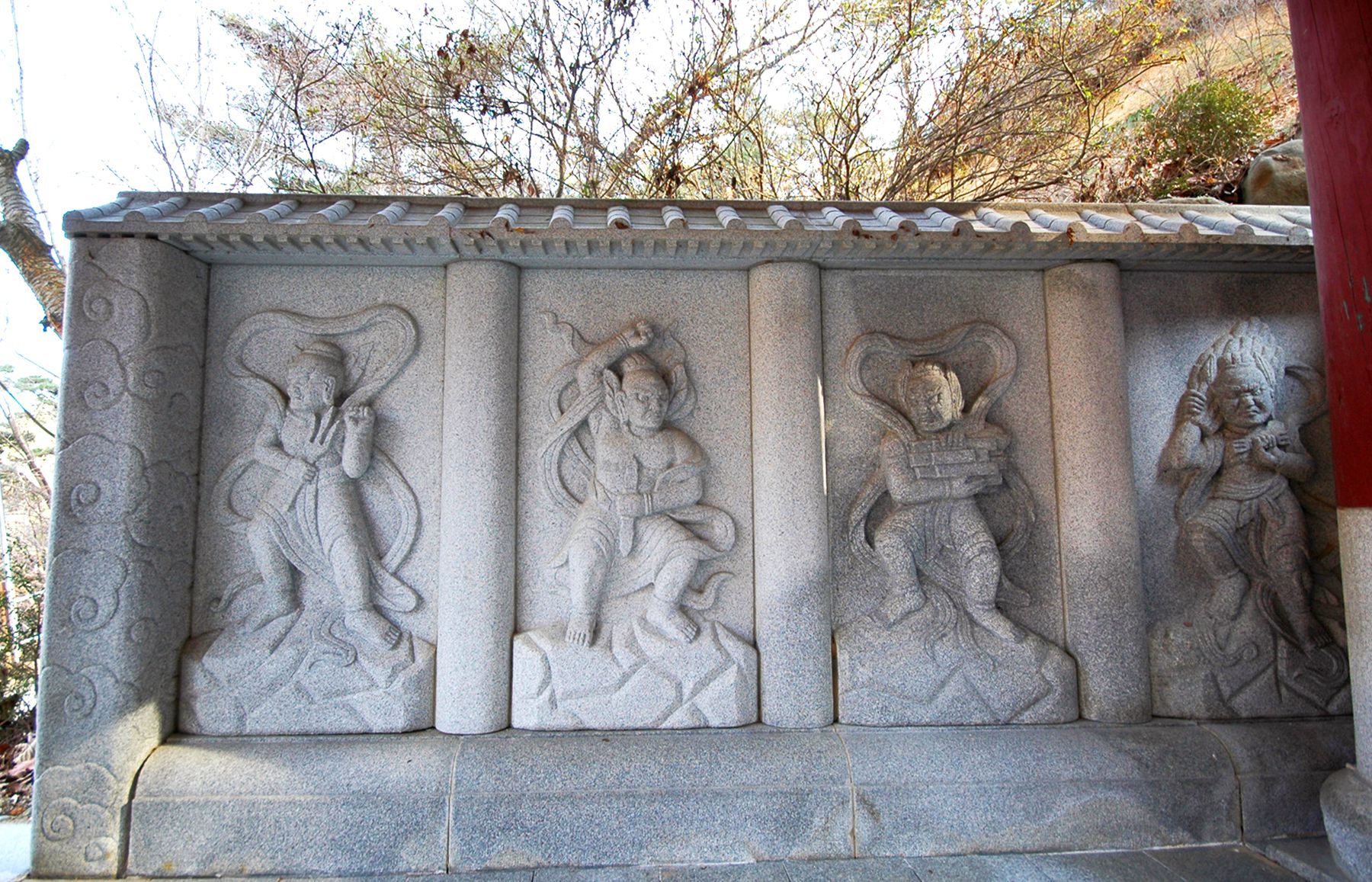 범종각 1층 누각에는 나한상과 부처상이 조각되어 있습니다.