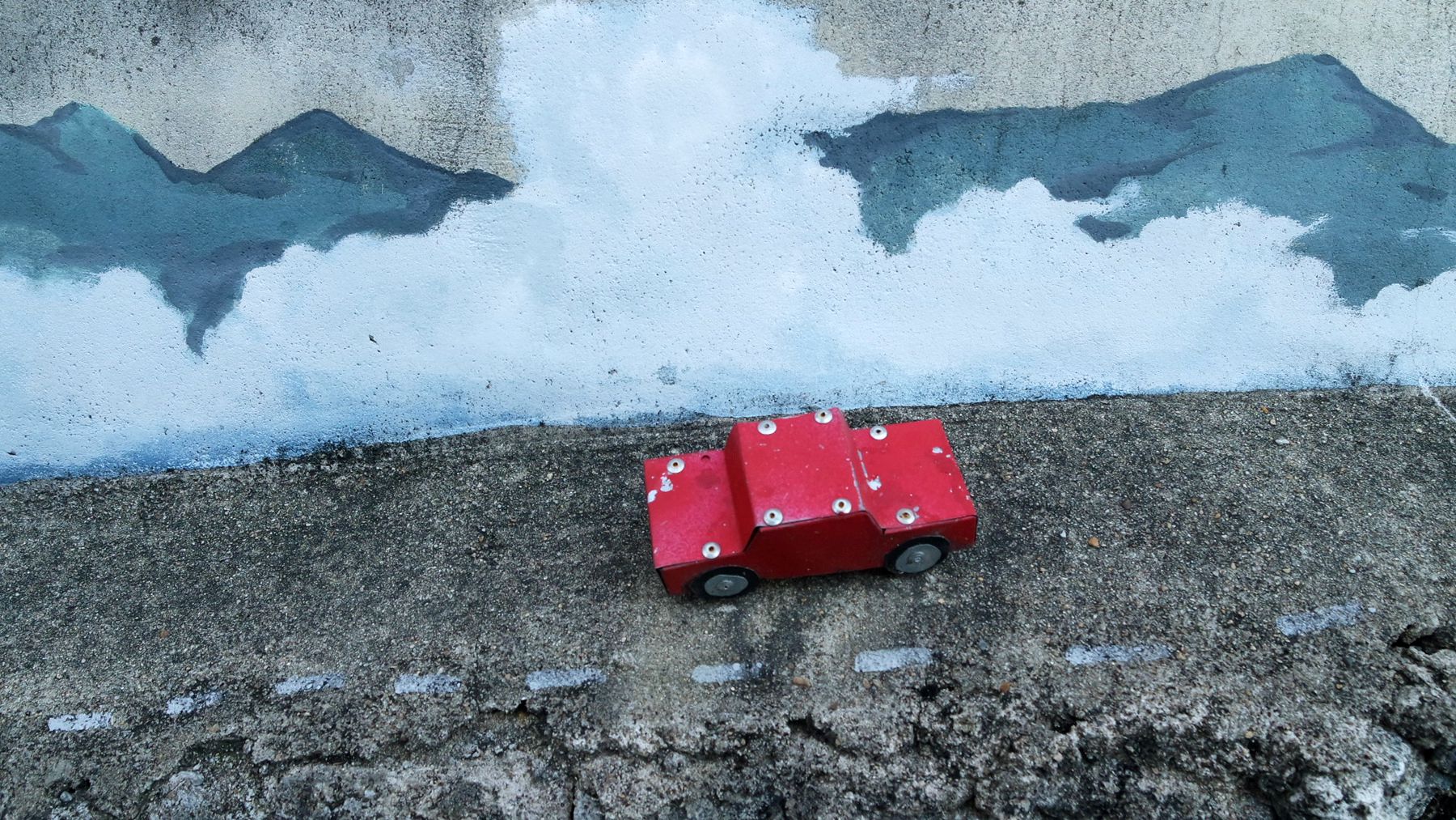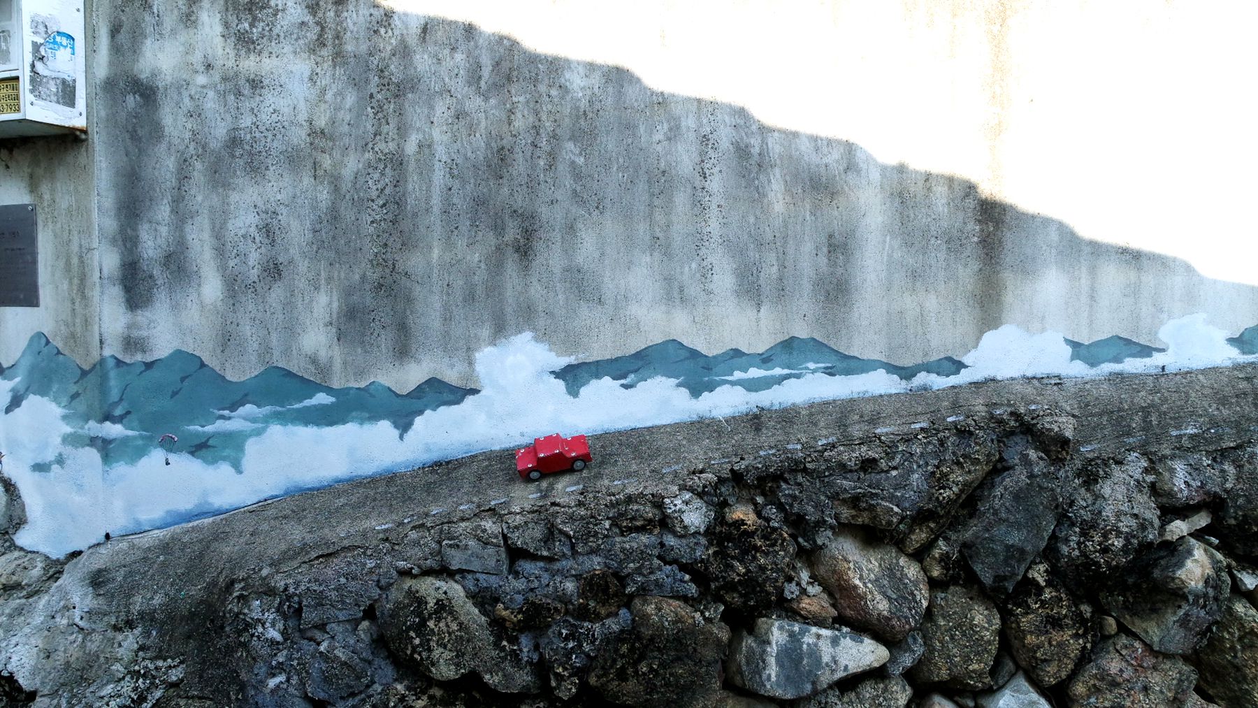 누군가 파도 그림 앞에 작은 자동차를 한 대 올려둔 모습입니다.