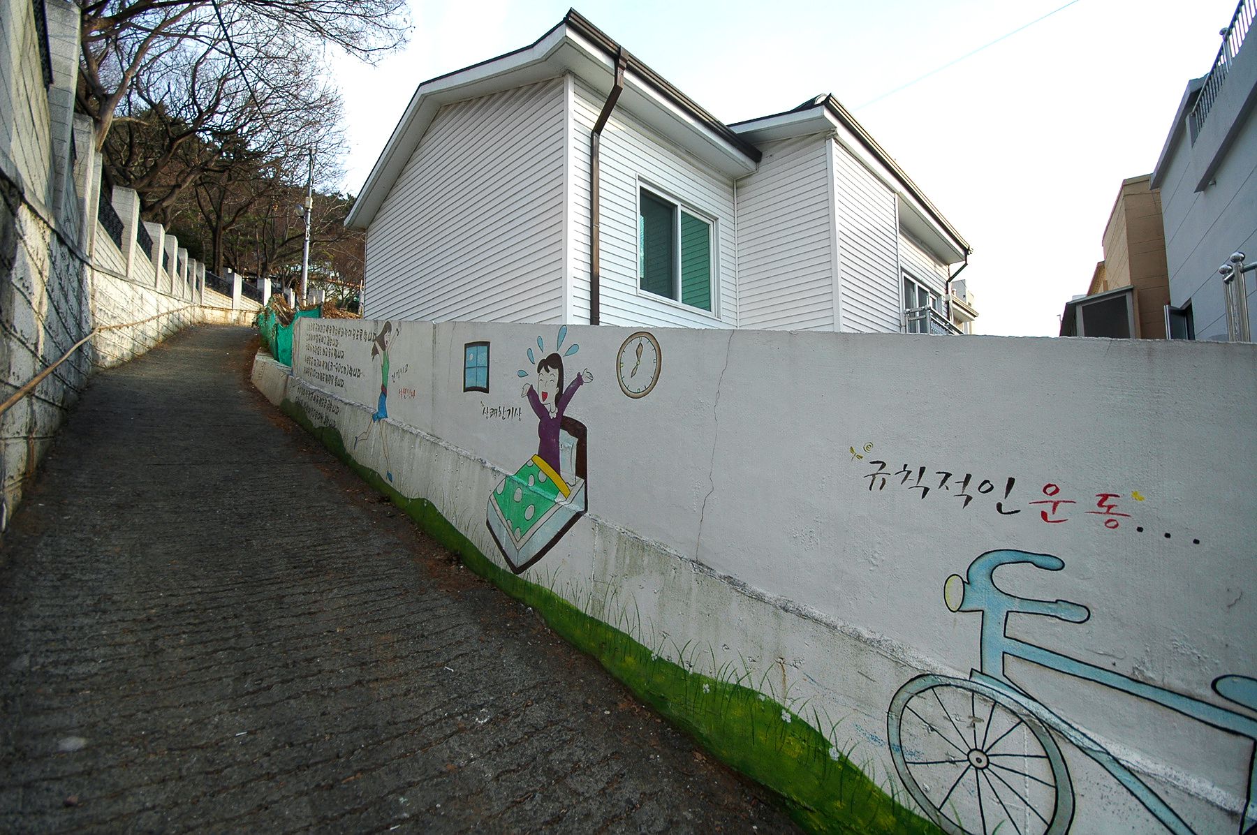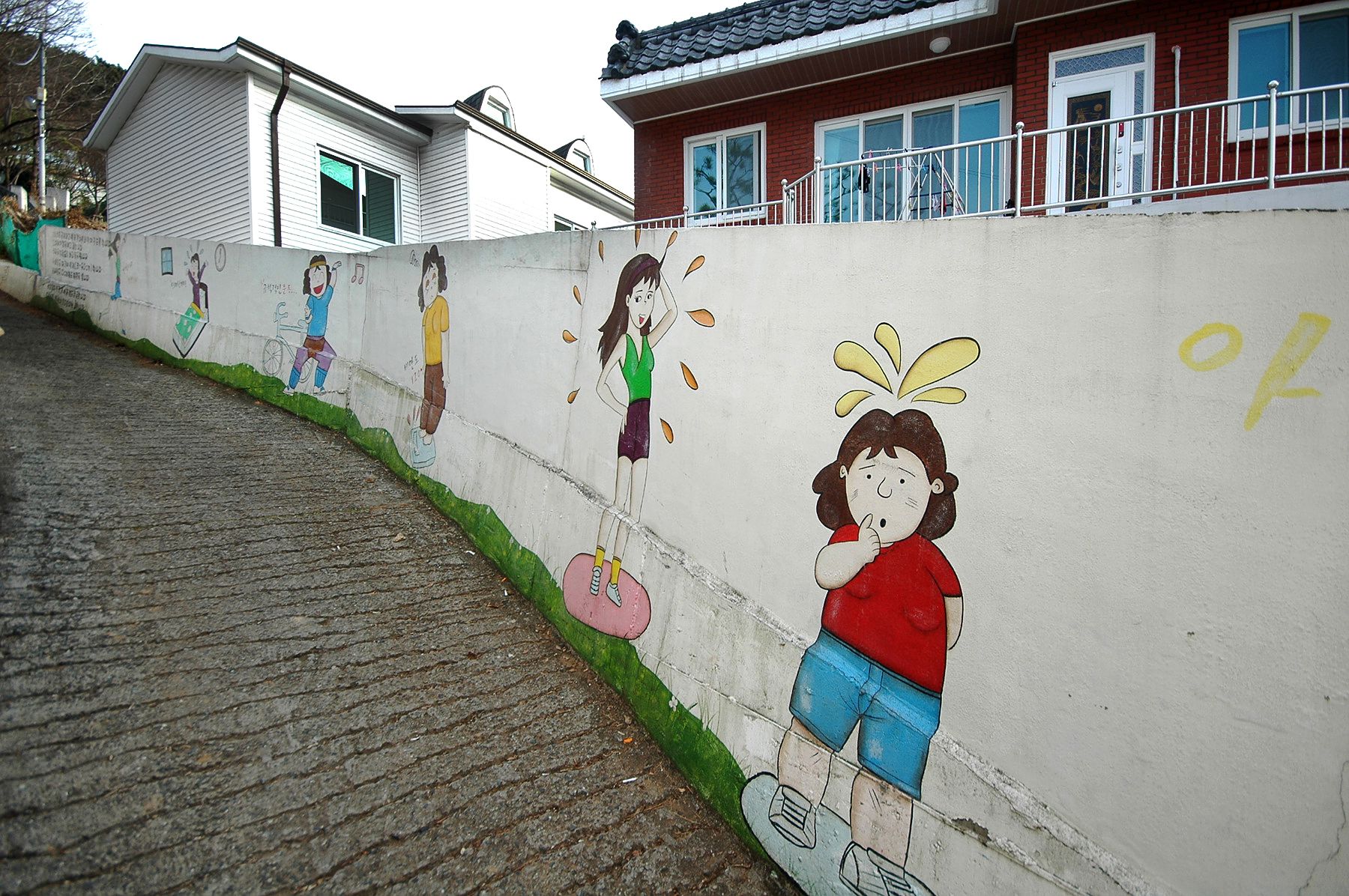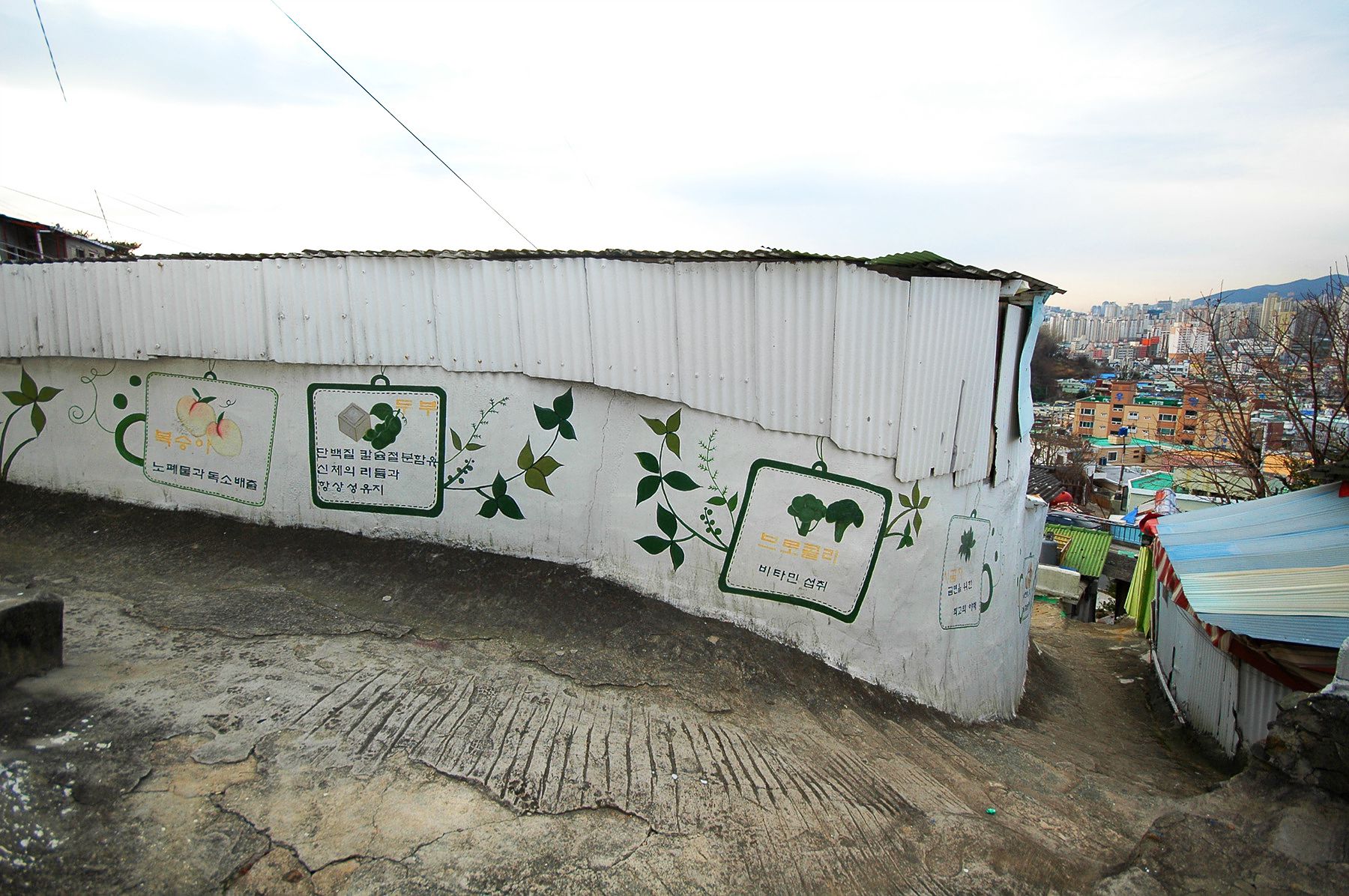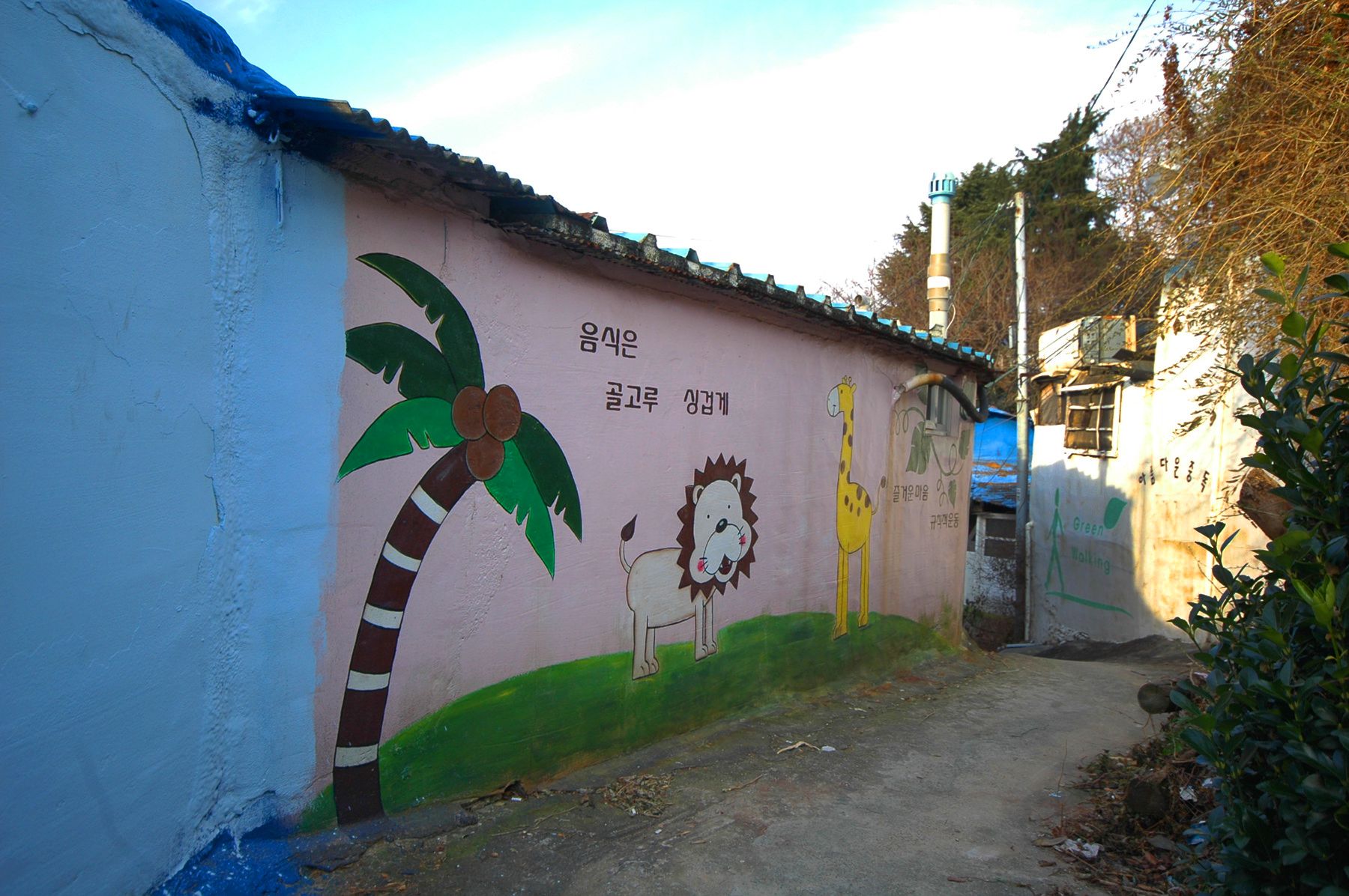 2010년 동래구 칠산동의 마을 입구과 담벼락에 건강을 주제로 벽화를 그려서