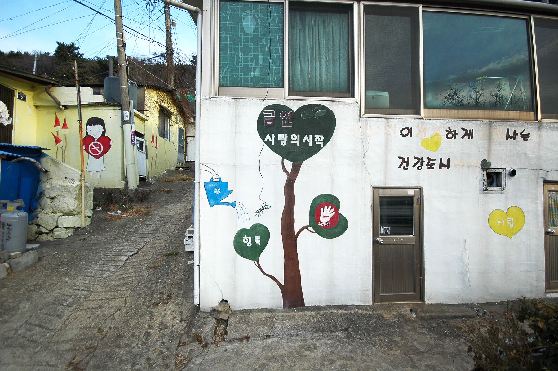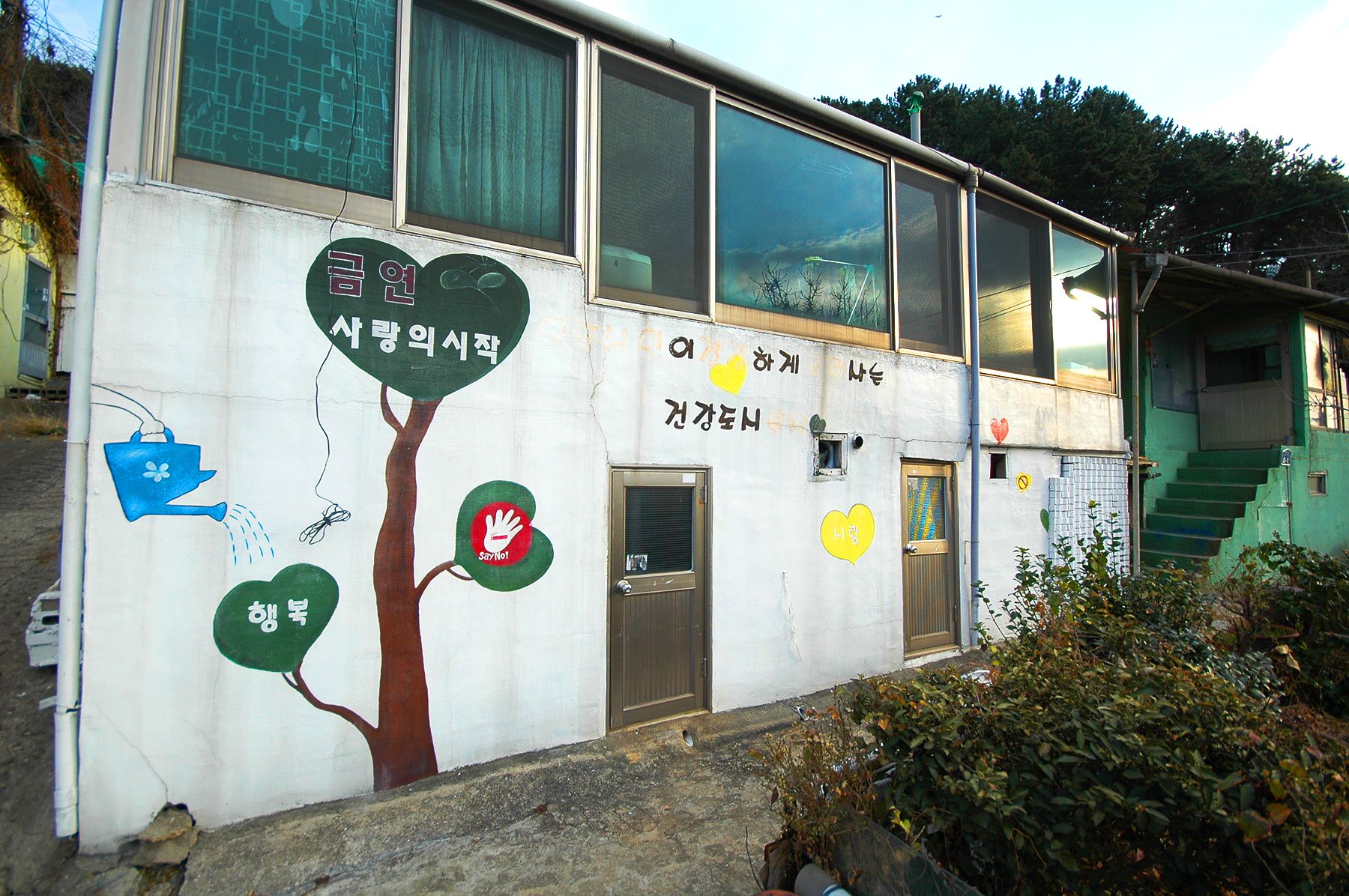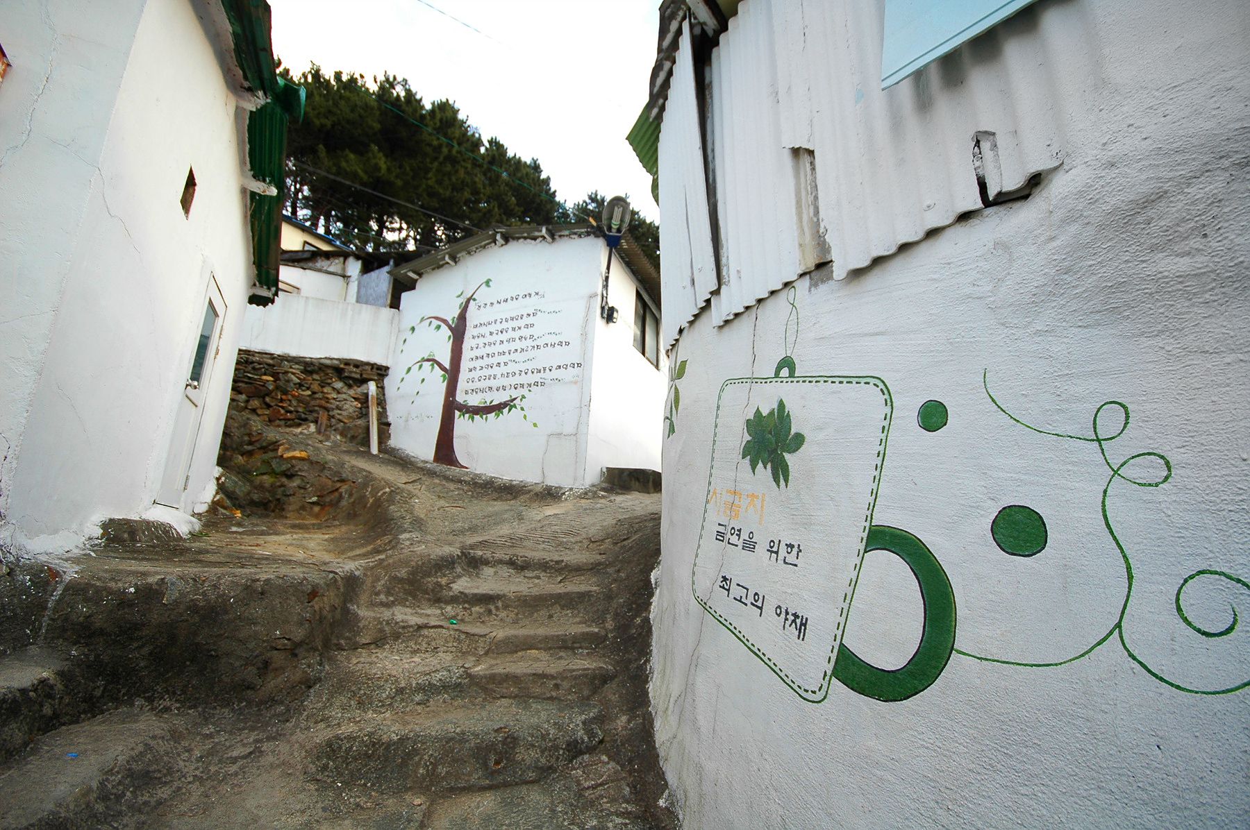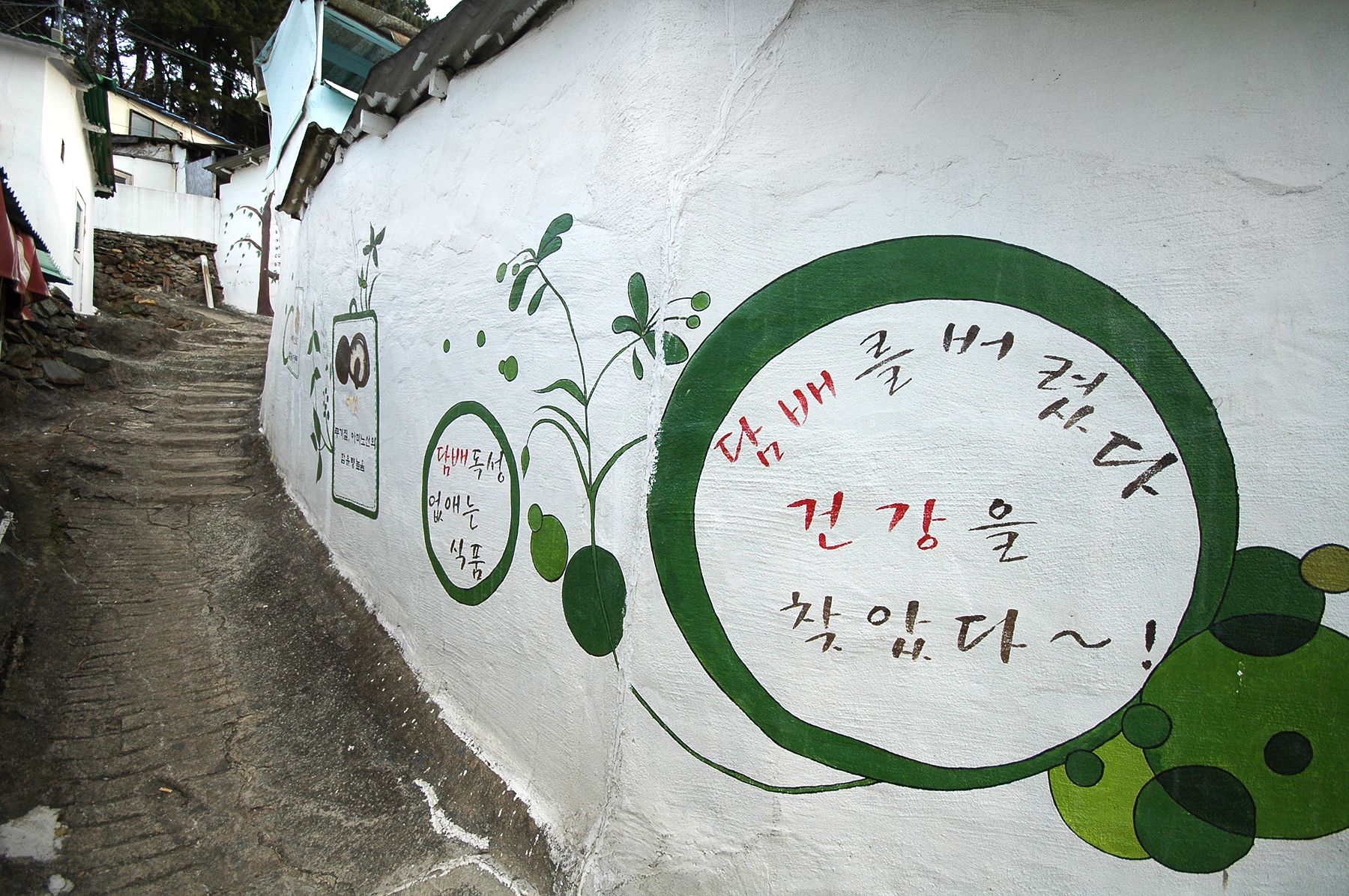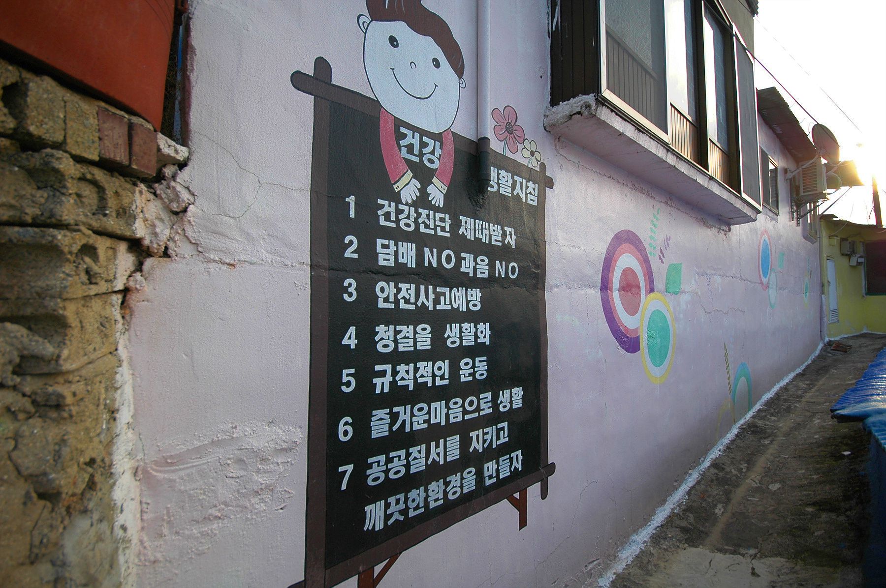 2010년 동래구 칠산동의 마을 입구과 담벼락에 건강을 주제로 벽화를 그려서