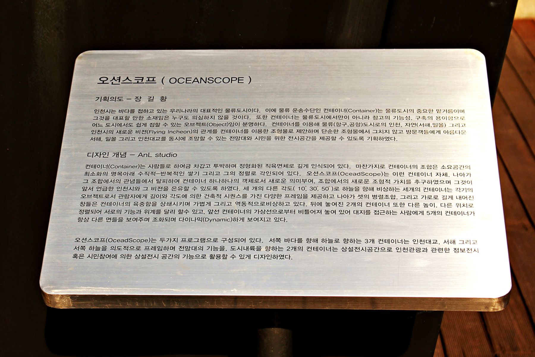 물류도시인 인천을 컨테이너로 표현하였으며, 인천대교와 일출, 일몰을 함께 감상할 수 있어