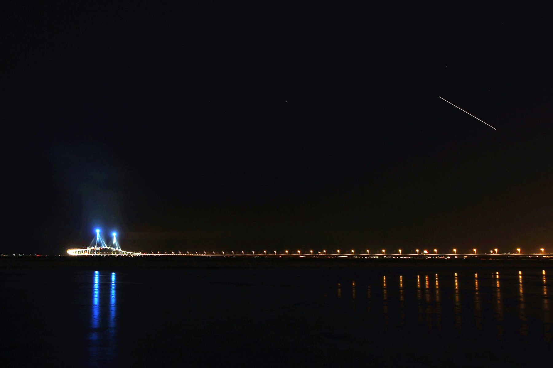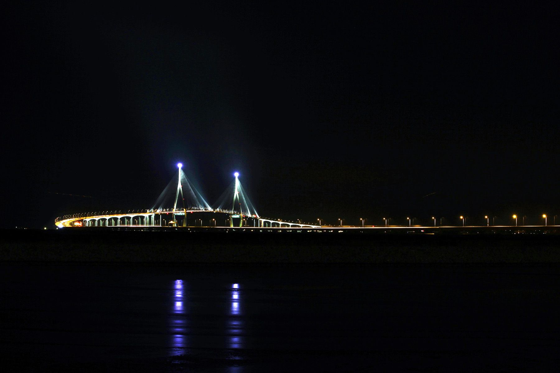 깜깜한 밤 아름답게 빛을 밝히는 인천대교의 모습입니다.
