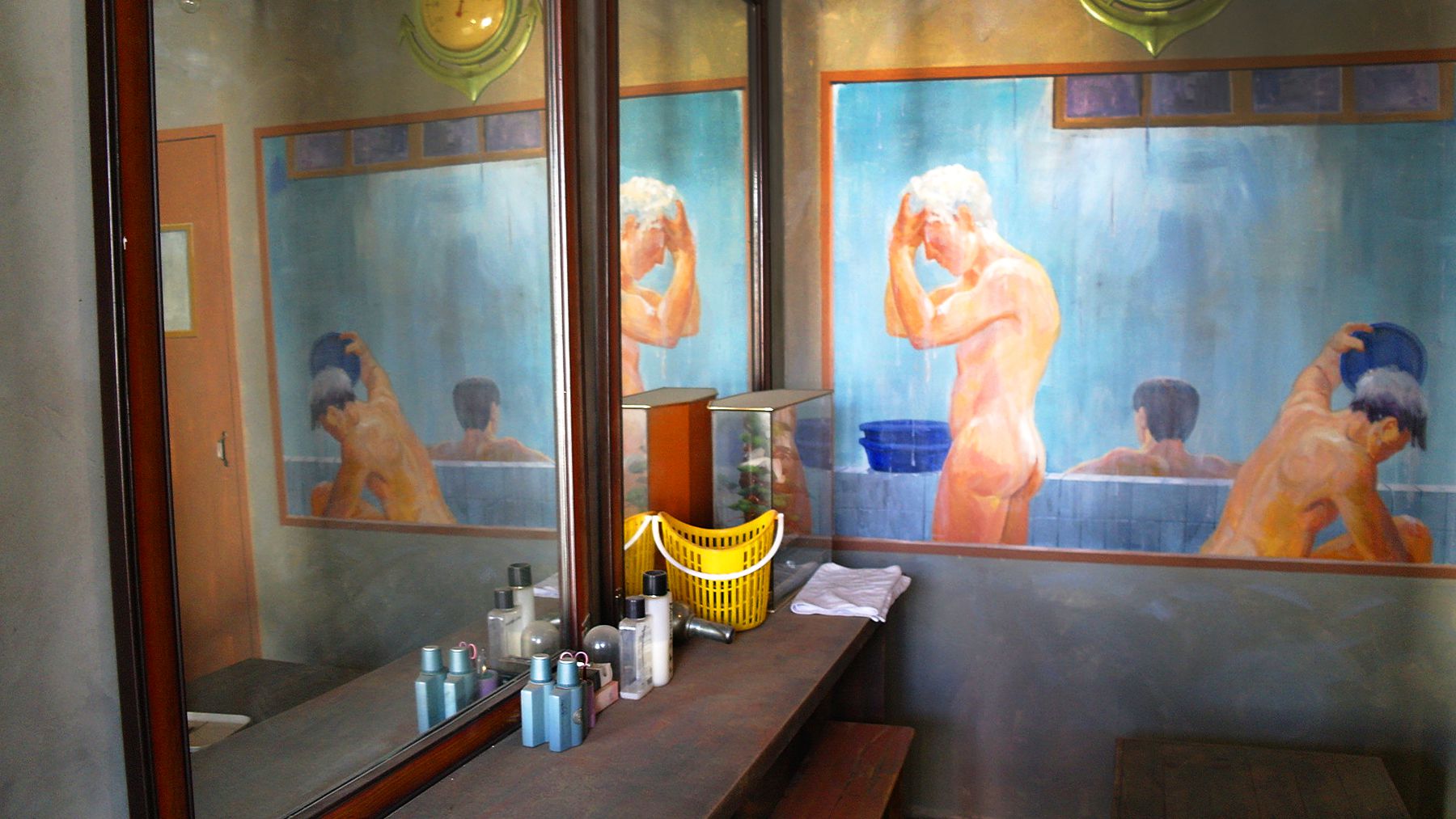 지금 막 들어온 듯한 남자분이 로커 앞에 서 있고, 안에서 목욕을 즐기는 사람들의 모습이