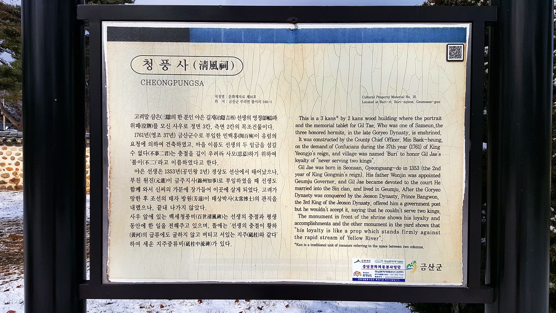 충청남도 금산군 부리면에 위치한 청풍서원은 1678년에 지방 유림의 공의로 길재의 청절을