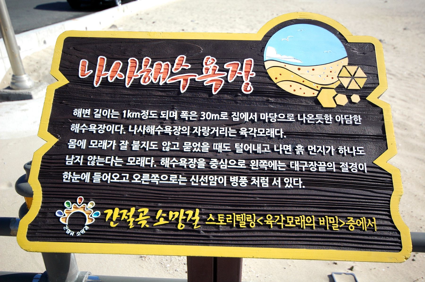 무엇보다 나사해수욕장의 백미는 지명에서 알 수 있듯이 바로 고운 모래입니다. 안내판에 따르면 육각 결정의 모래라고 하는데요.