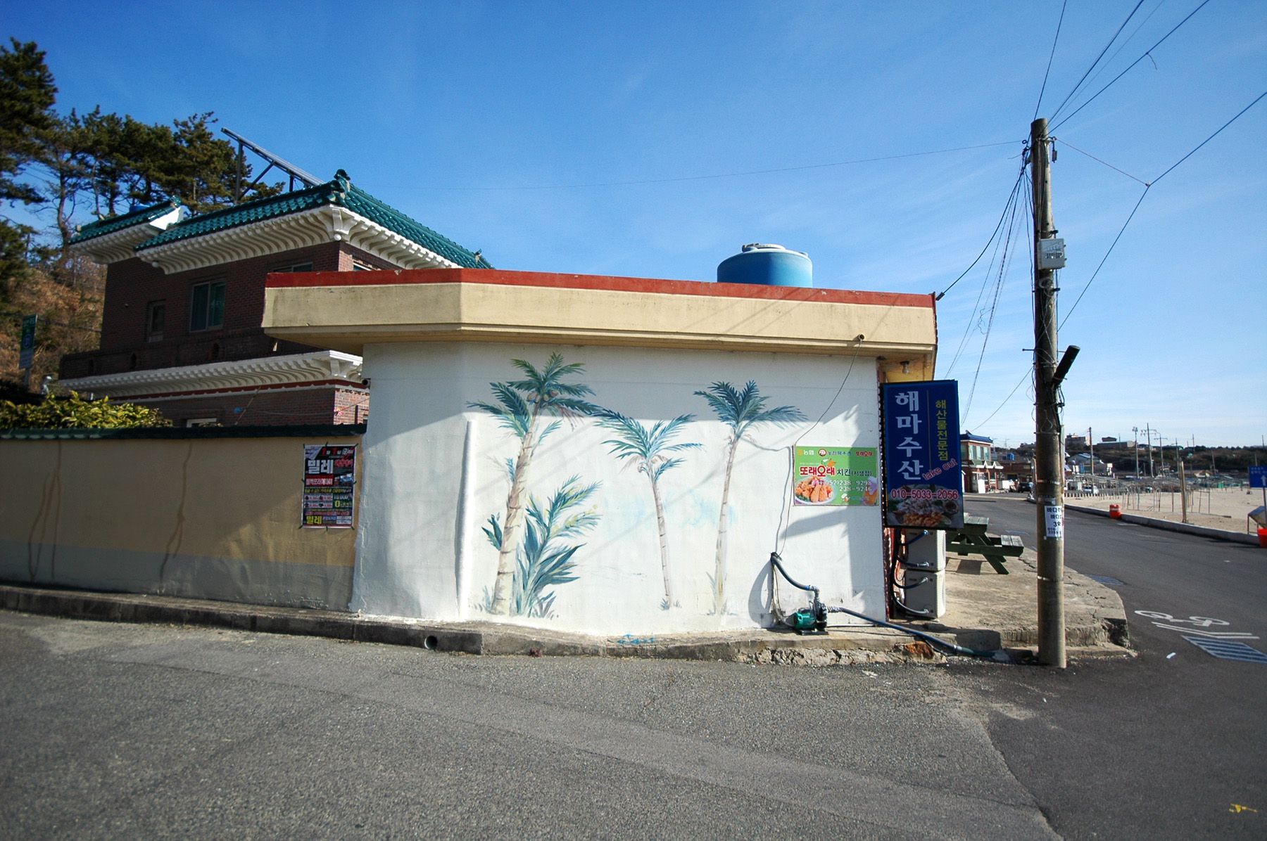 마을 앞 도로에서는 눈앞에 바다가 아름답게 펼쳐집니다.