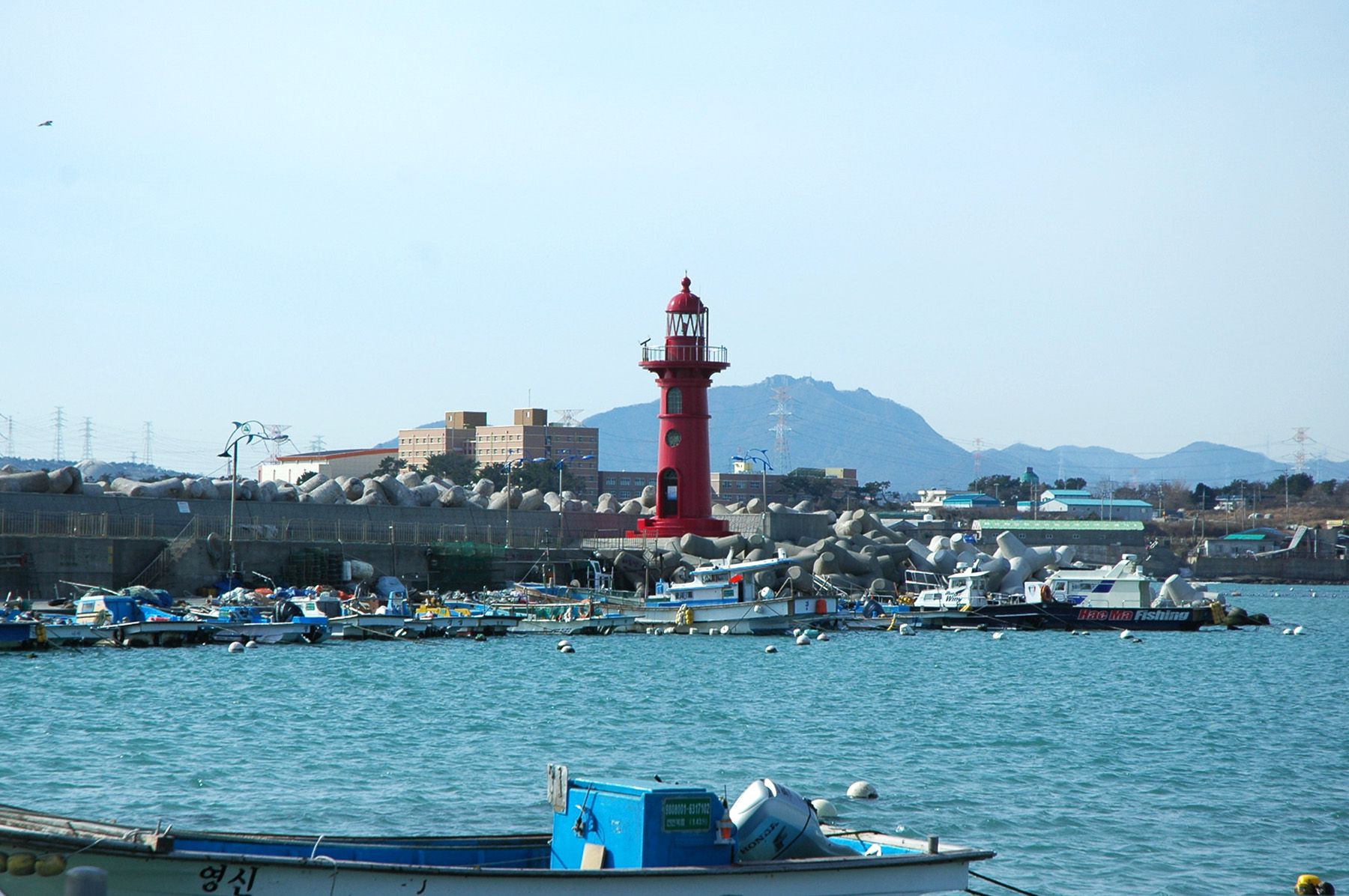 파란색 등대가 있는 방파제에서는 빨간색 등대가 하나 더 있습니다.