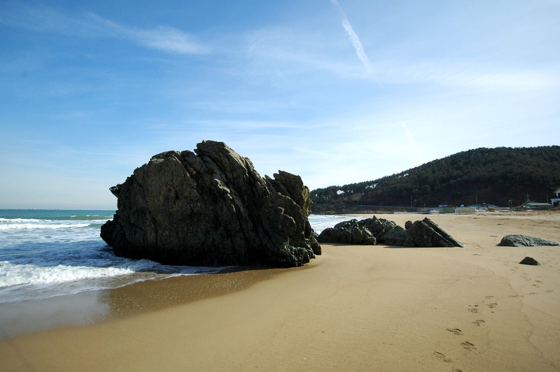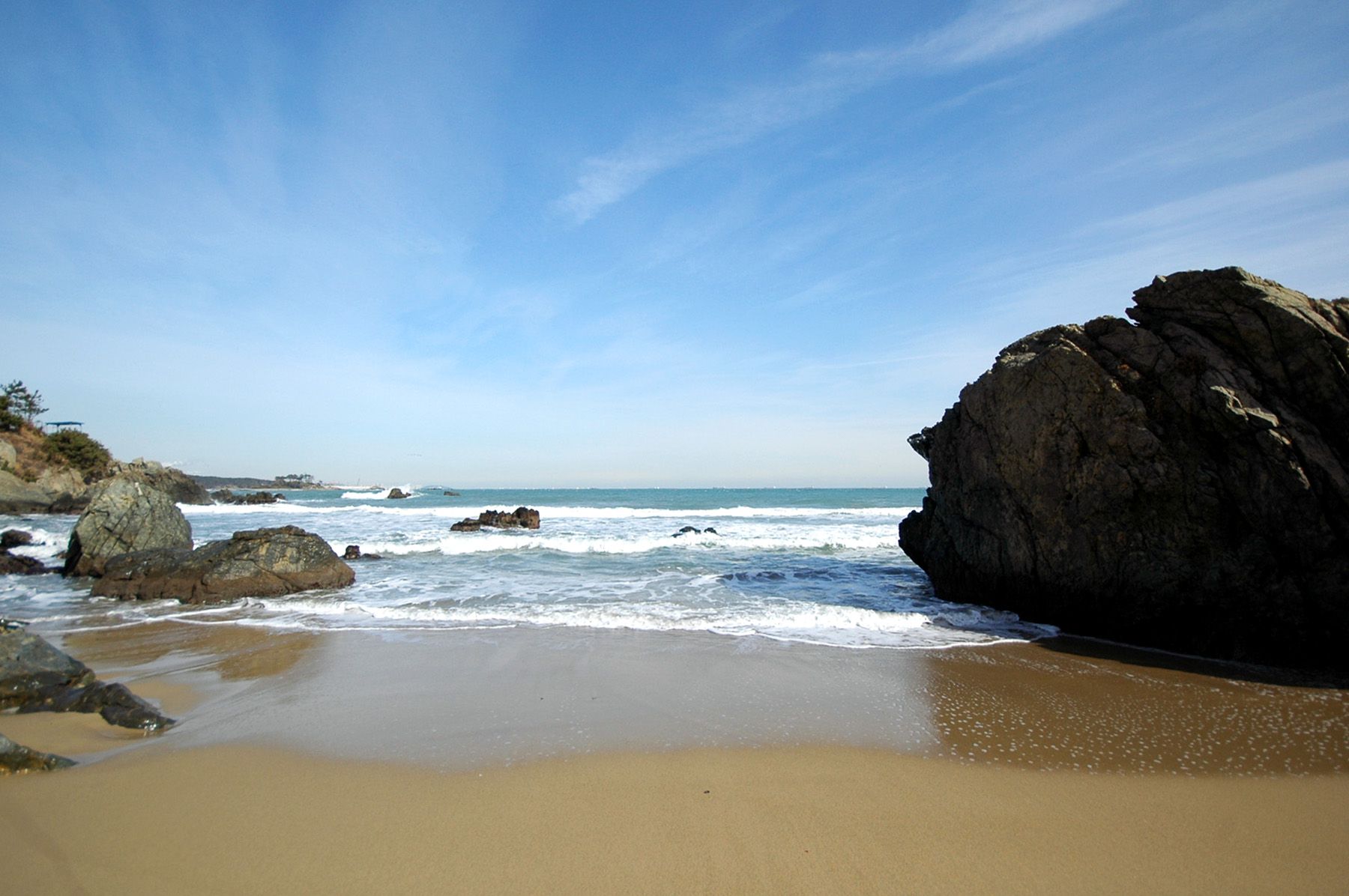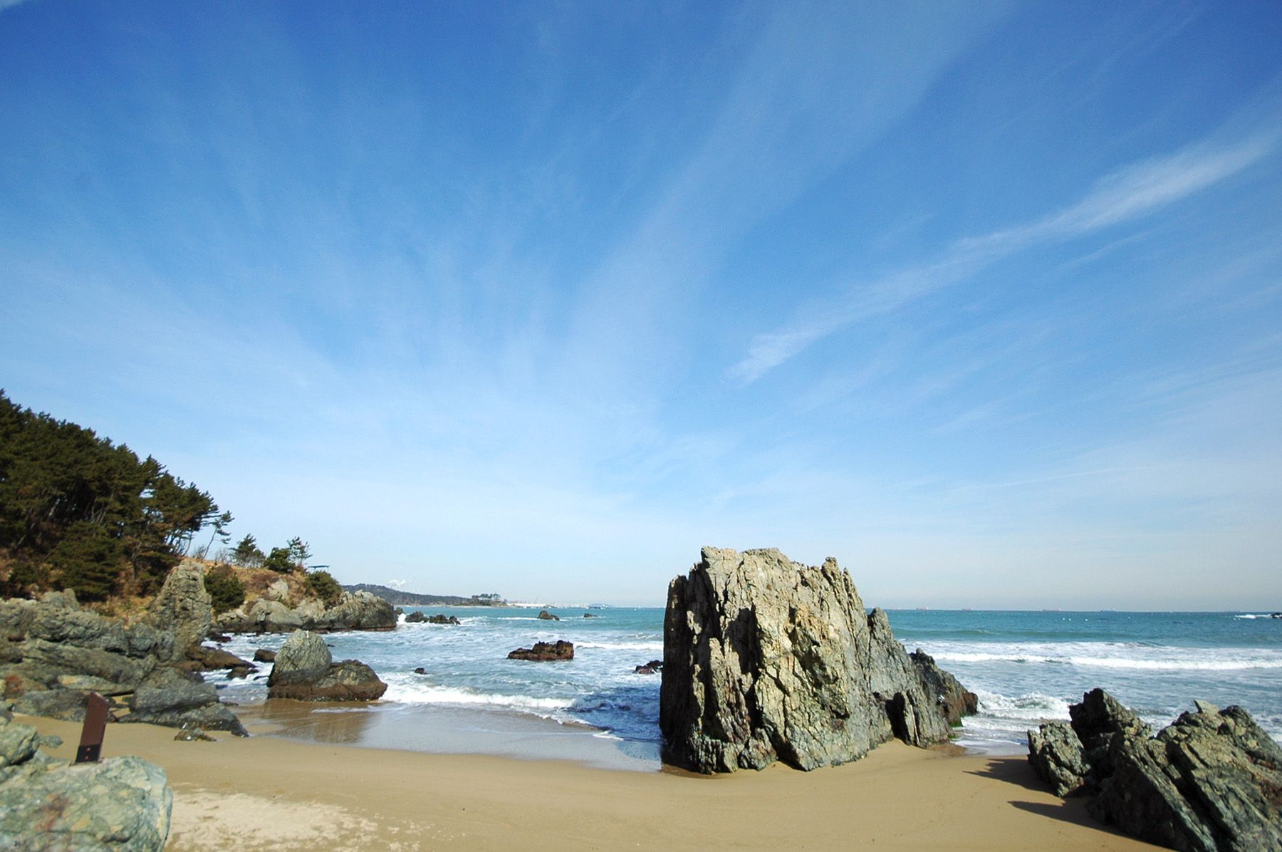 커다란 바위와 푸른 바다, 넓게 펼쳐진 모래사장!