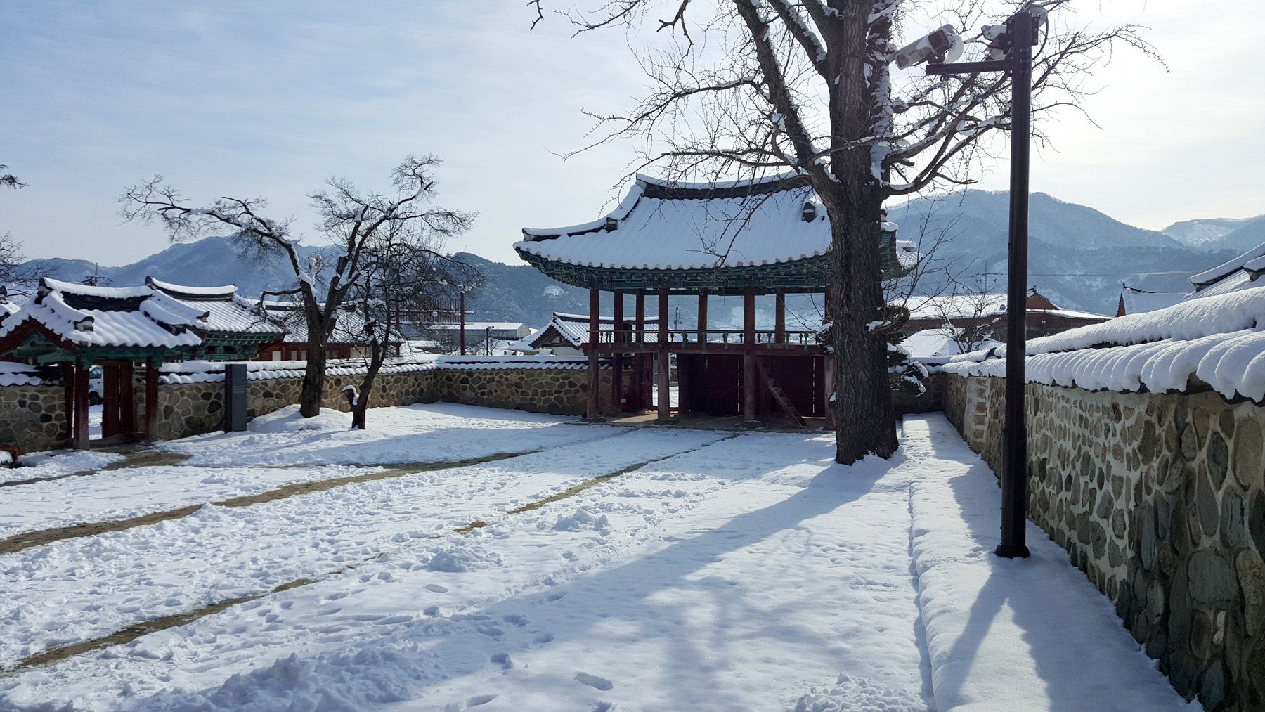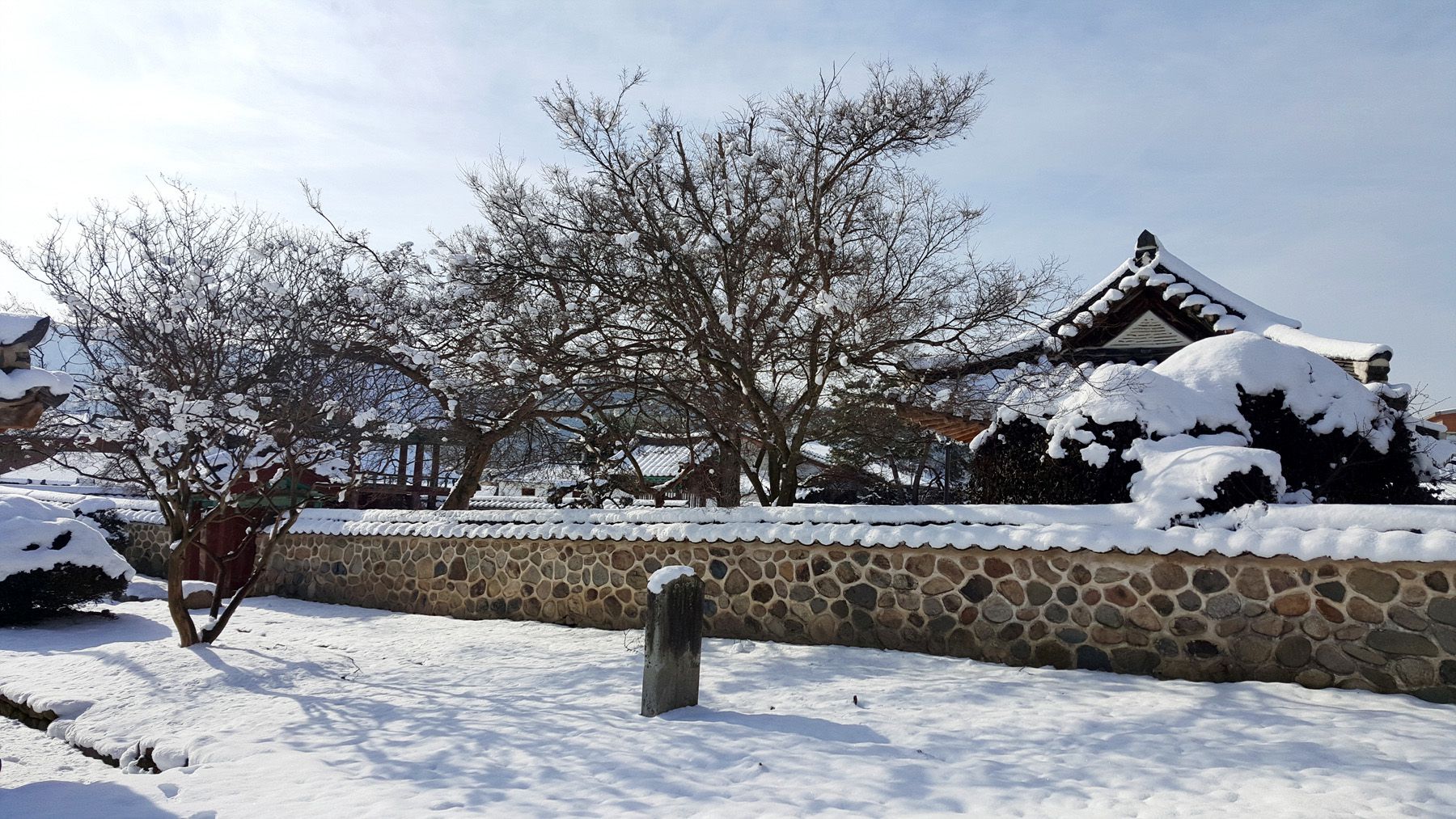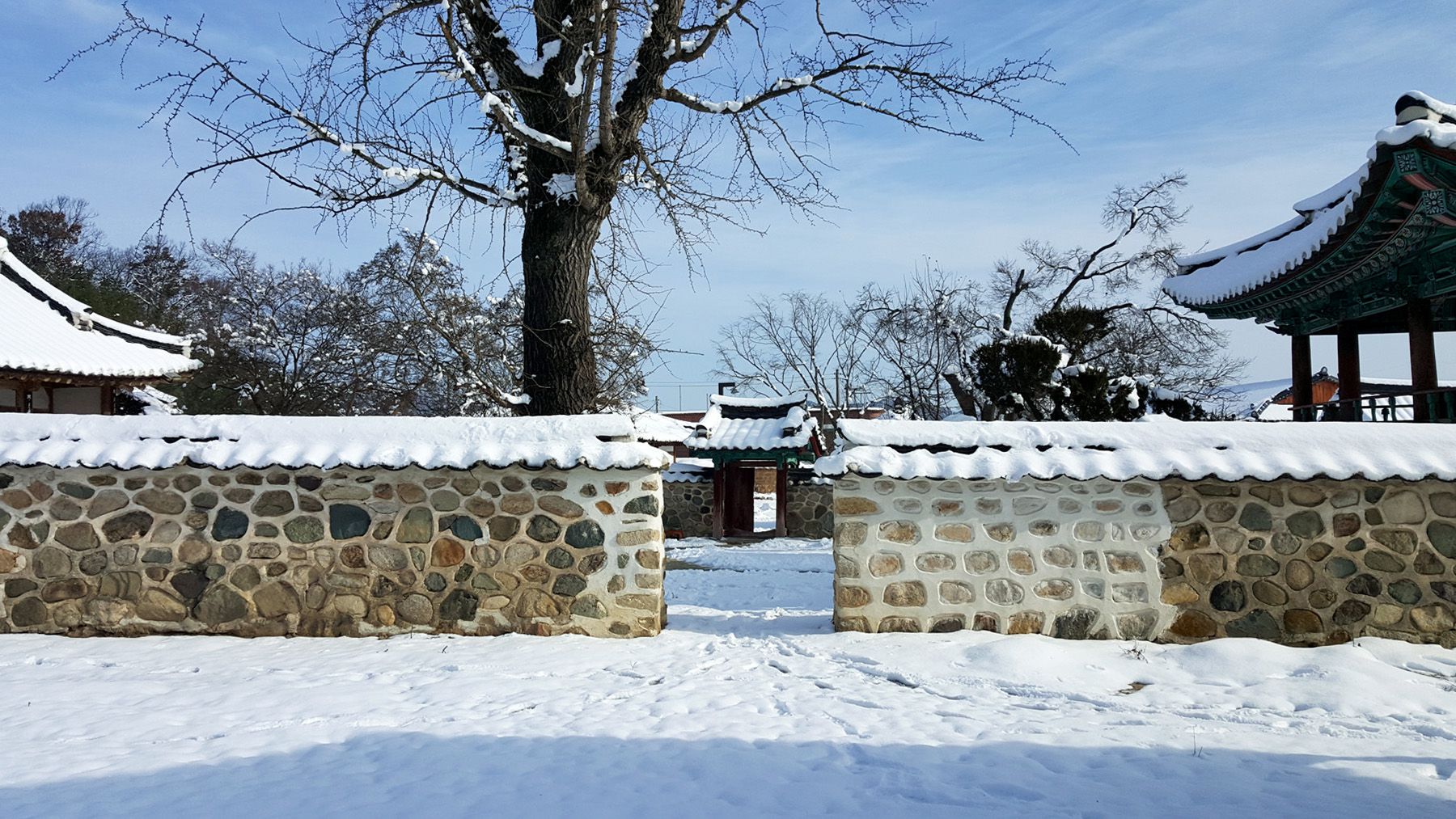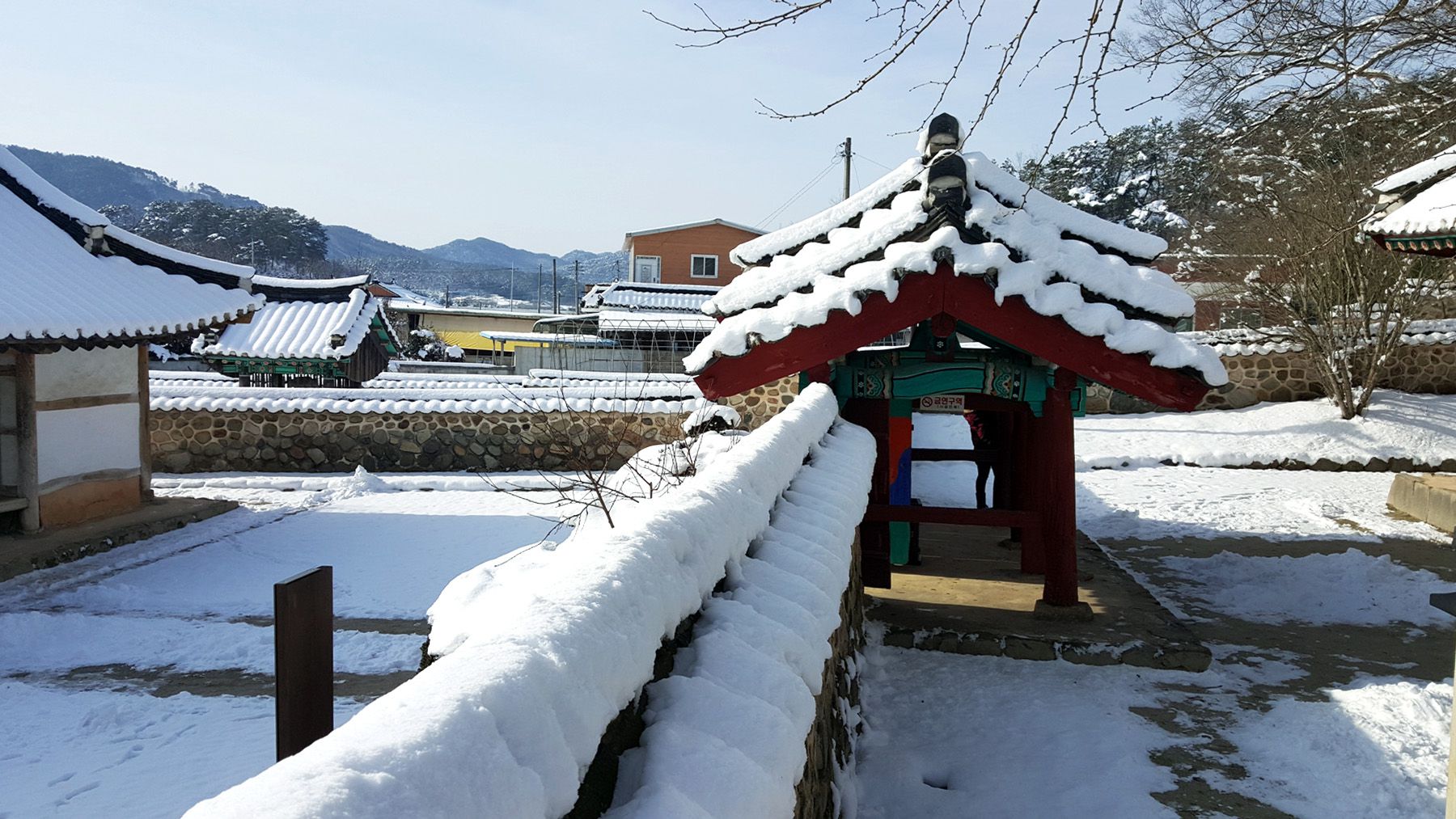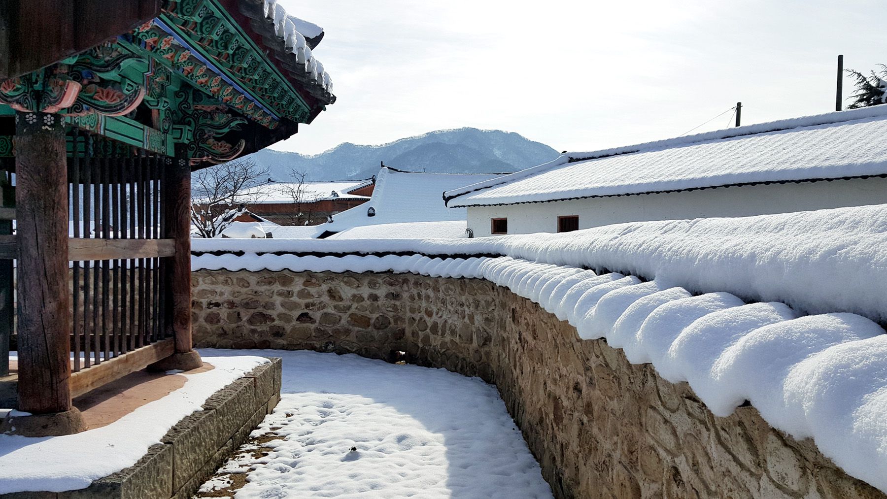 기와마다 눈이 쌓여 있는 모습이 평온한 느낌마저 들게 하여