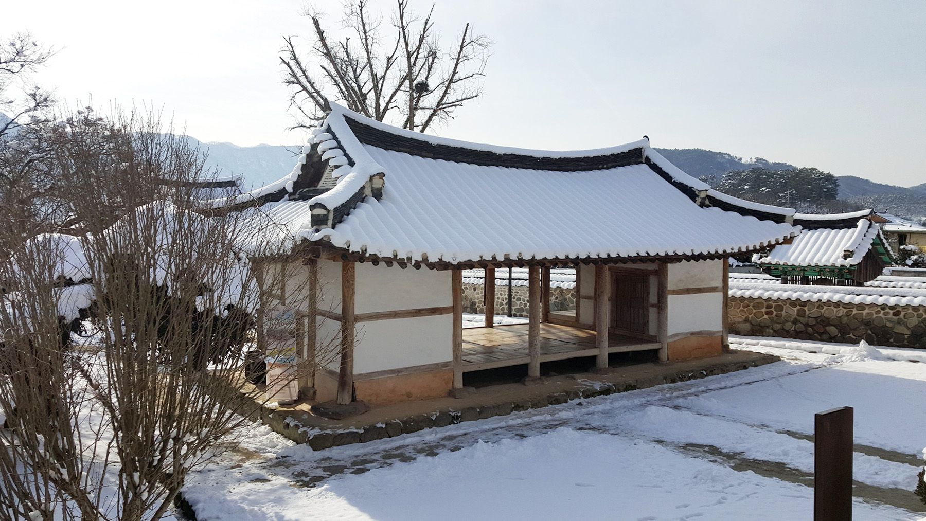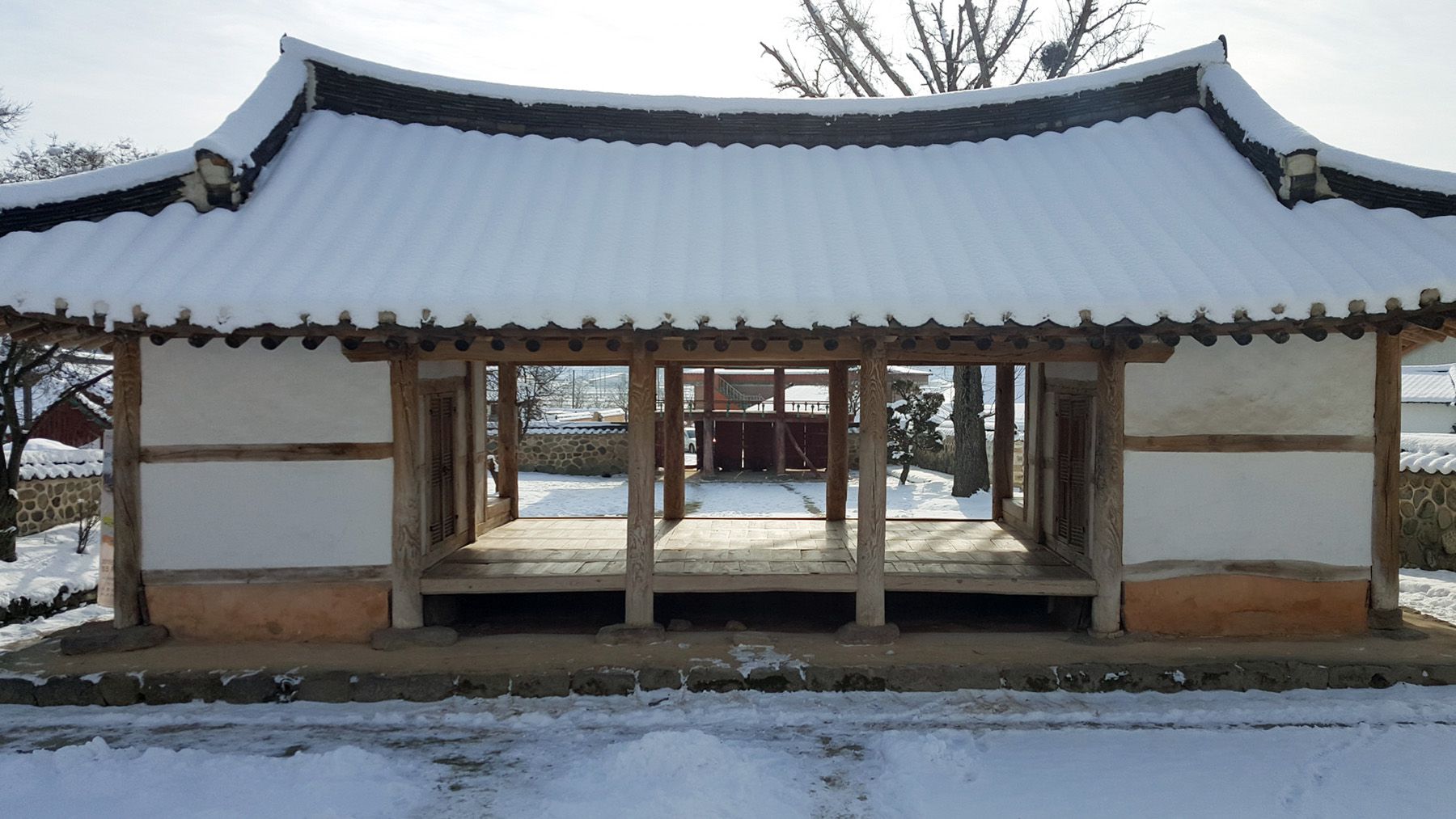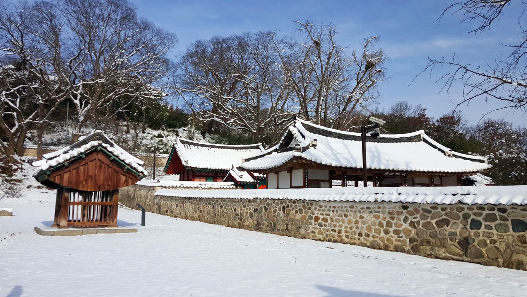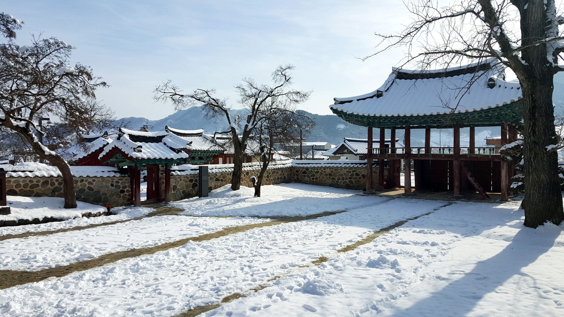 기와마다 눈이 쌓여 있는 모습이 평온한 느낌마저 들게 하여