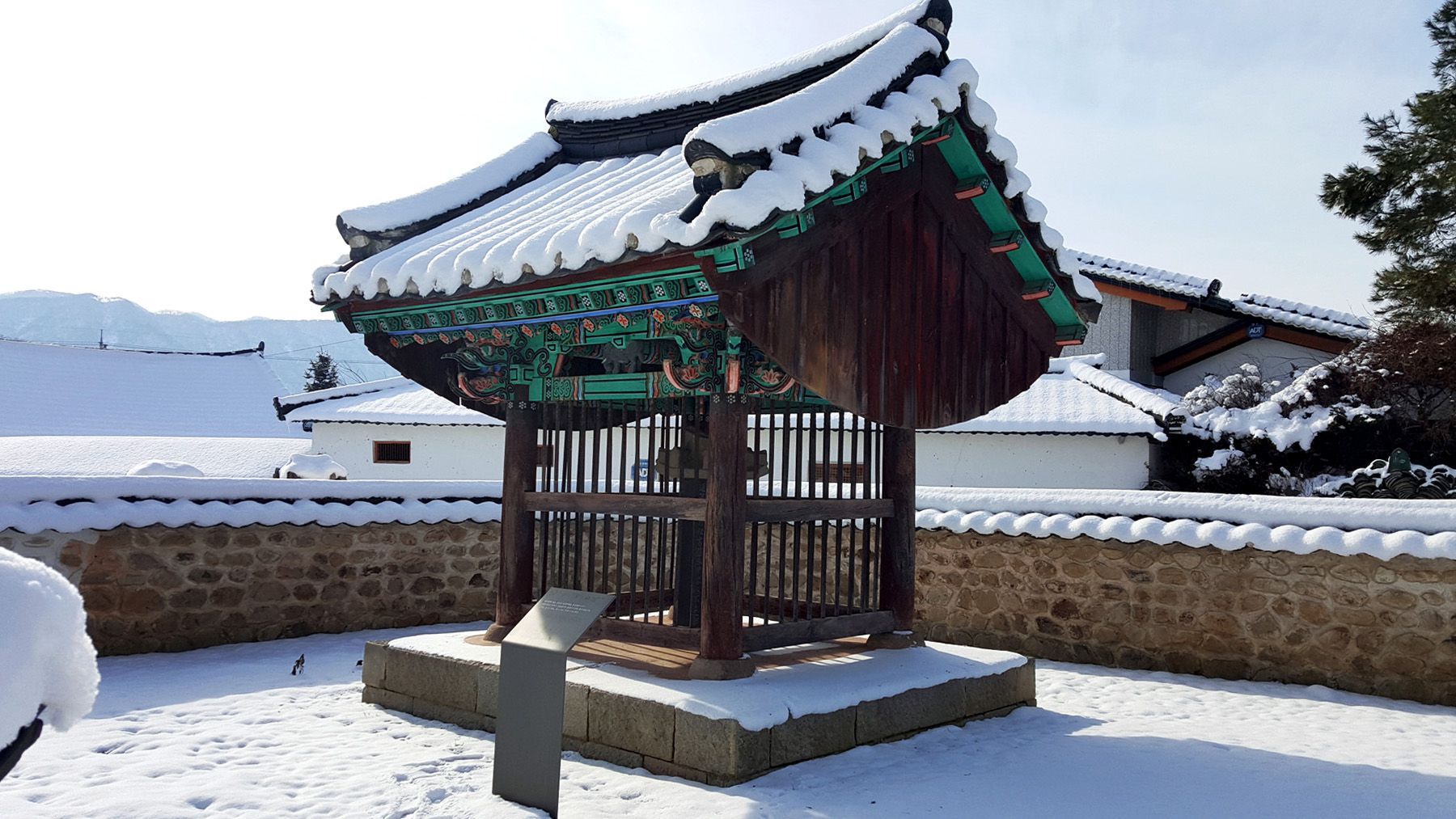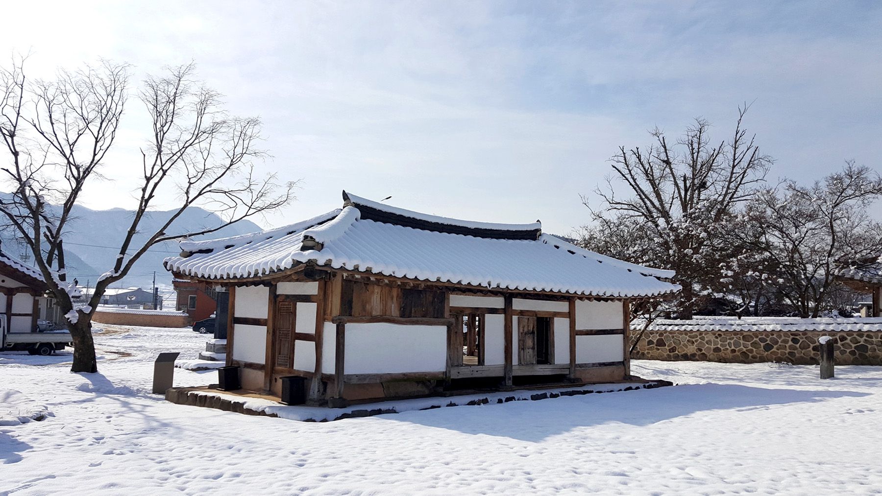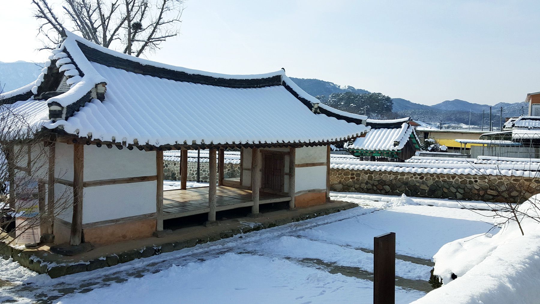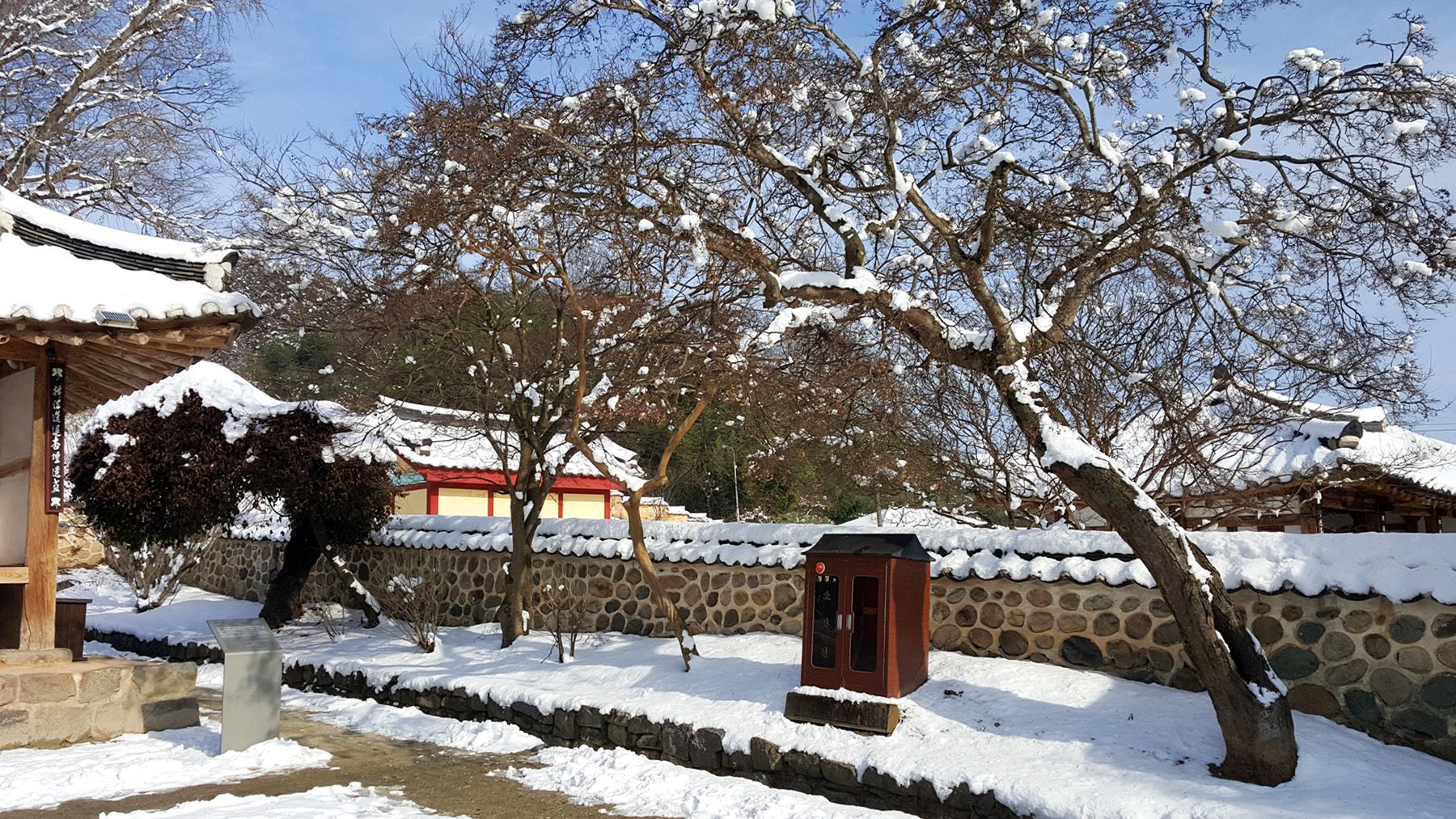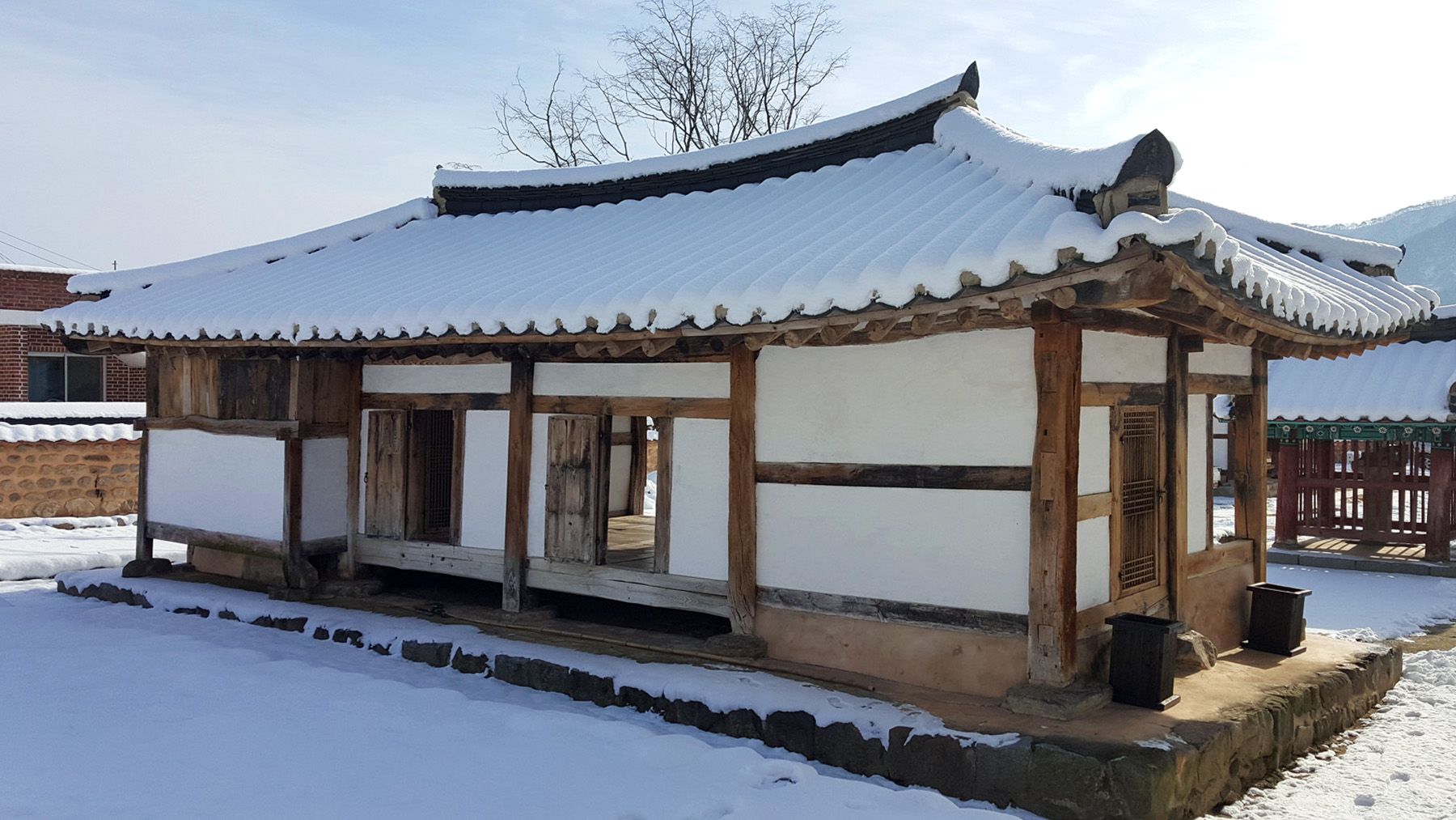 기와마다 눈이 쌓여 있는 모습이 평온한 느낌마저 들게 하여