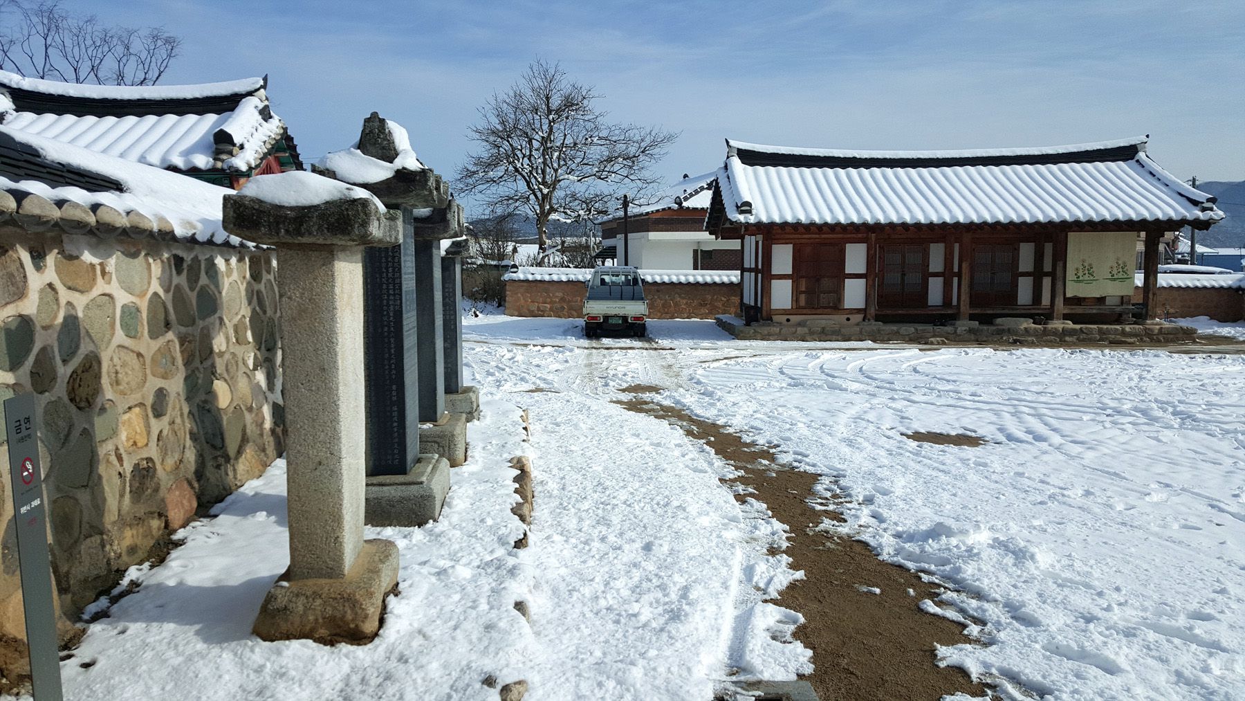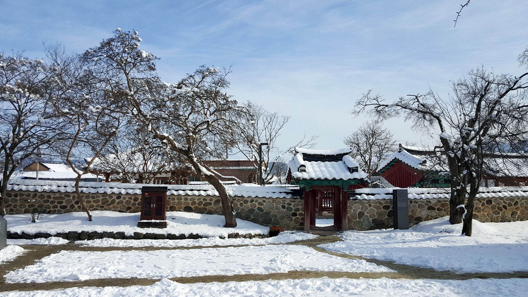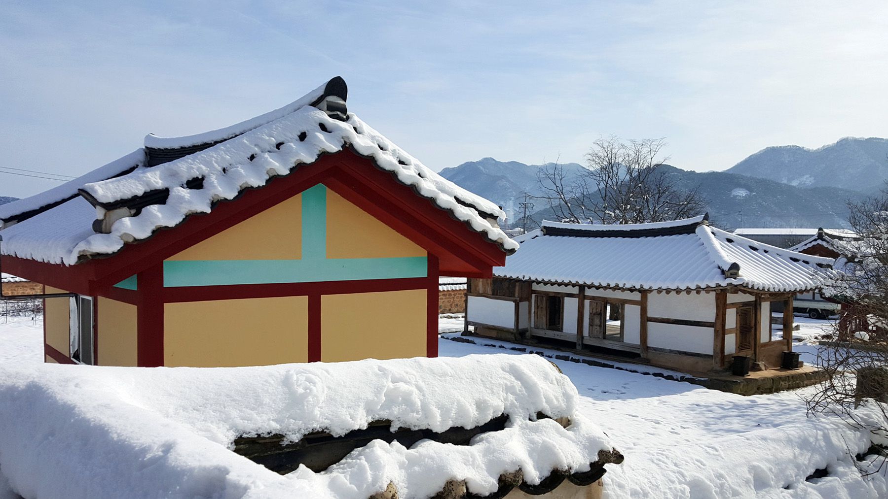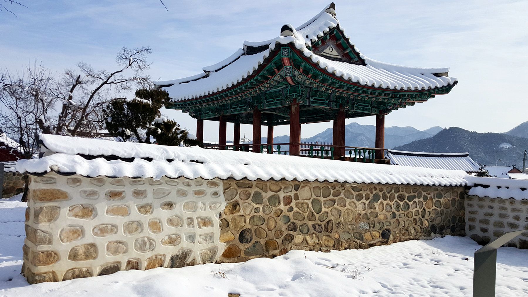 기와마다 눈이 쌓여 있는 모습이 평온한 느낌마저 들게 하여