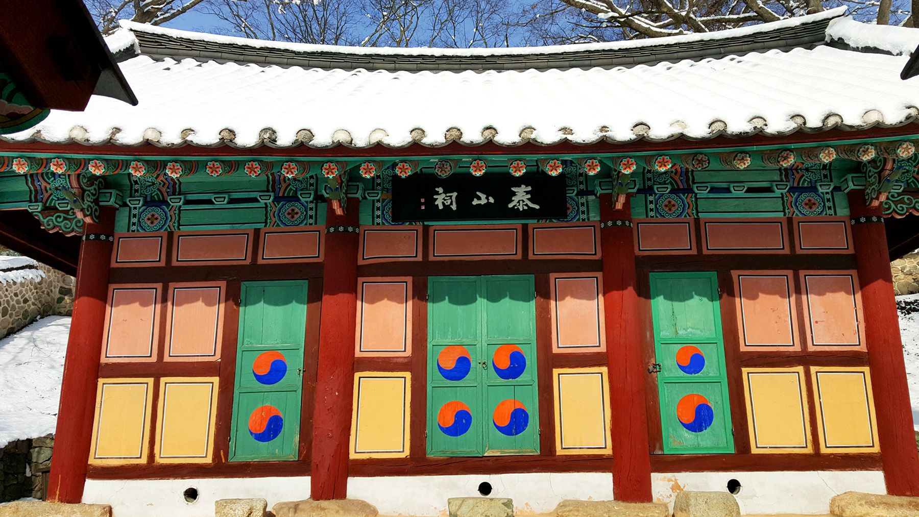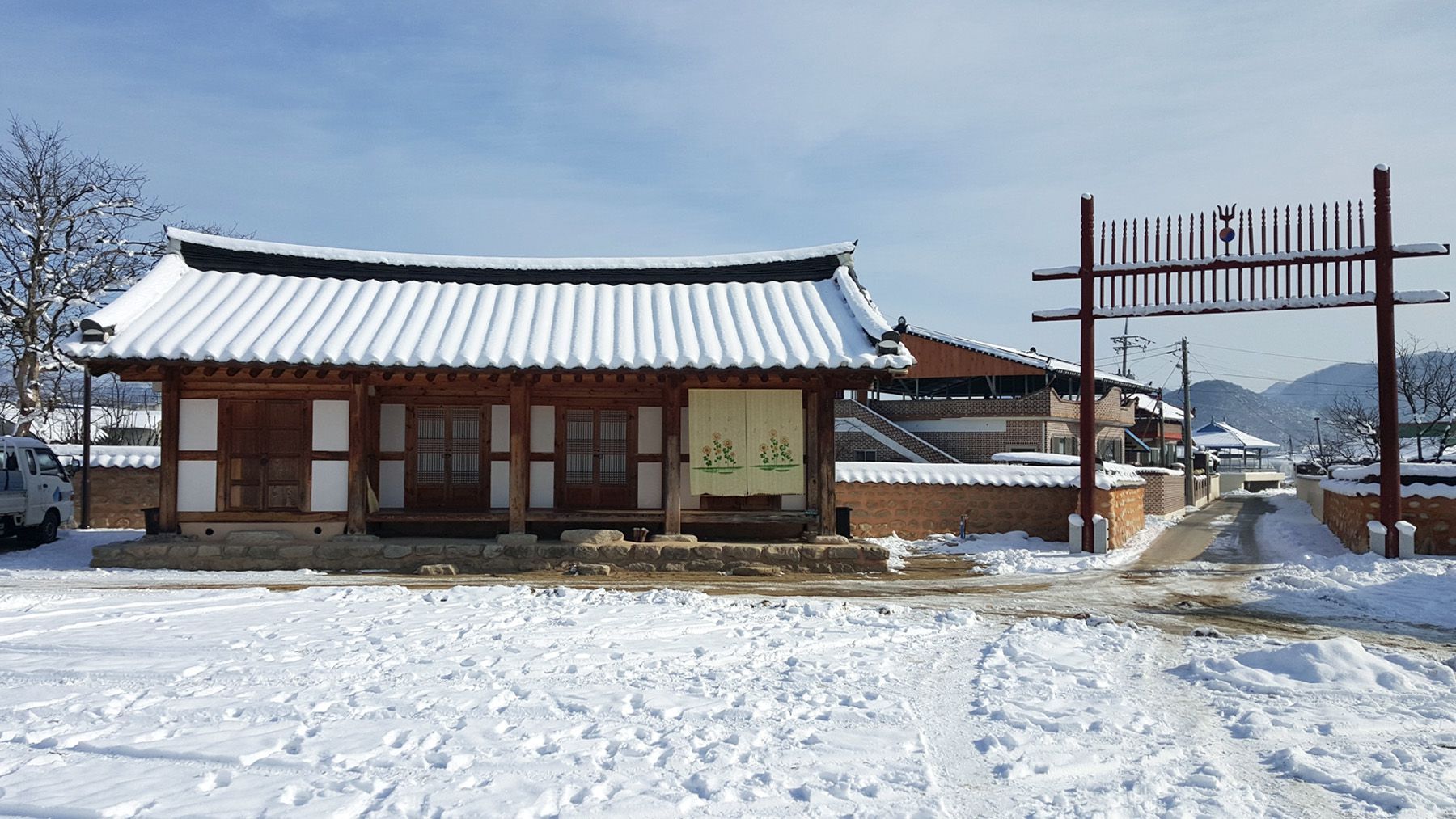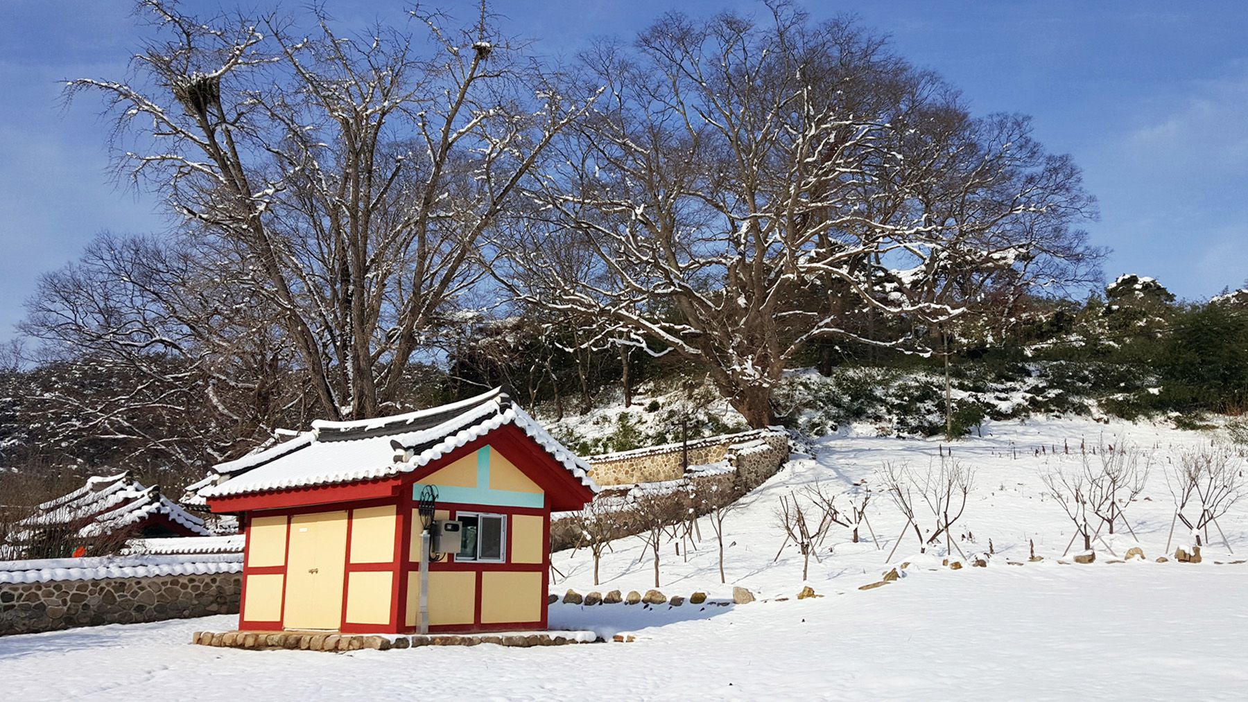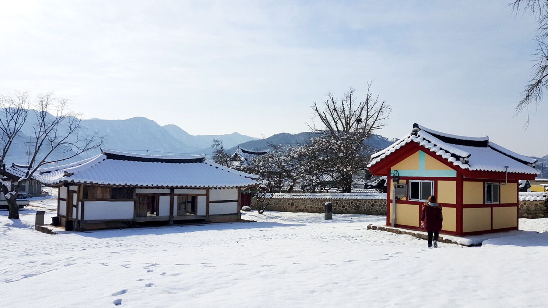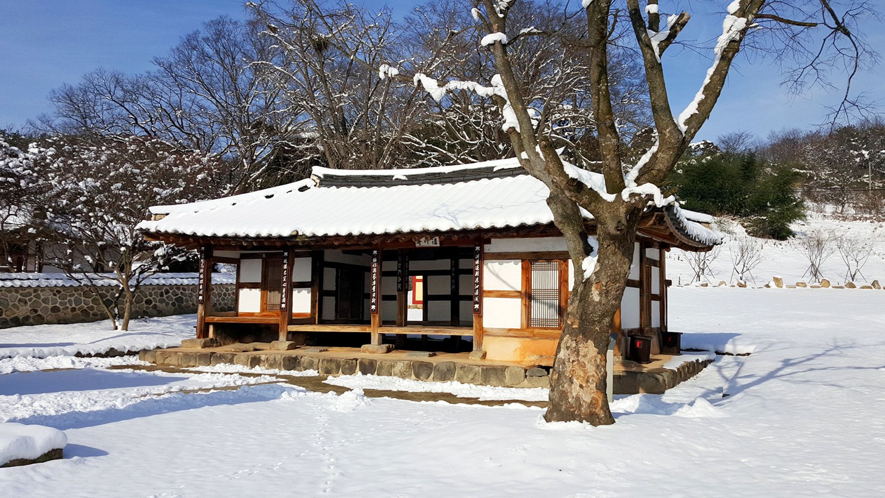 기와마다 눈이 쌓여 있는 모습이 평온한 느낌마저 들게 하여