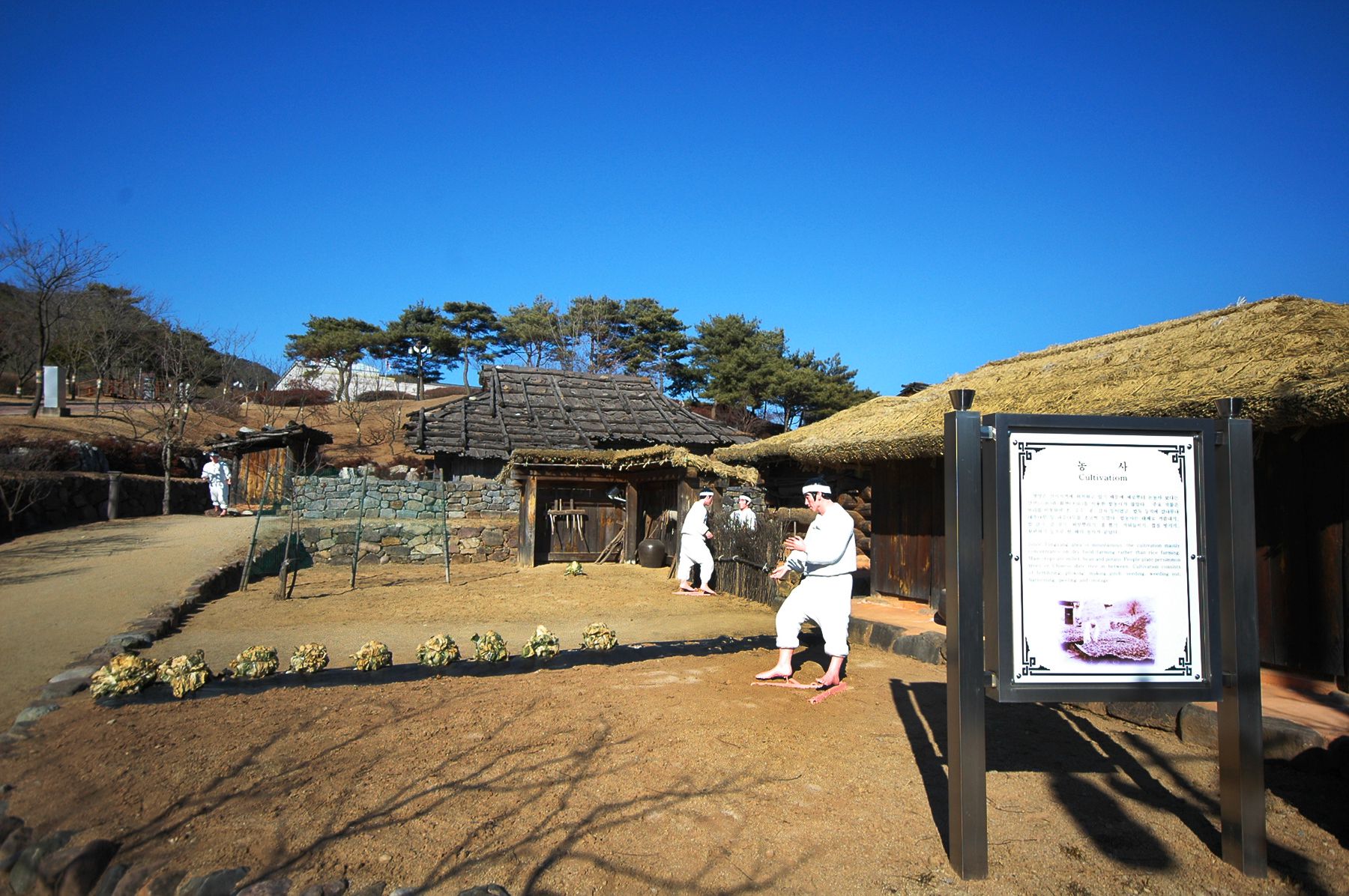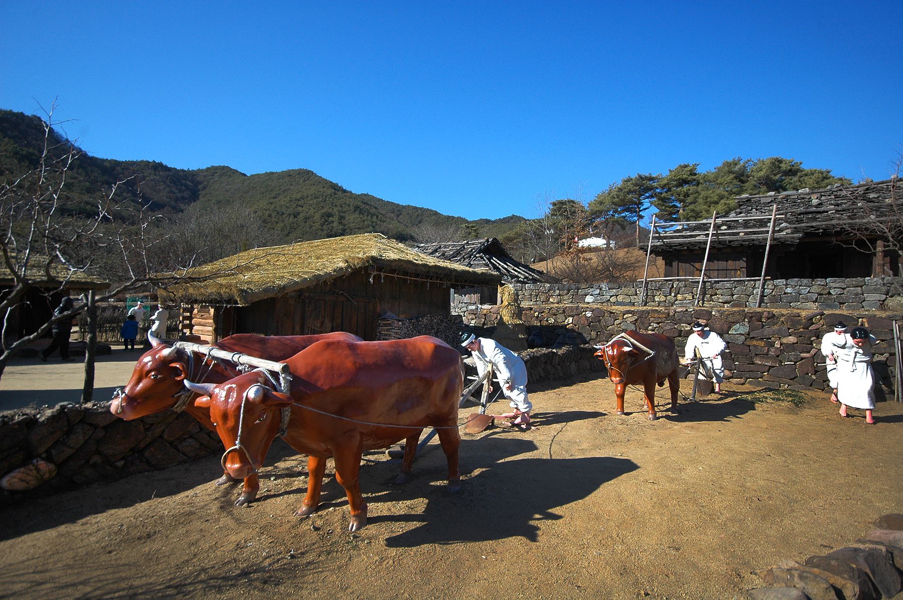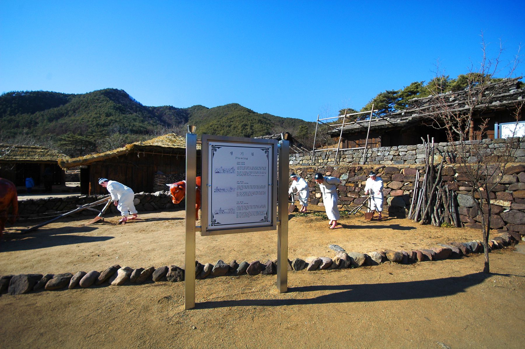 산촌의 농사 체험 코너에서는 인걸이 쟁기질, 호리 쟁기질, 겨리 쟁기질 등을 이용한 밭갈이와