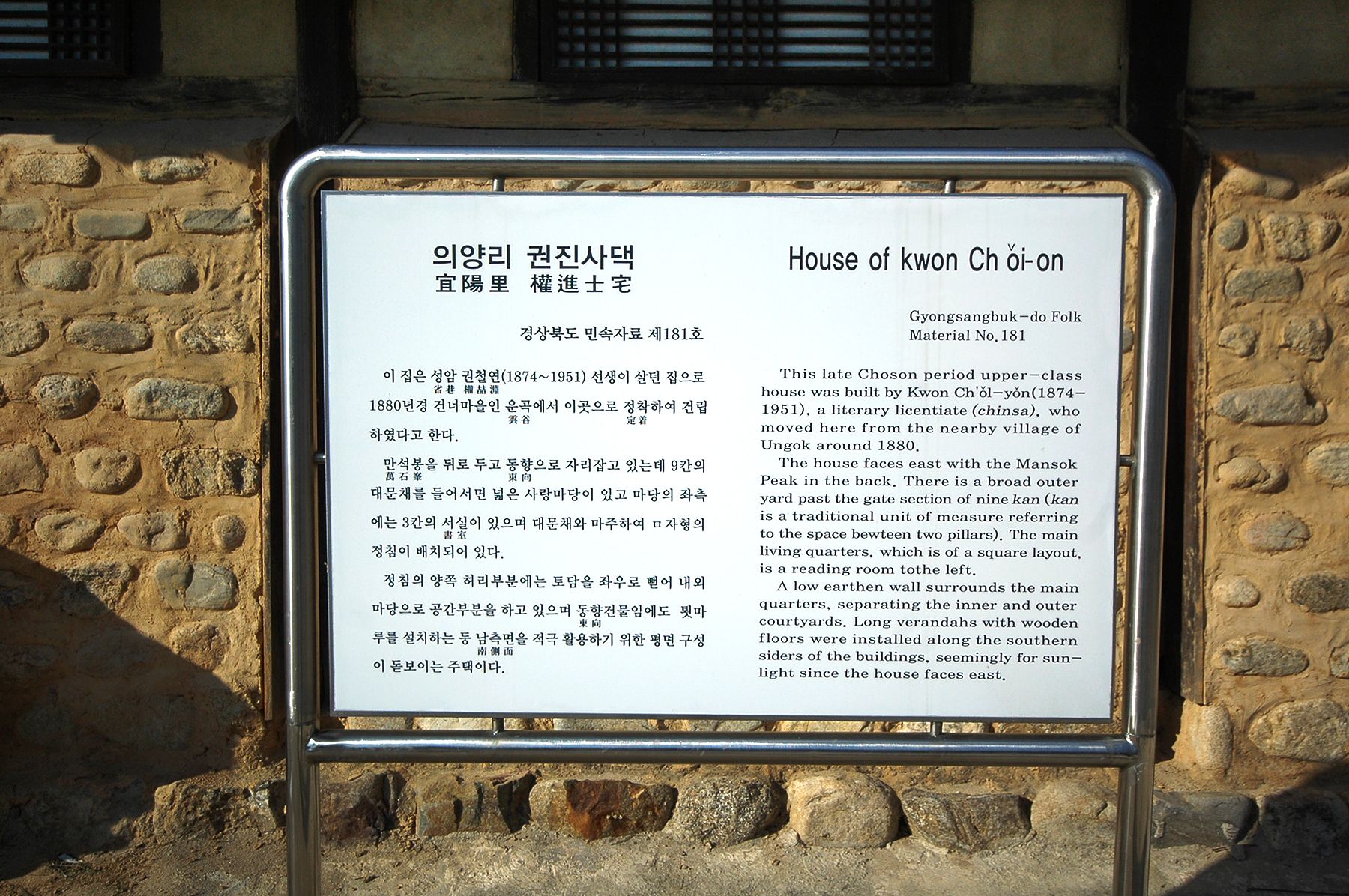 문화재자료 제190호에 지정되어 있는 조선시대 가옥입니다.