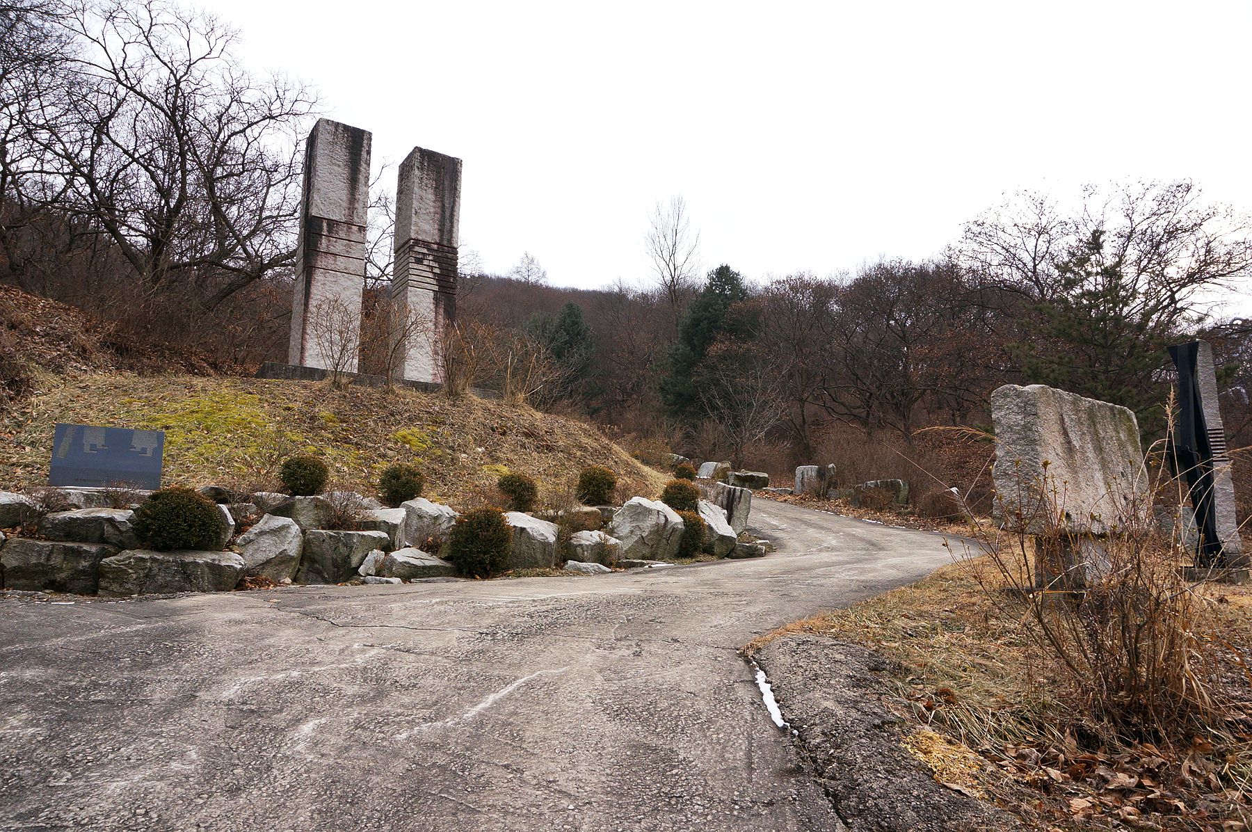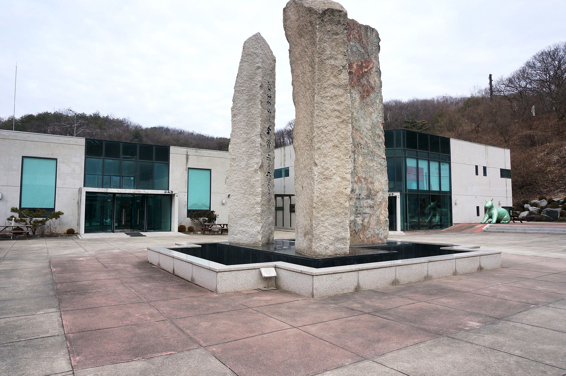김영원 교수의 '중력 무중력'이란 작품과 함께 보이는 한명섭 교수의 '만남' 작품이 돋보이는 야외공원입니다.