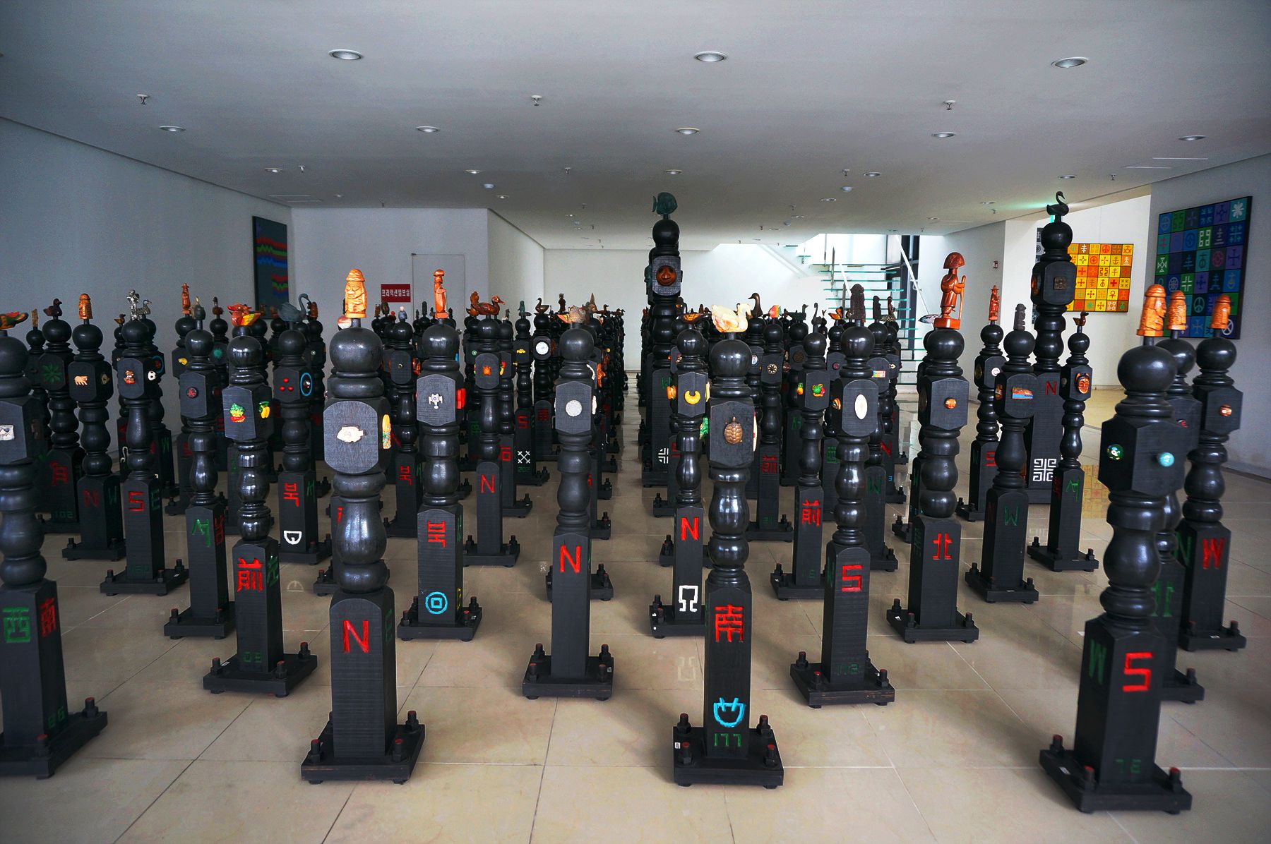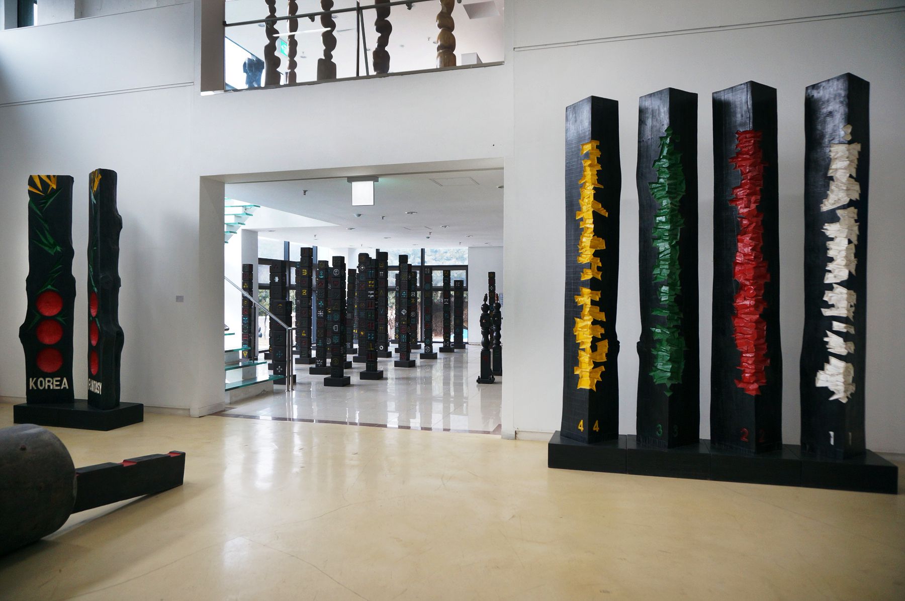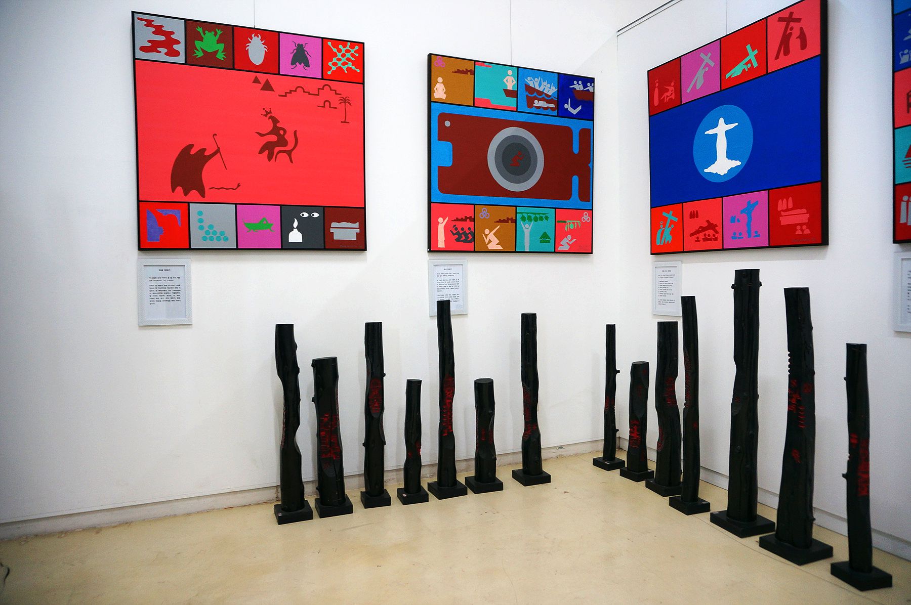 기둥에 표상으로 기능할 수 있는 각종 오브제를 부착한 조각들입니다.