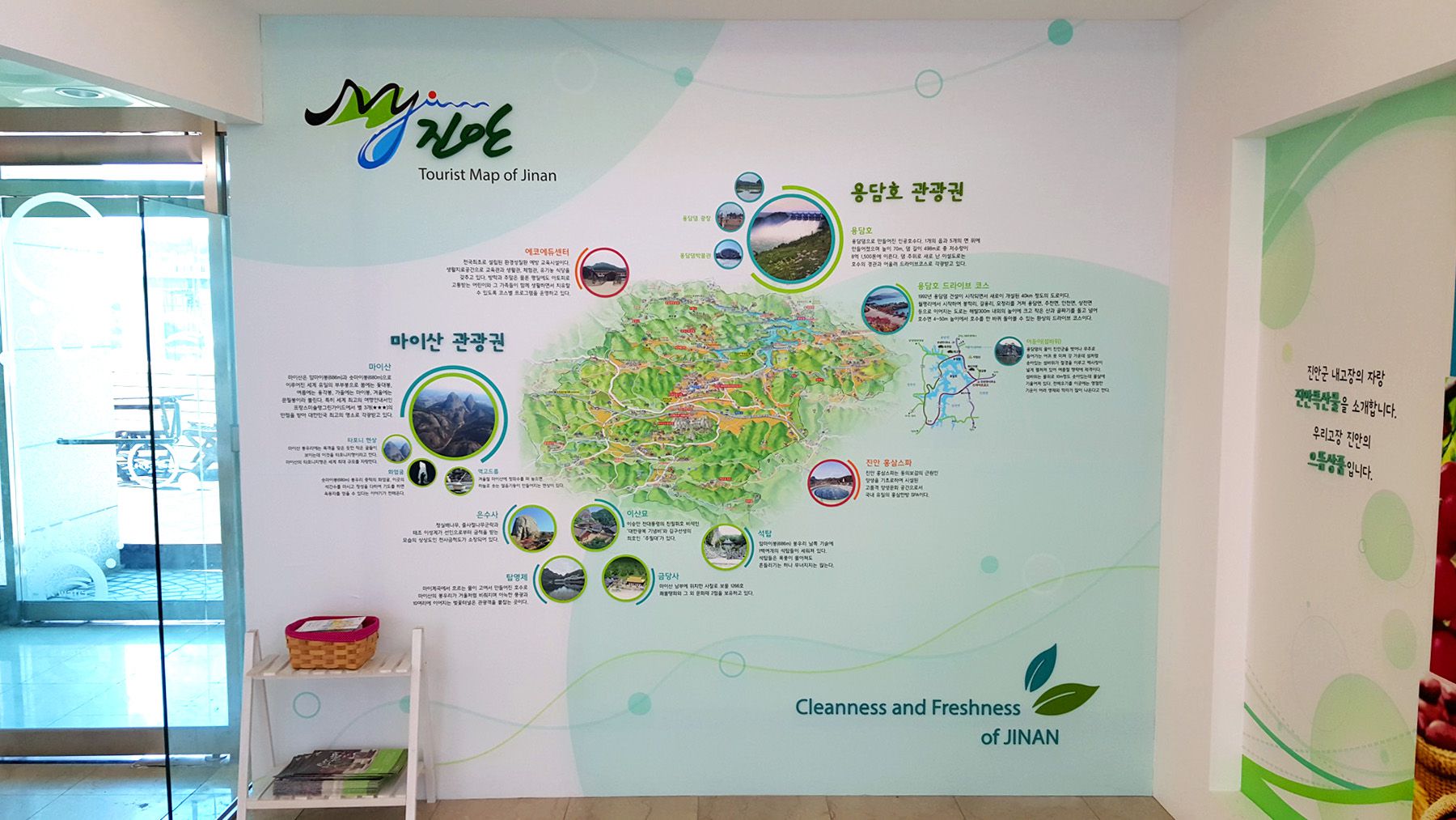 한쪽 벽에는 진안의 이모저모를 알 수 있는 관광지도가 그려져 있는데요,