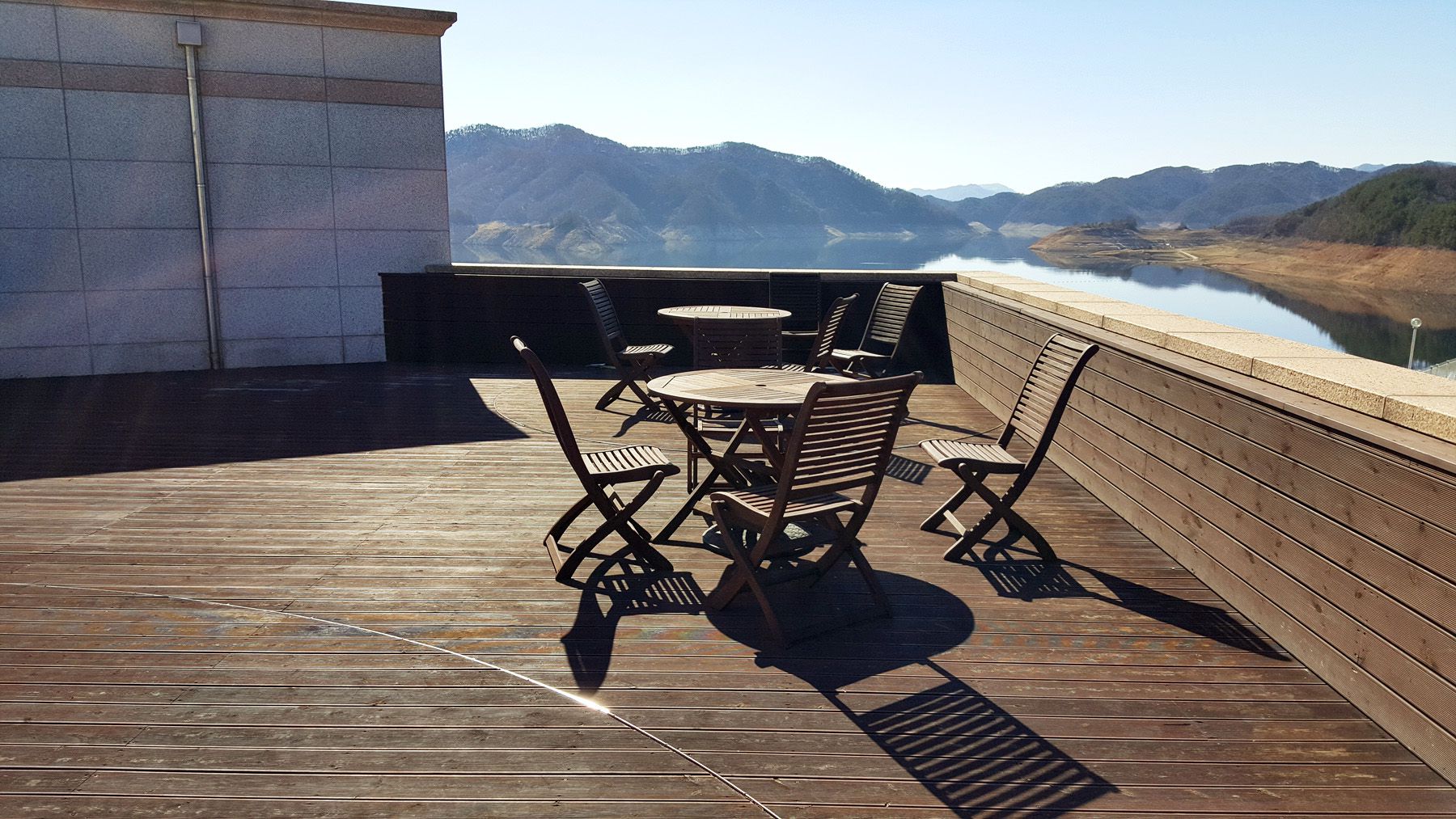 테라스로 나가면 거대한 용담호가 그림처럼 펼쳐지니
