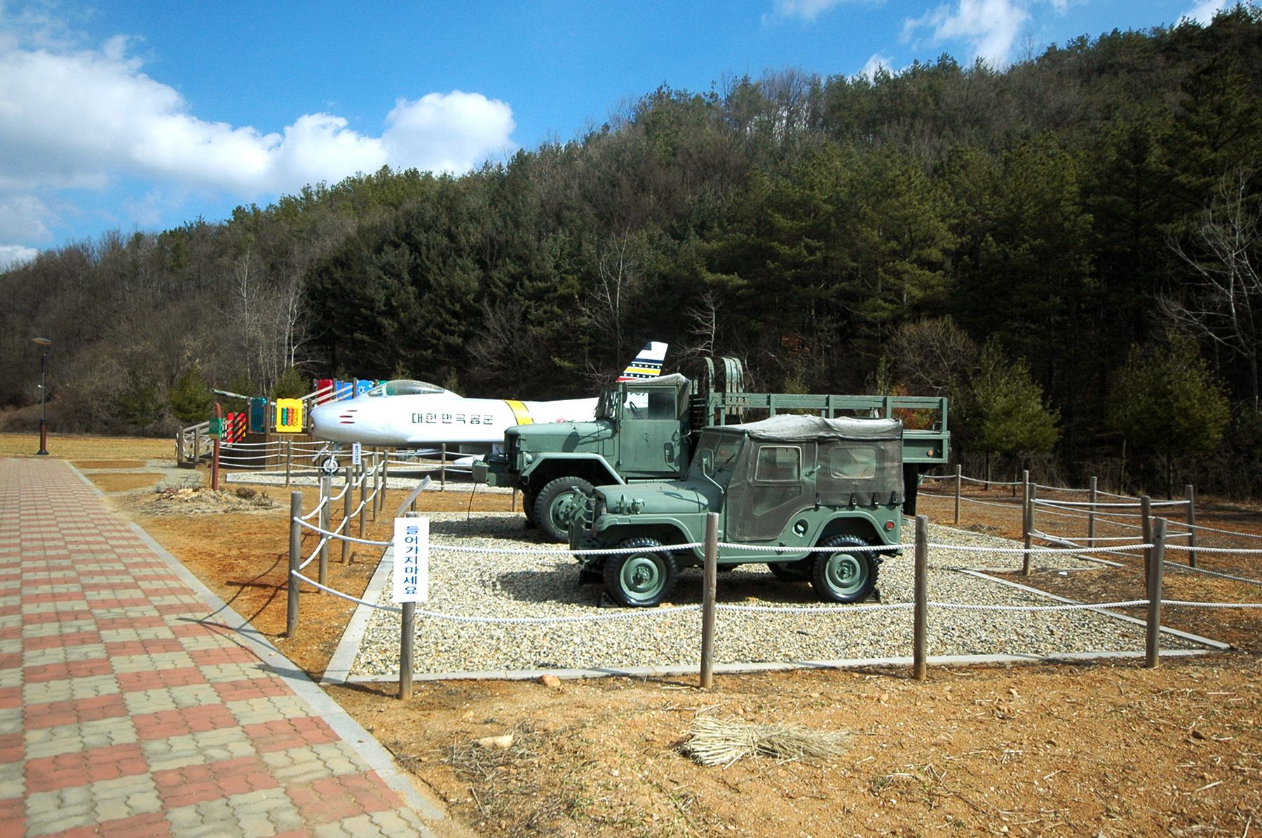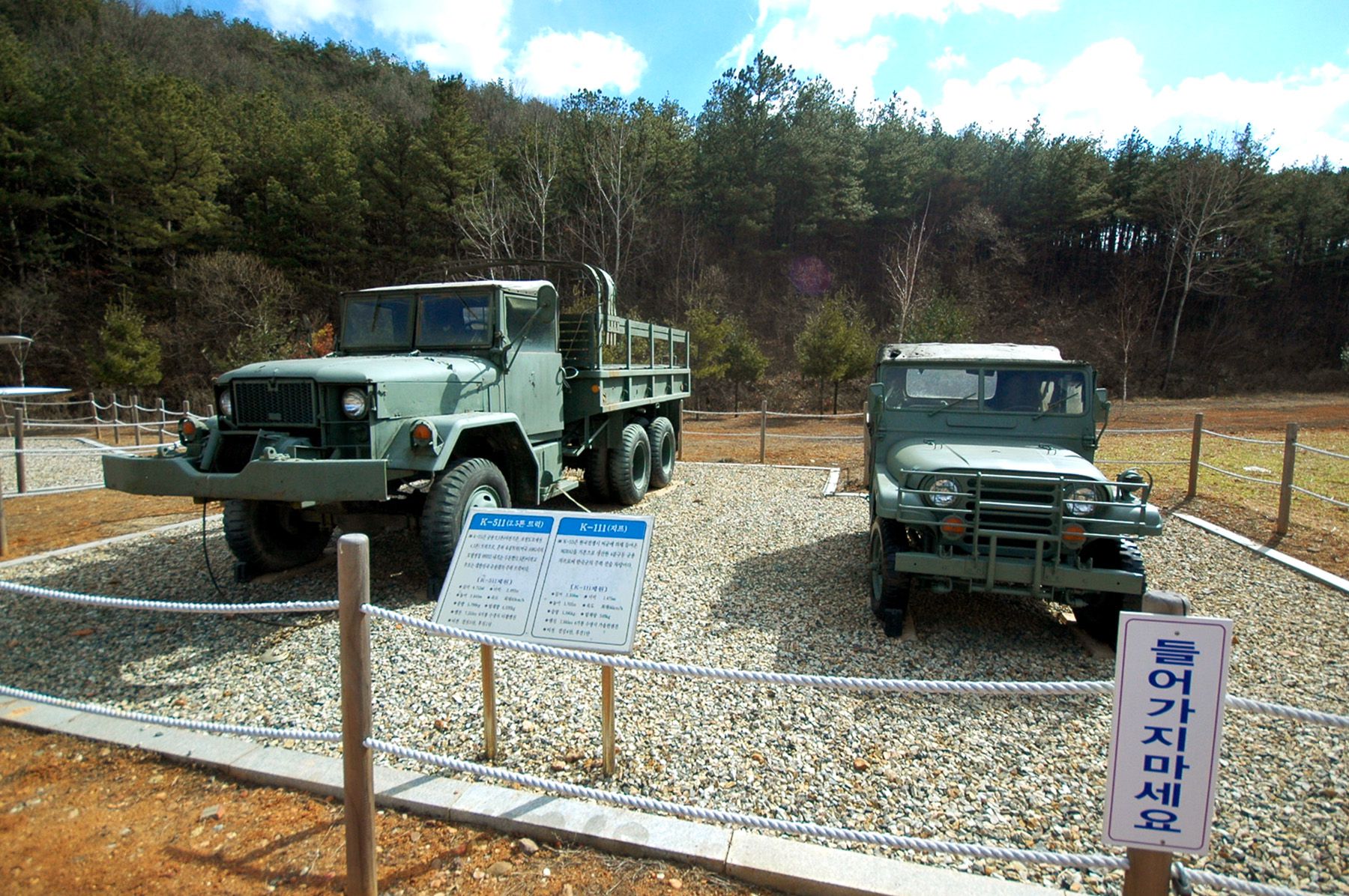 군용 트럭, 지프가 전시되어 있는 모습입니다.