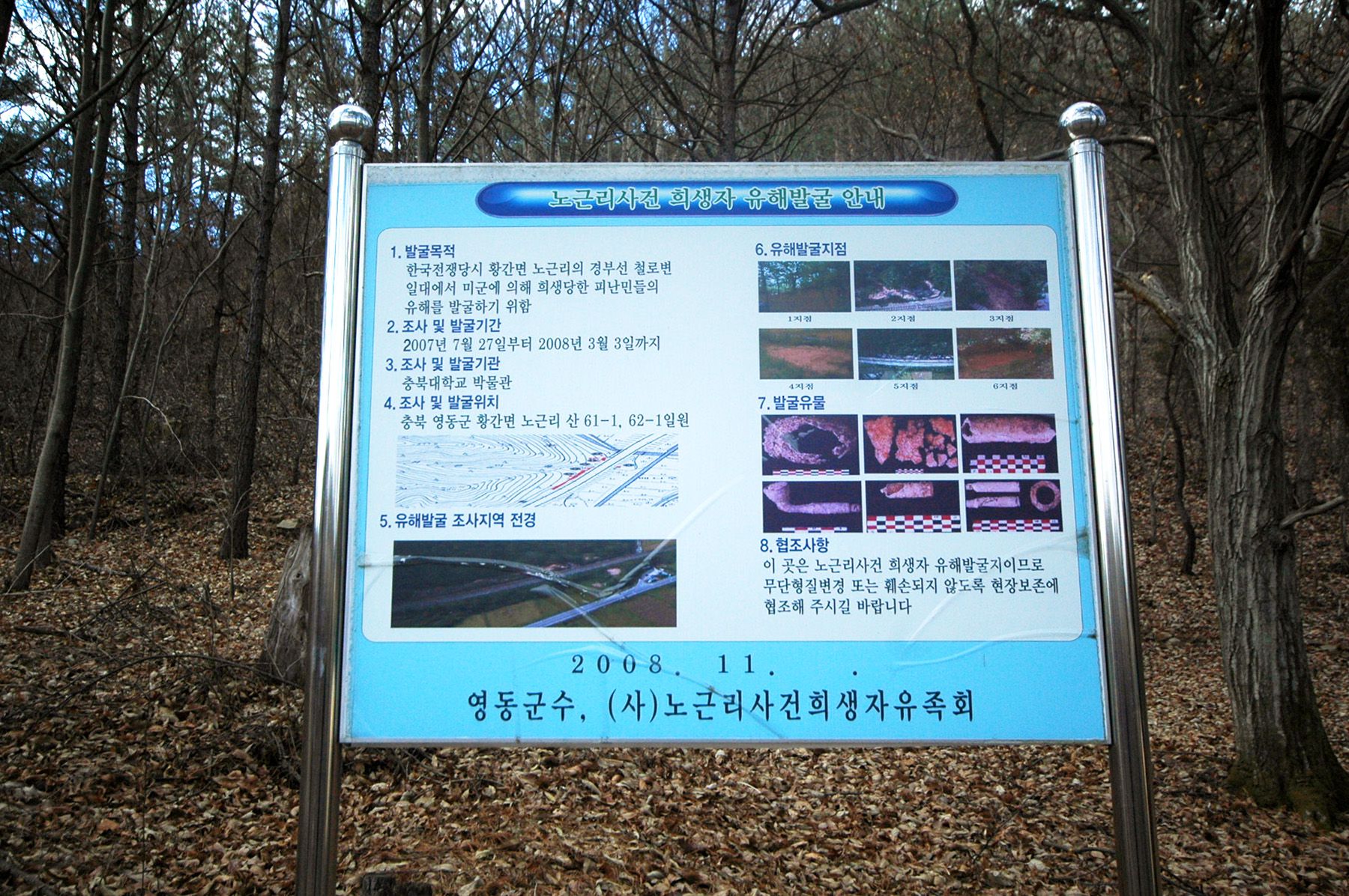 노근리 사건 현장 임시 분향소 및 희생자 유해발굴에 대한 안내판을 통해