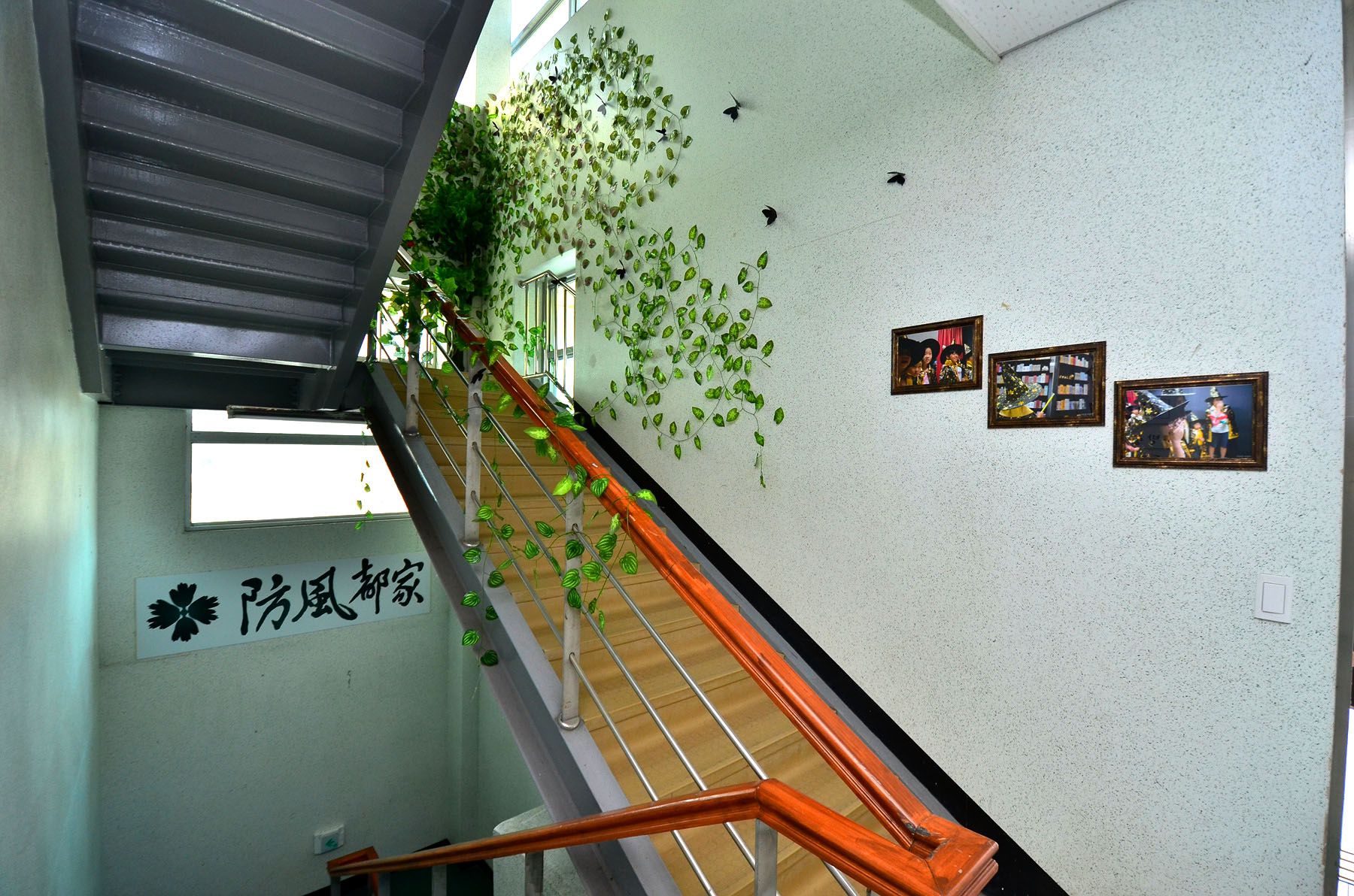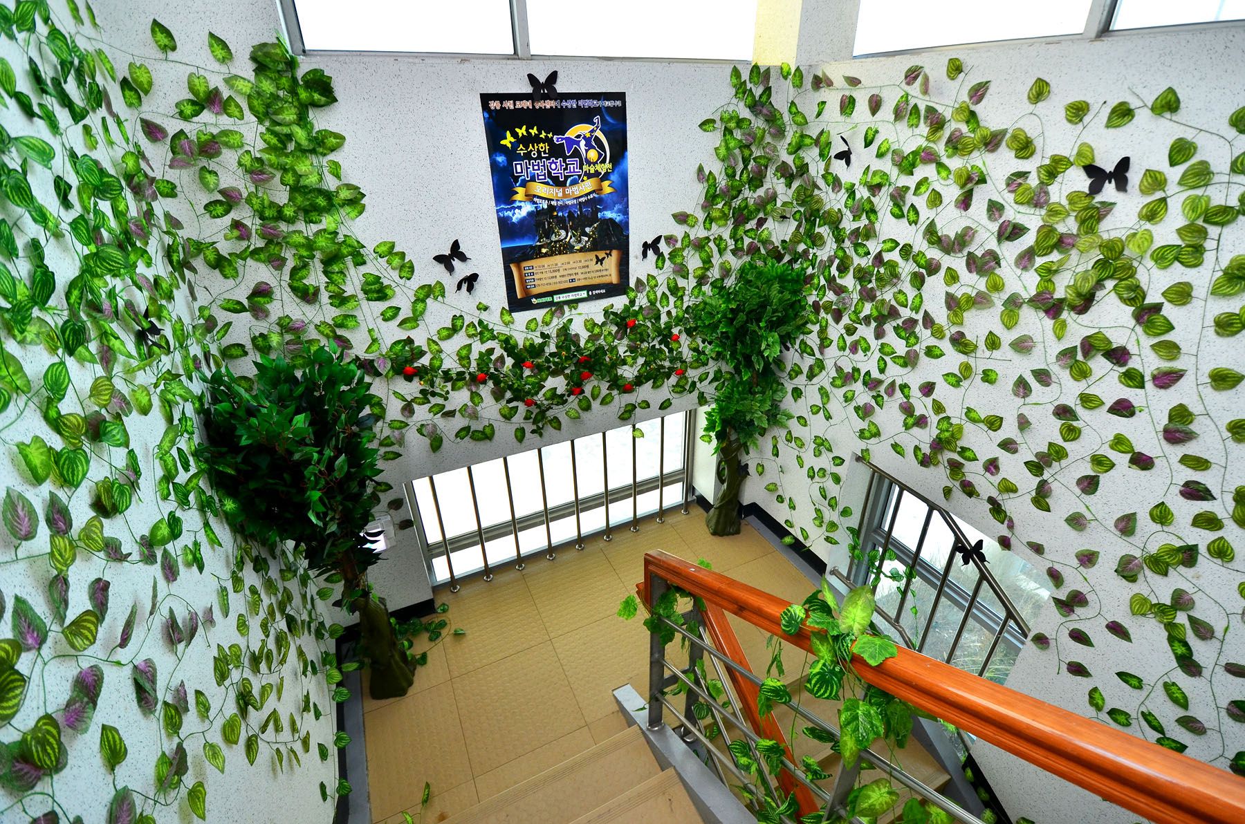 수상한 마법학교가 있는 2층으로 오르는 계단에 장식된 싱그러운 담쟁이풀과 꽃들은