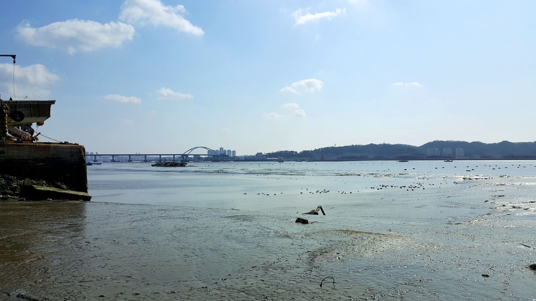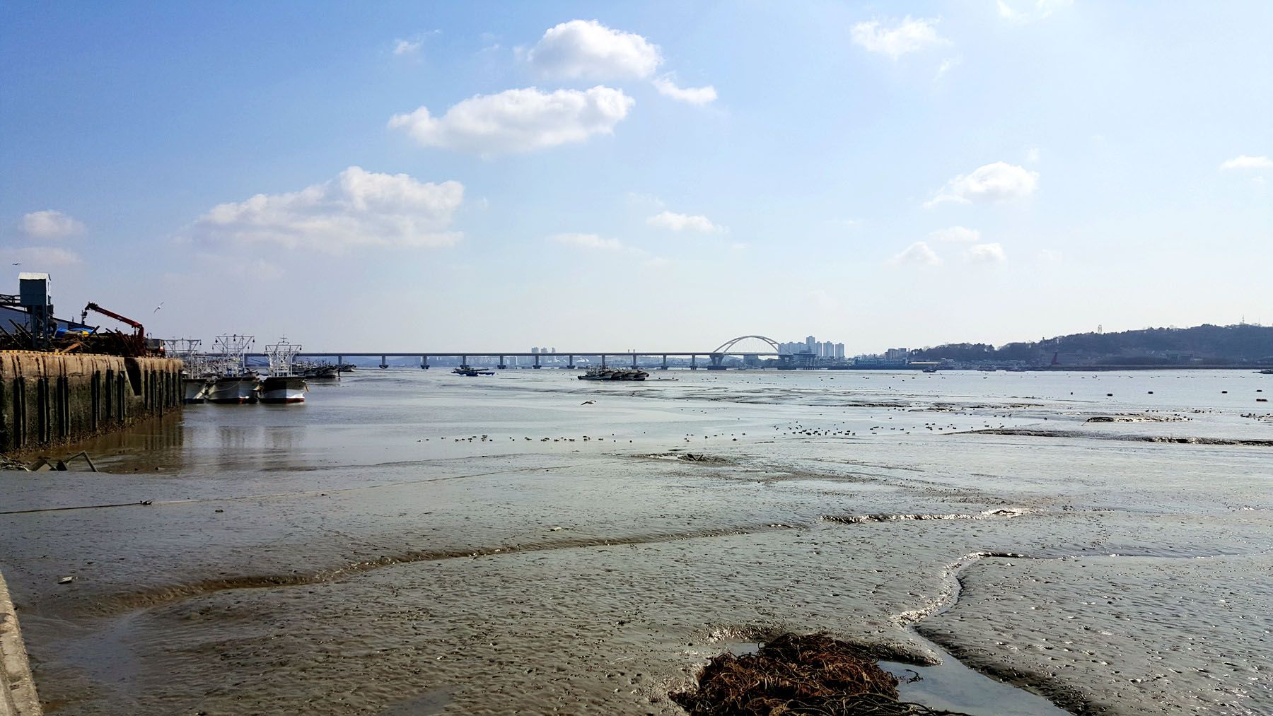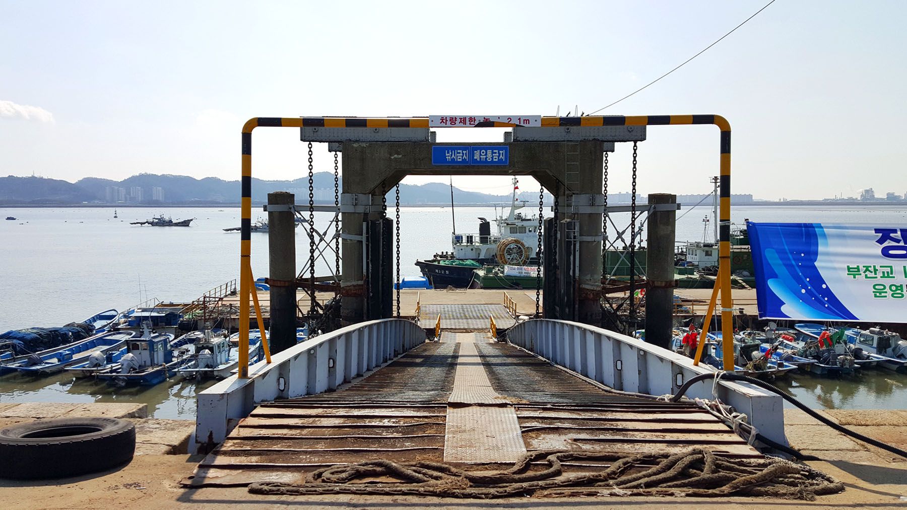 작고 큰 어선들이 줄지어 정박되어 있는 작은 방조제와 통하는 부진교는