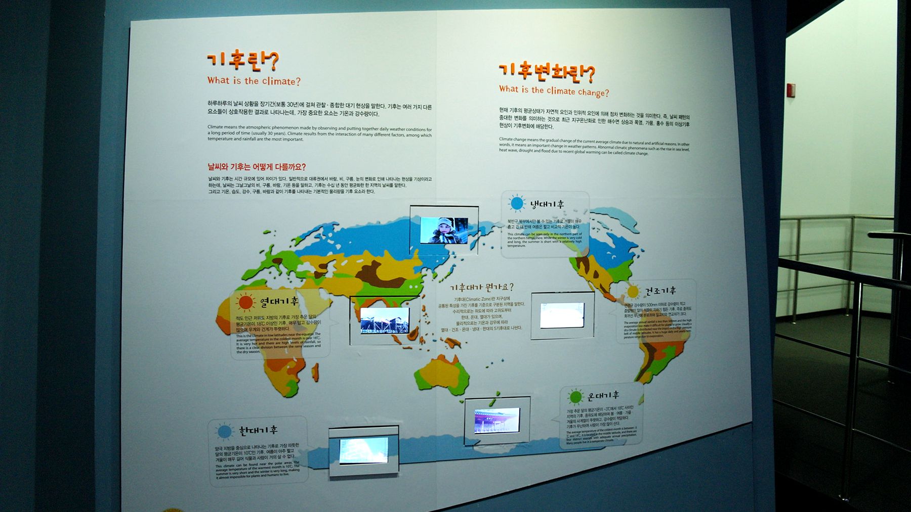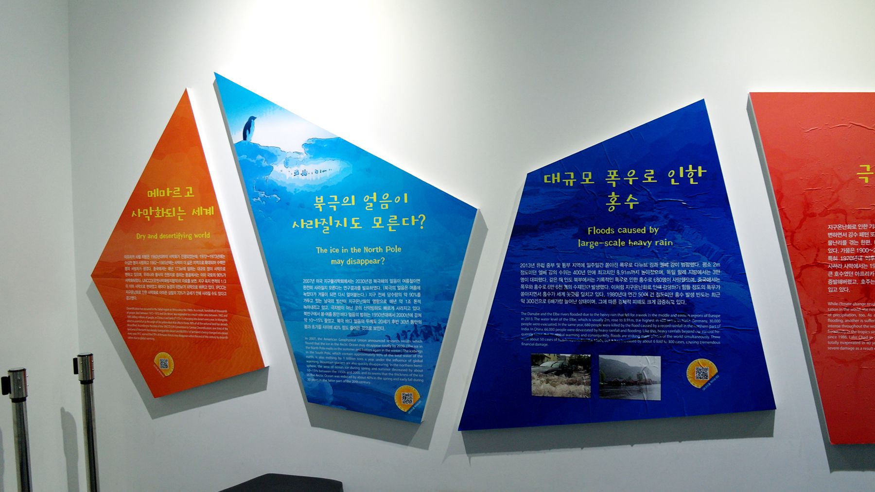 이상 기후 체험실에서는 해수면의 상승, 폭우와 홍수, 사막화 등의