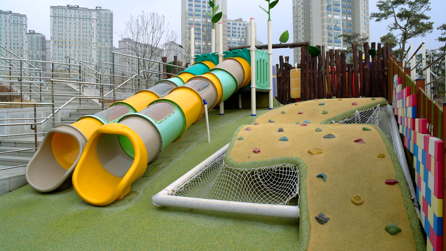 아이들의 눈을 사로잡는 놀이 시설이 야외에도 마련되어 있습니다.