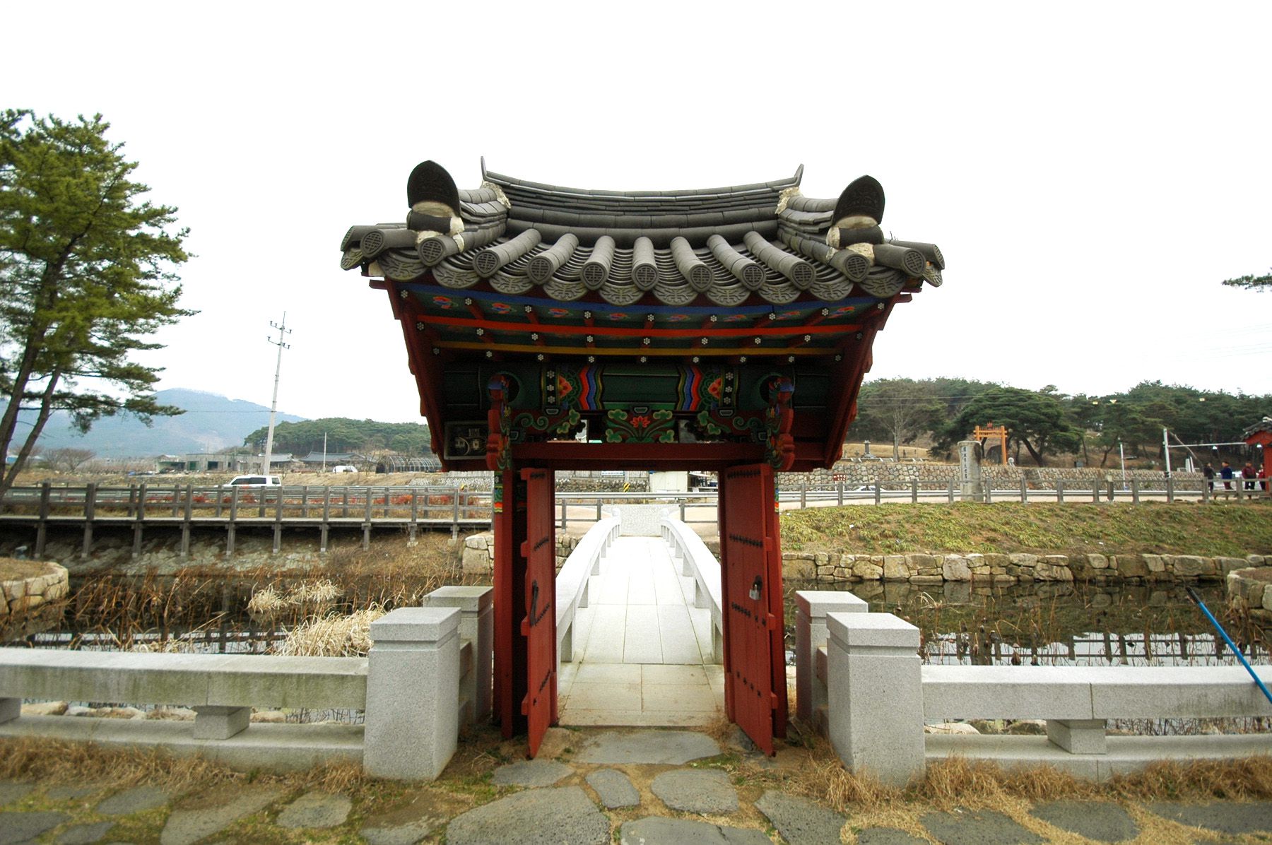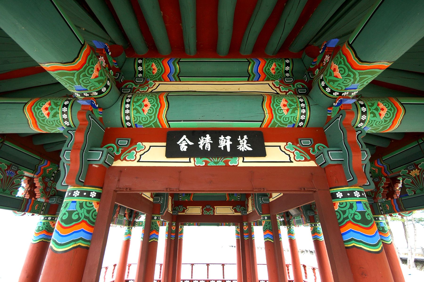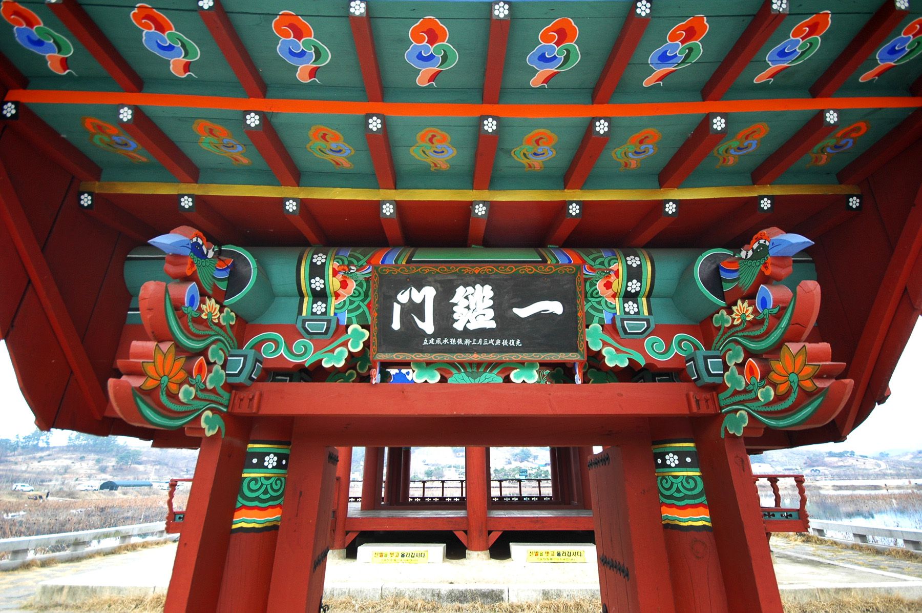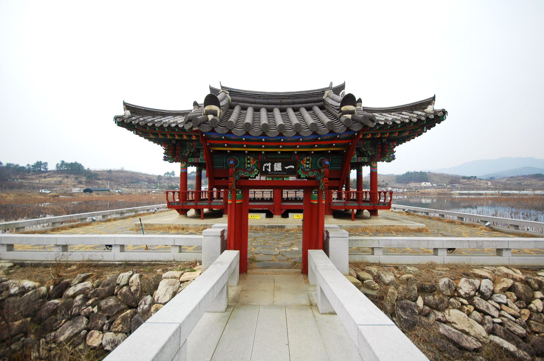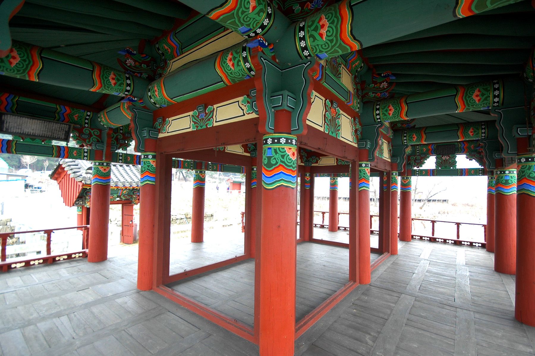 유호연지 입구에 만들어진 인공적인 섬 군자정은 다리를 건너 일감문을 통해 들어갈 수 있습니다.
