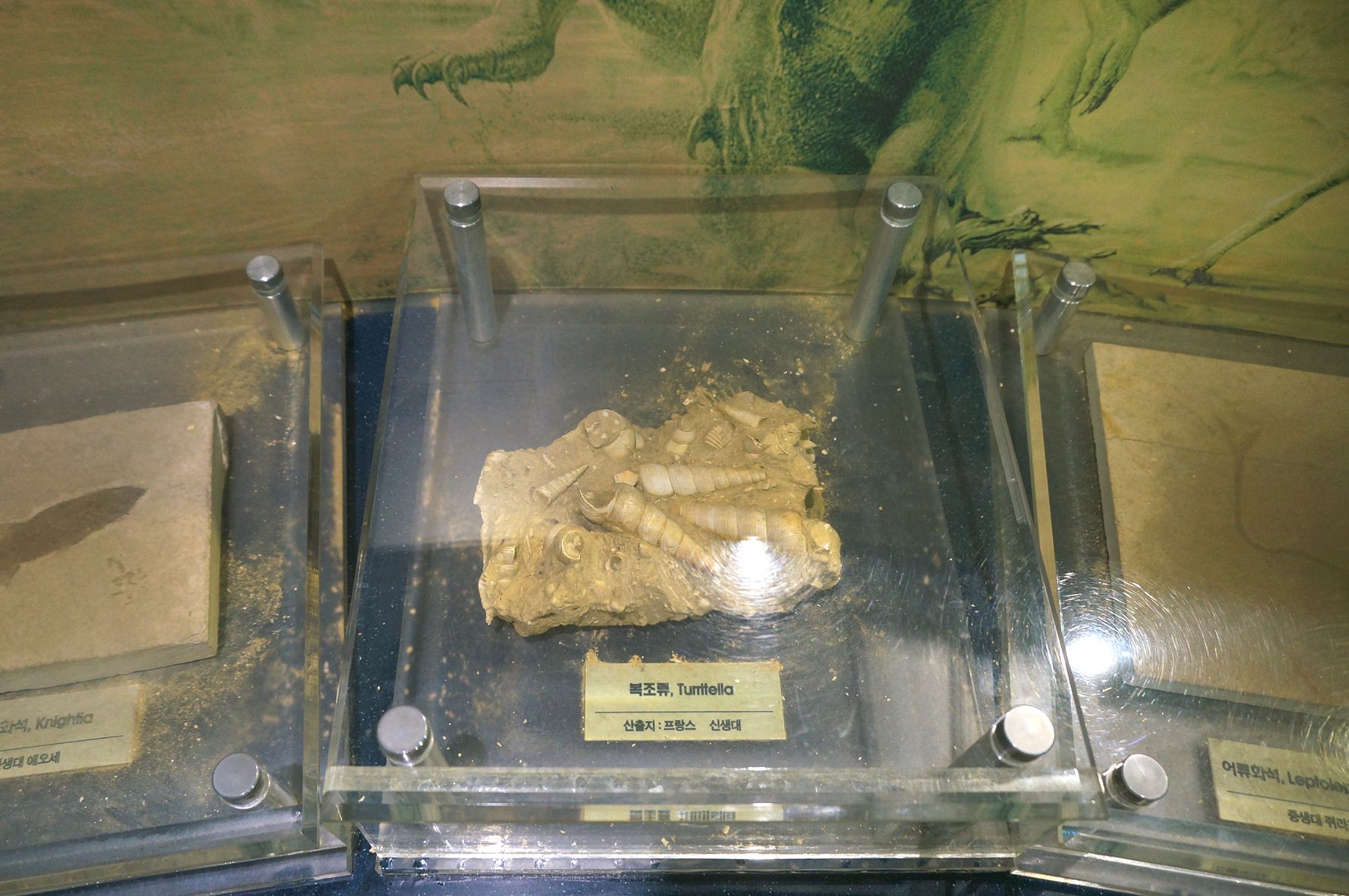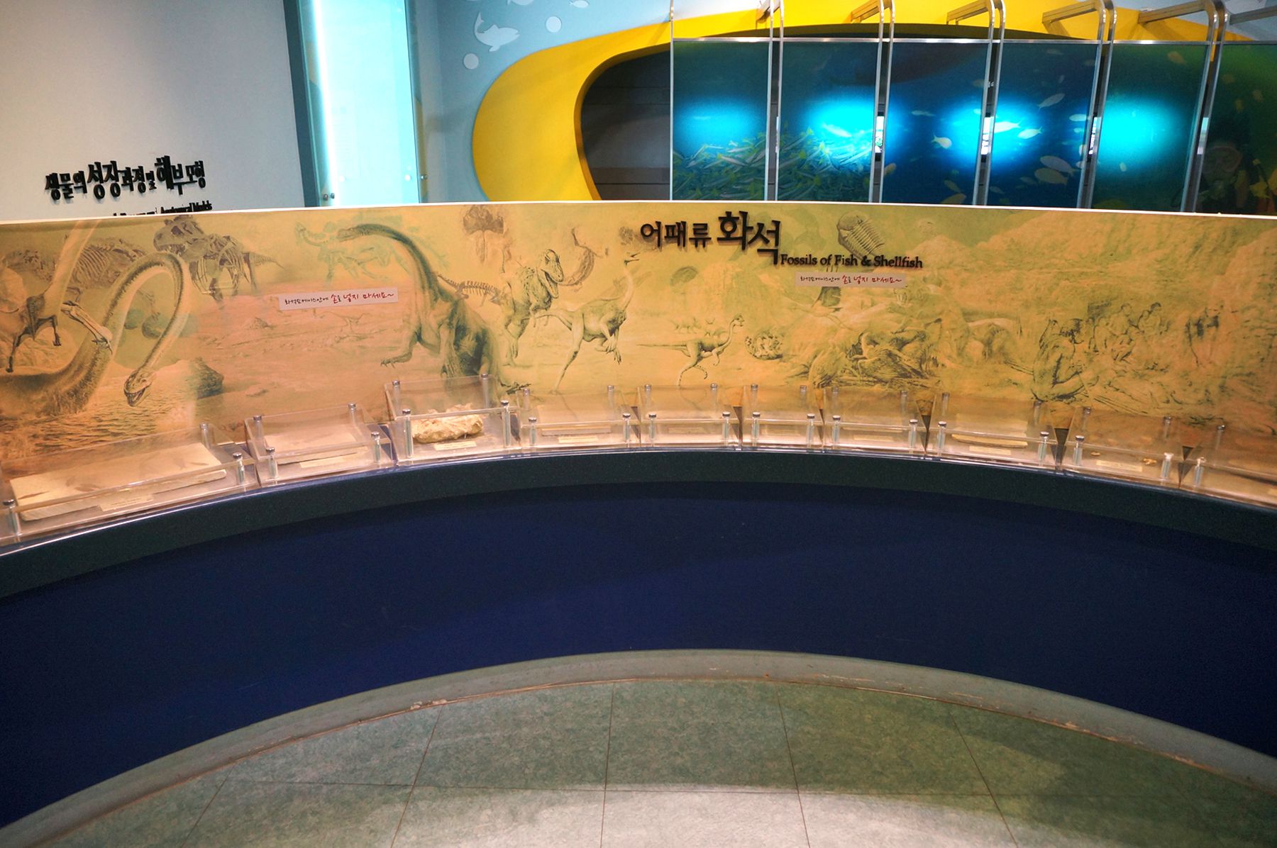 물고기 모양이 다양한 어패류 화석으로 전시되어 있어 학생들에게 흥미를 일으킵니다.