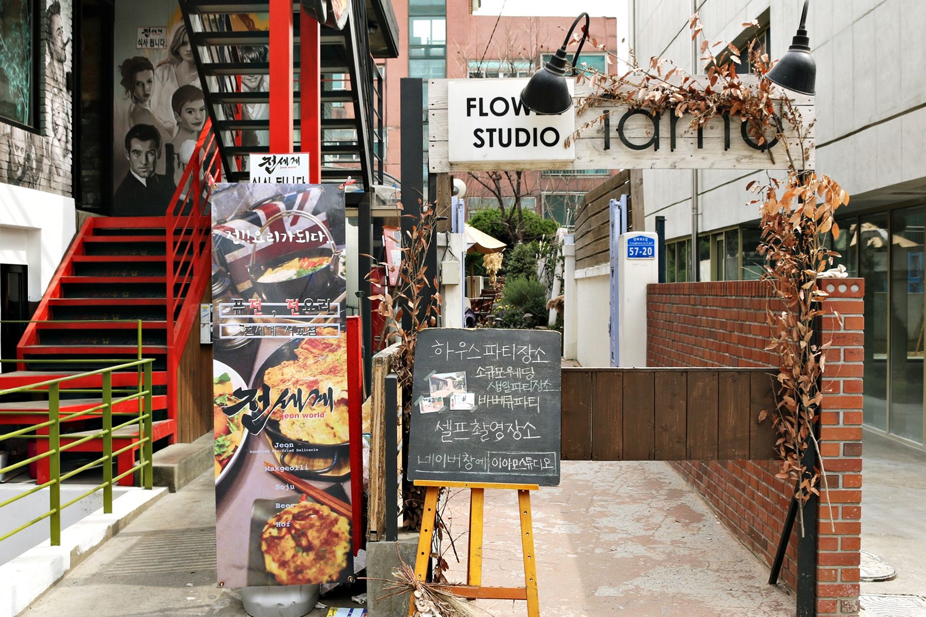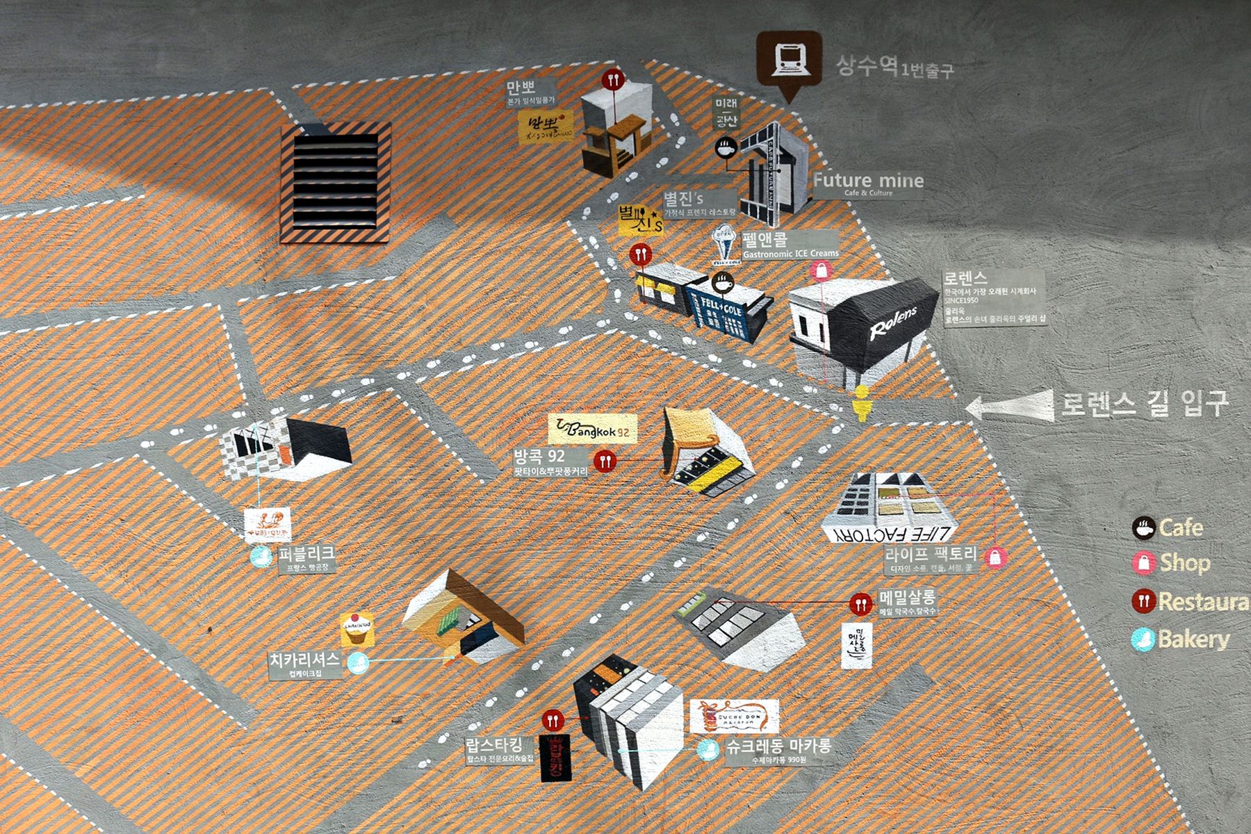 상수역 1번 출구로 나오면 홍대 로렌스길을 만나볼 수 있습니다.