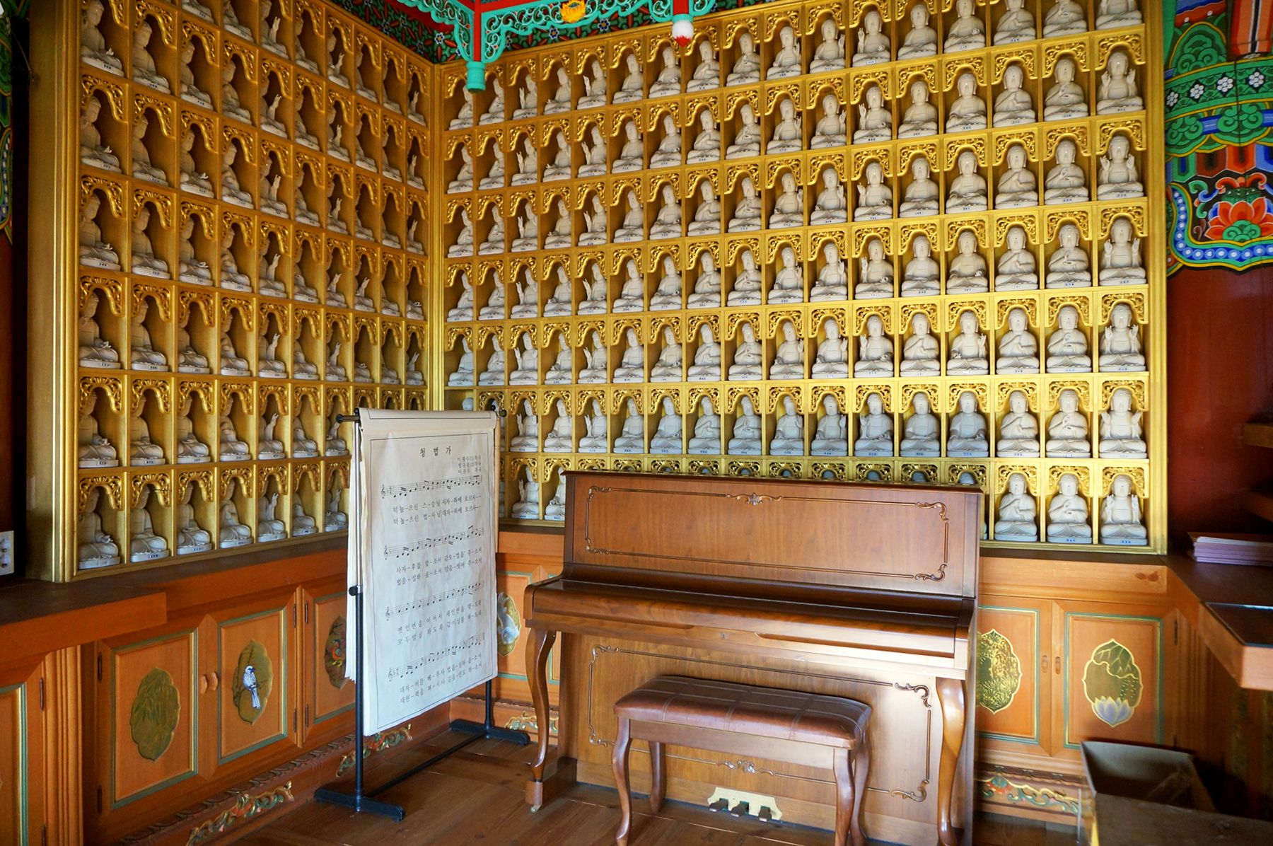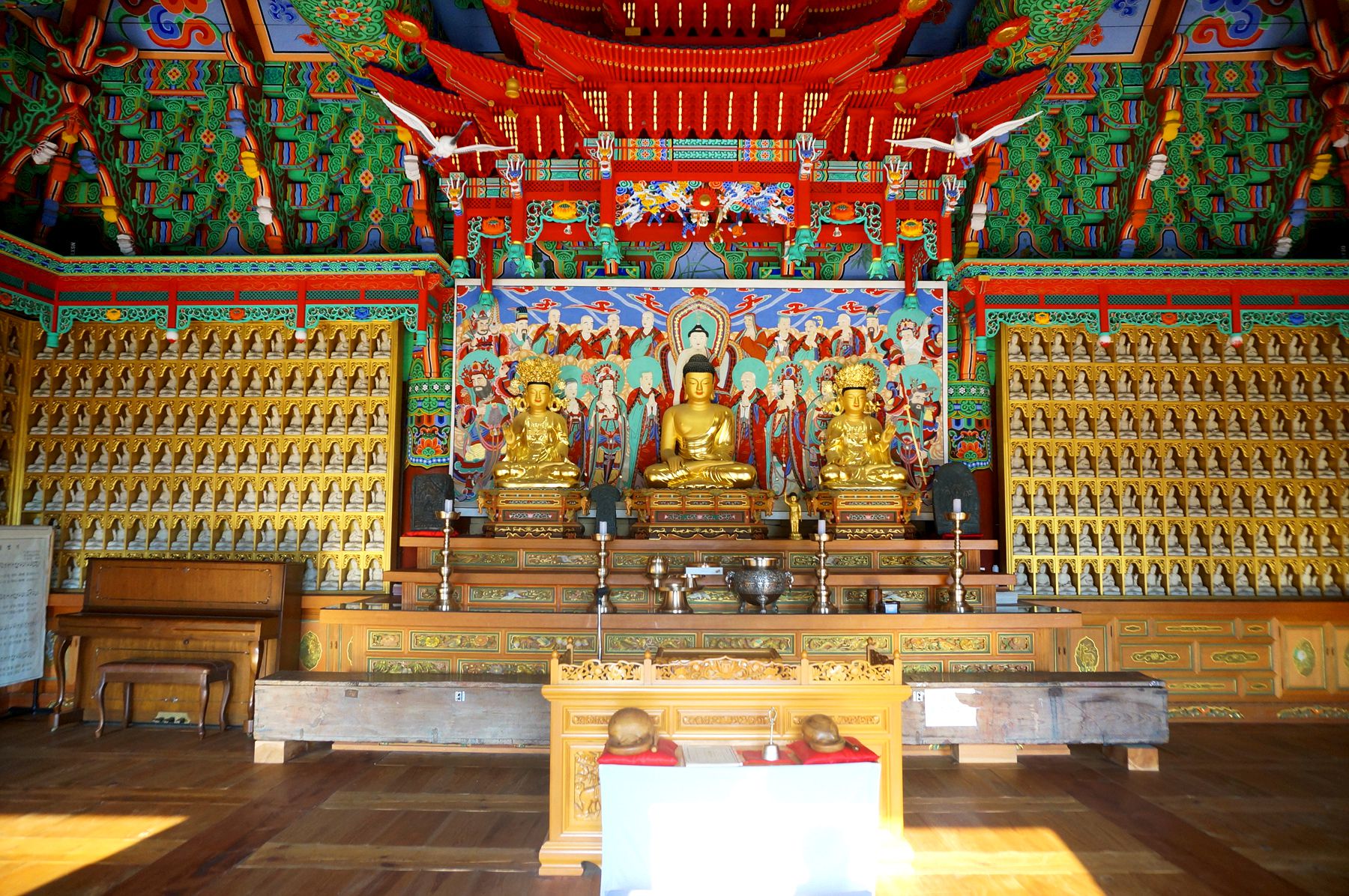 내부에는 아미타불을 모시고 있으며, 불상 위에 화려한 닫집이 있습니다.