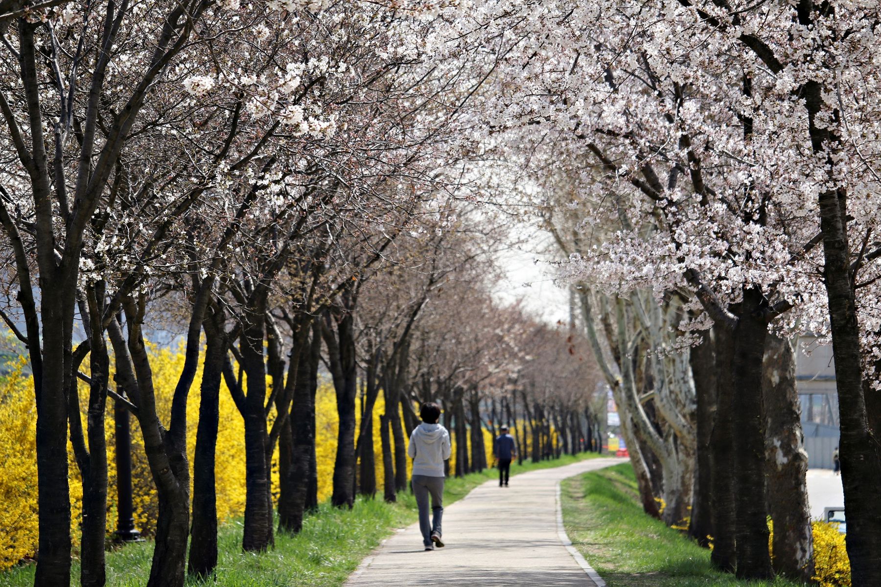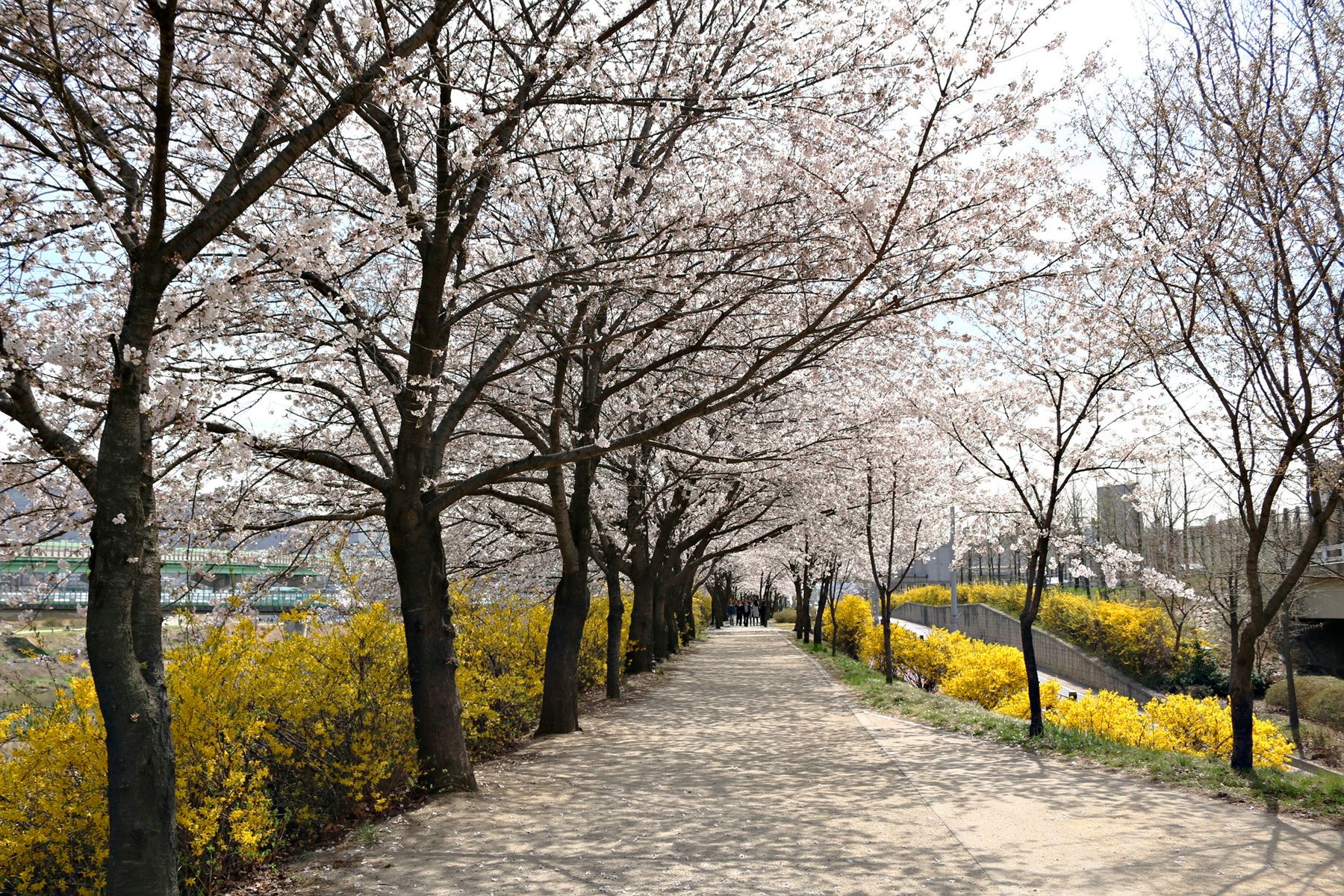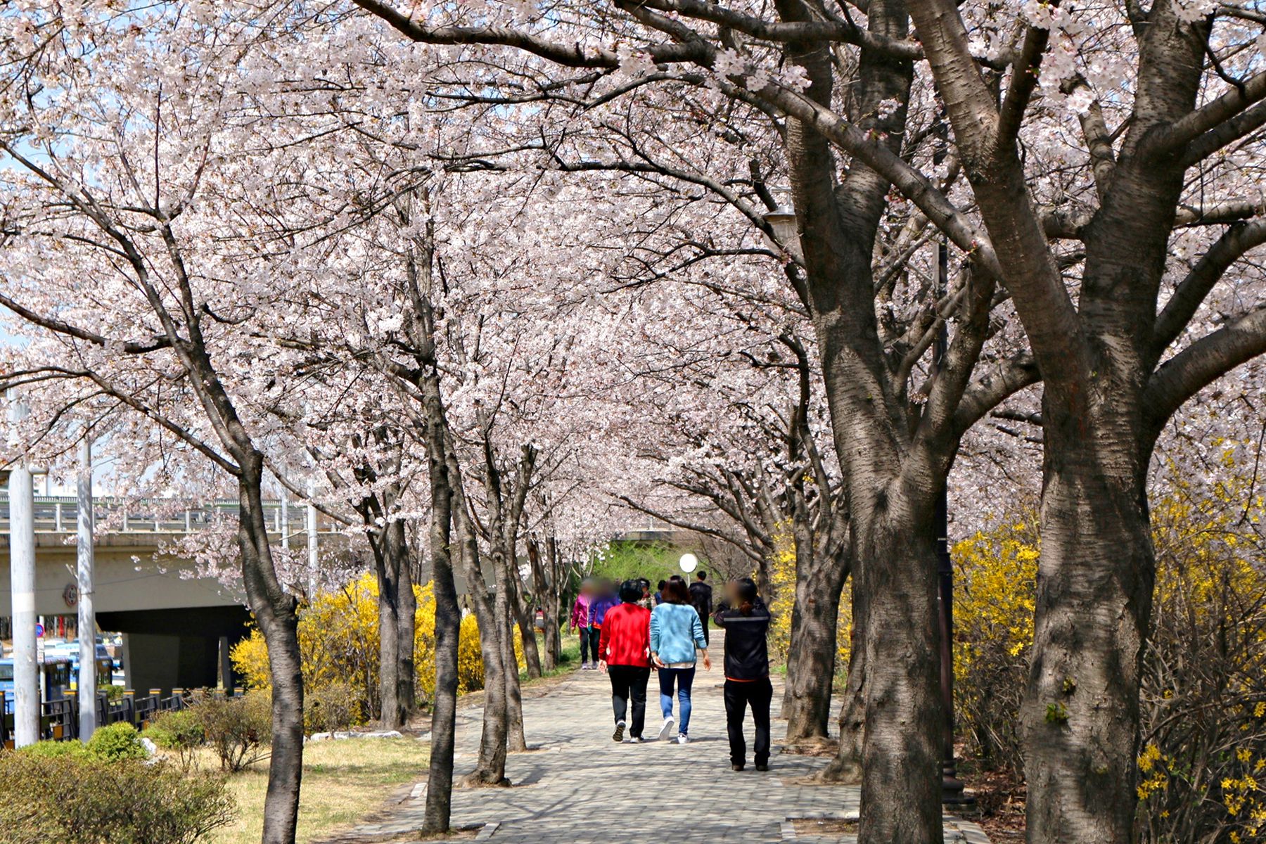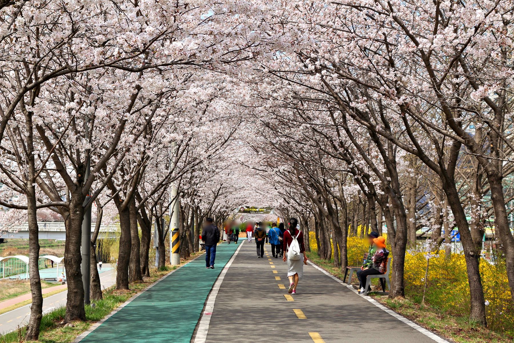 따뜻한 봄 벚꽃과 개나리가 필 때만 이렇게 하얀 꽃터널을 건널 수 있습니다.