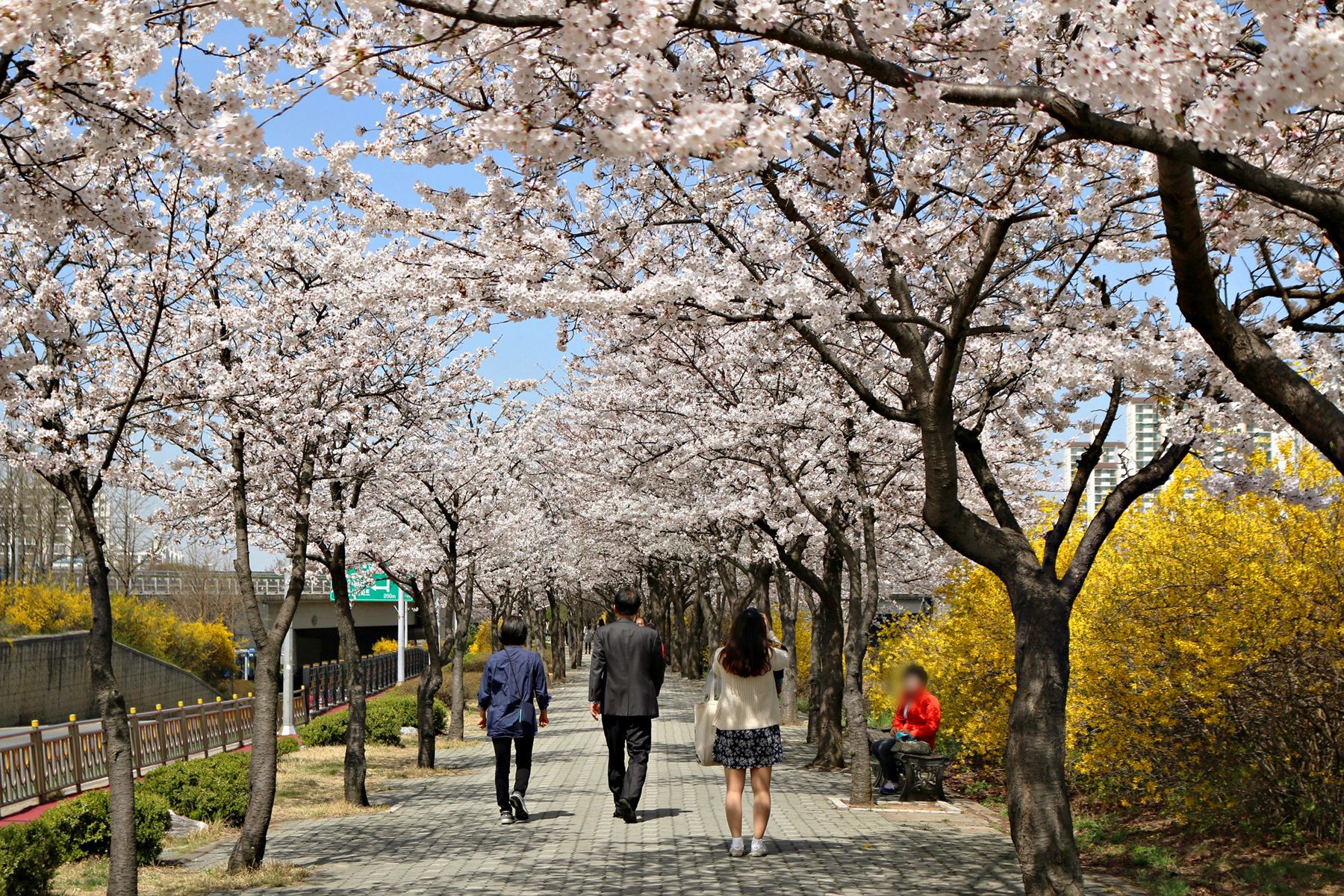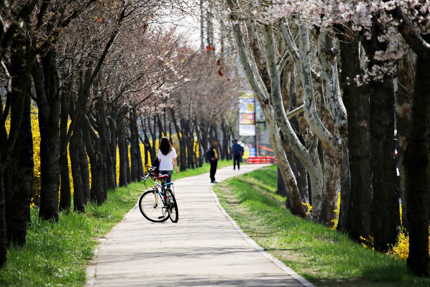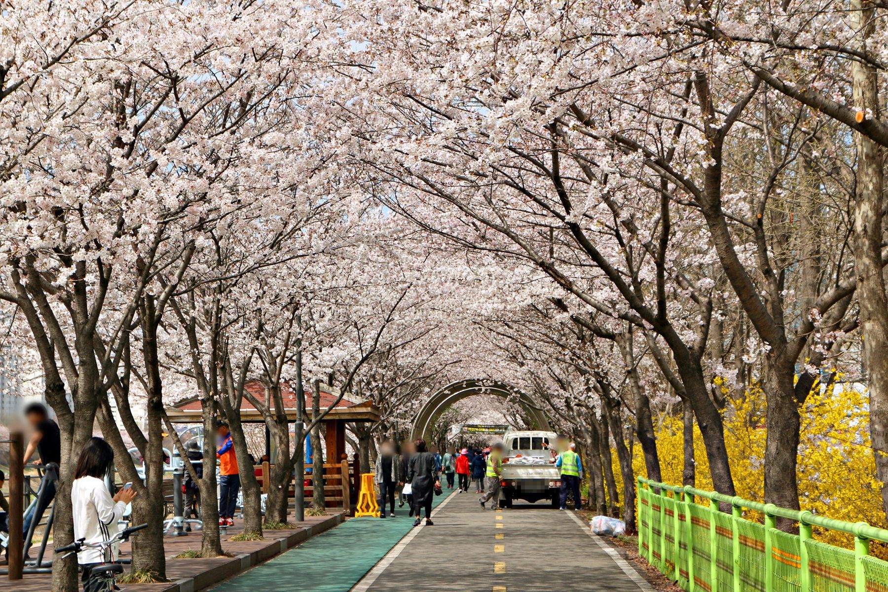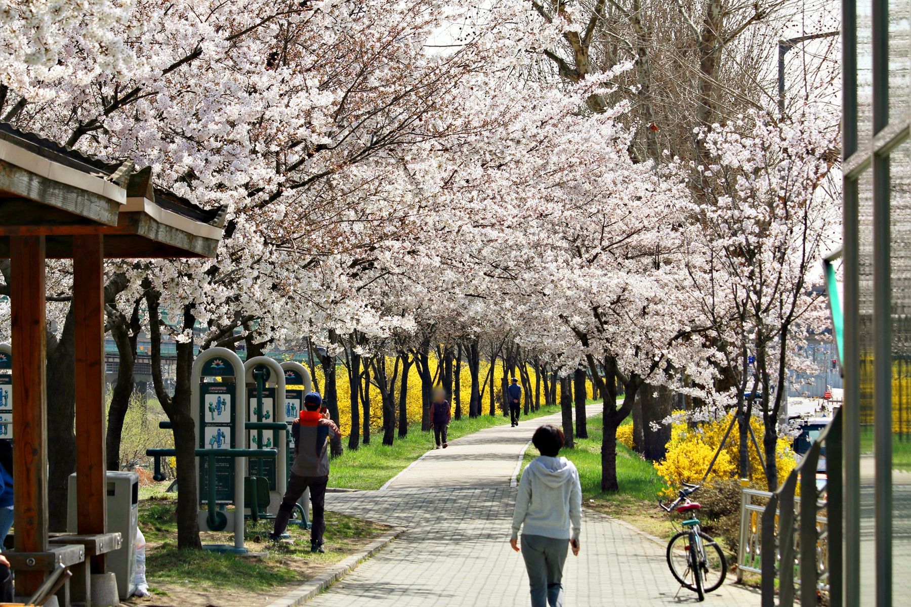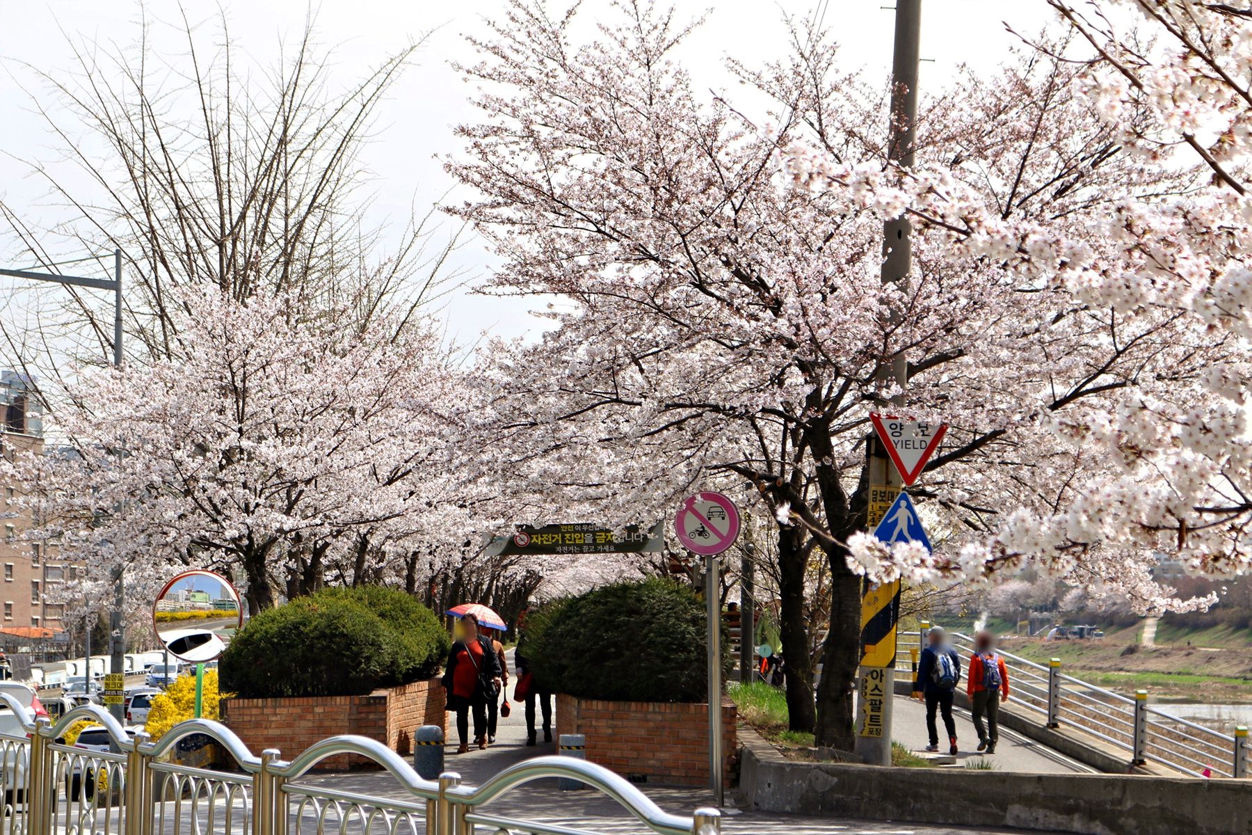따뜻한 봄 벚꽃과 개나리가 필 때만 이렇게 하얀 꽃터널을 건널 수 있습니다.