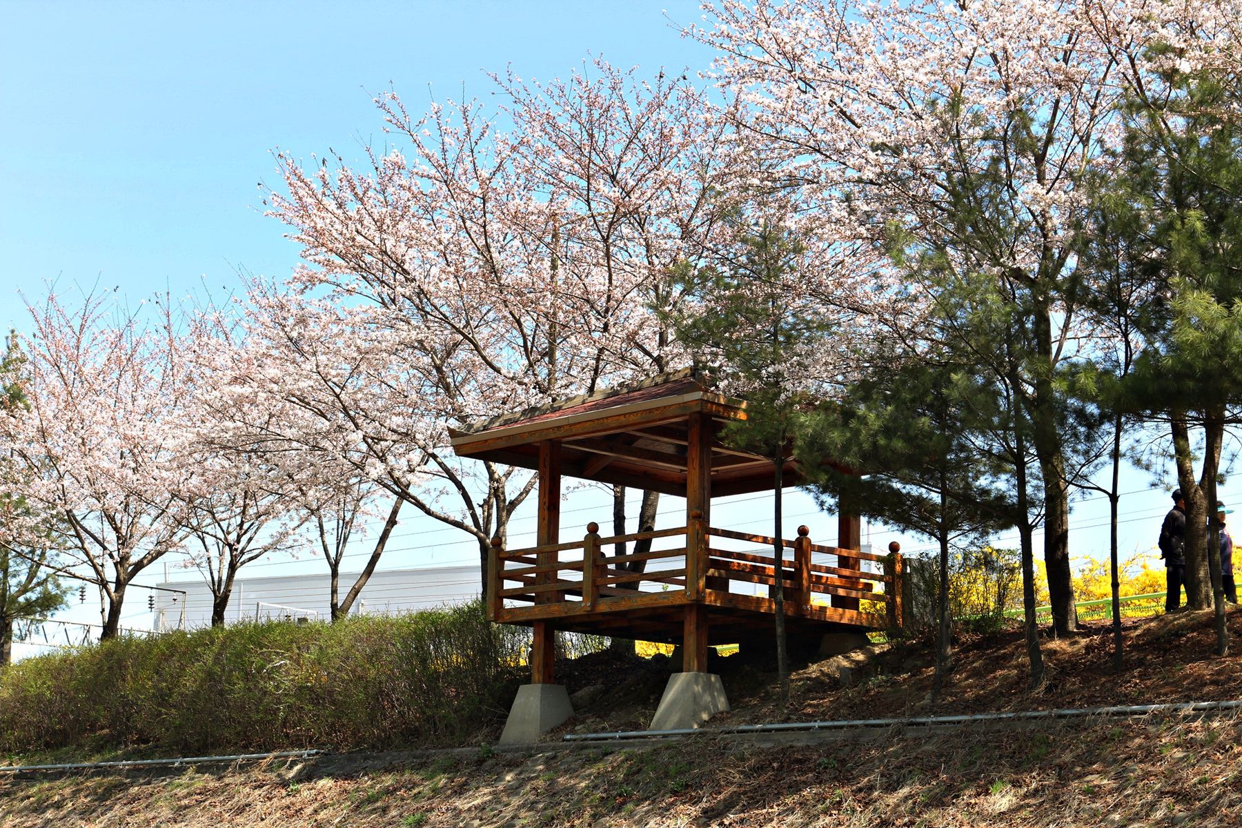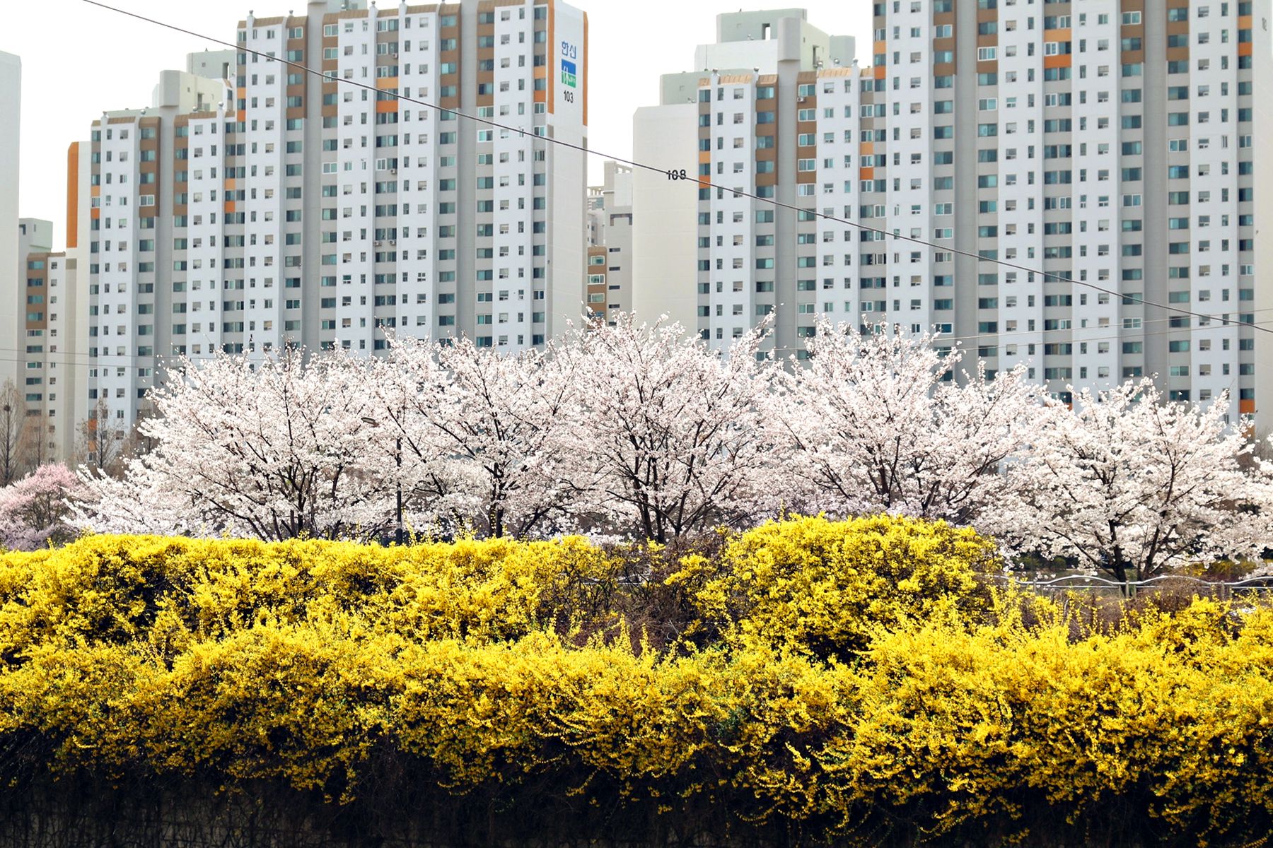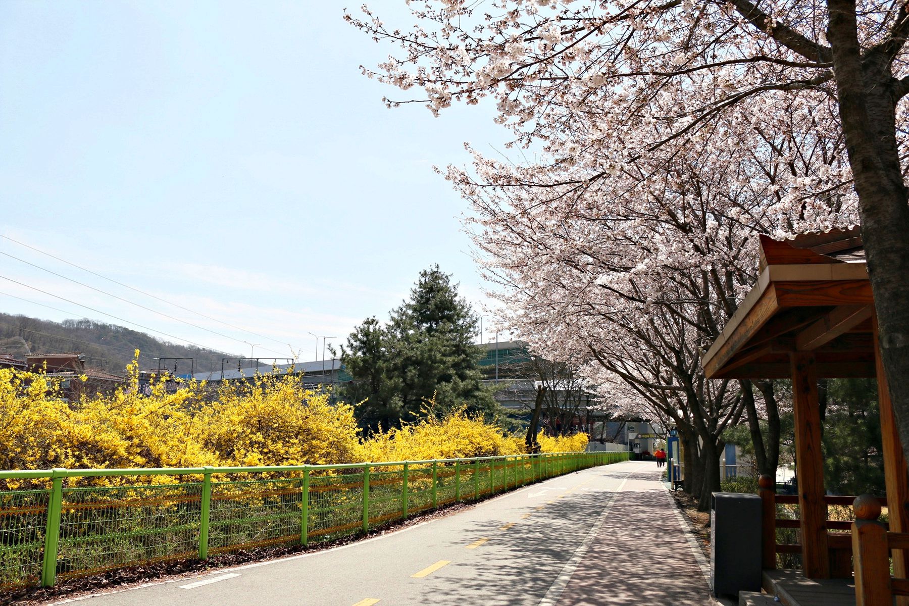 노란색 개나리와 잘 어우러진 모습으로 화보처럼 예쁜 사진을 찍을 수 있습니다.