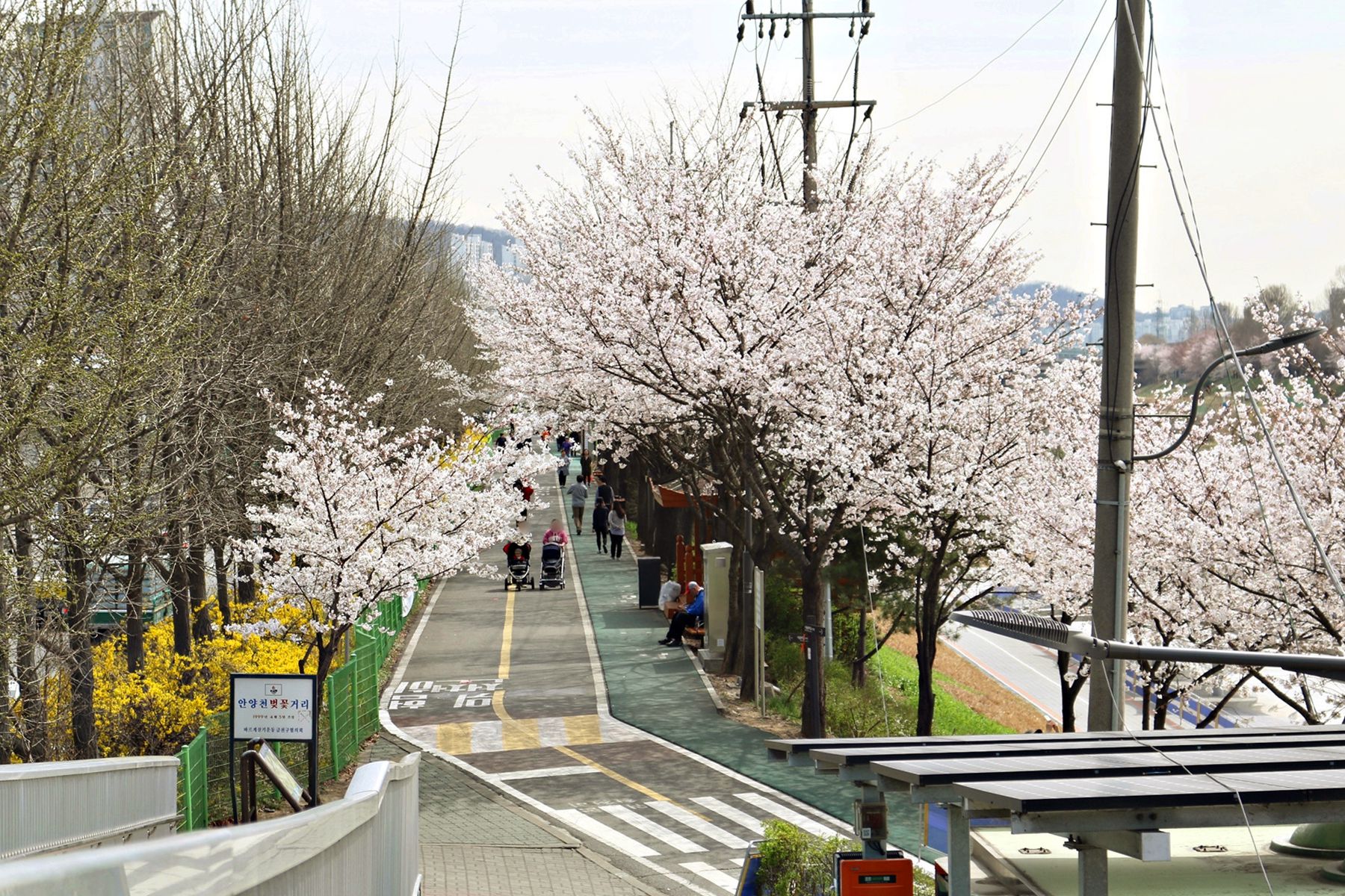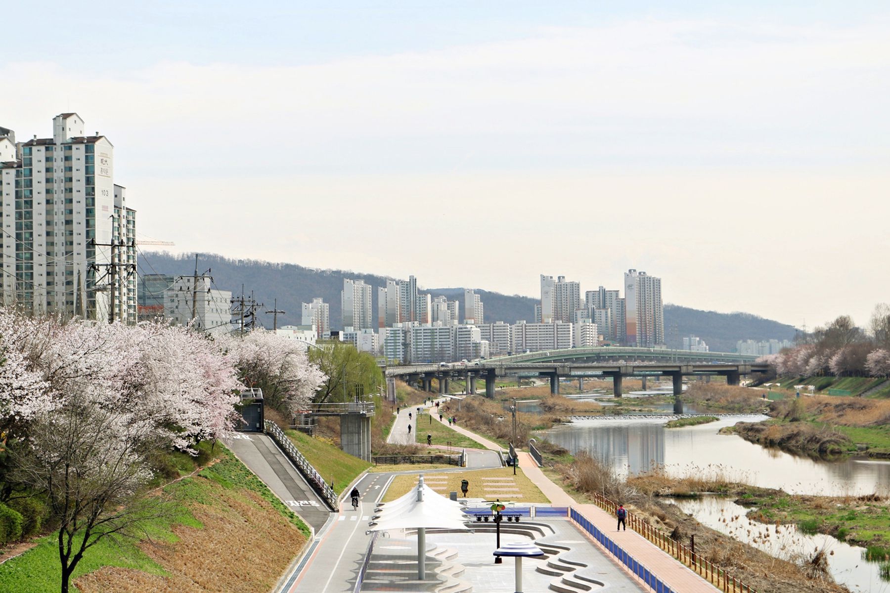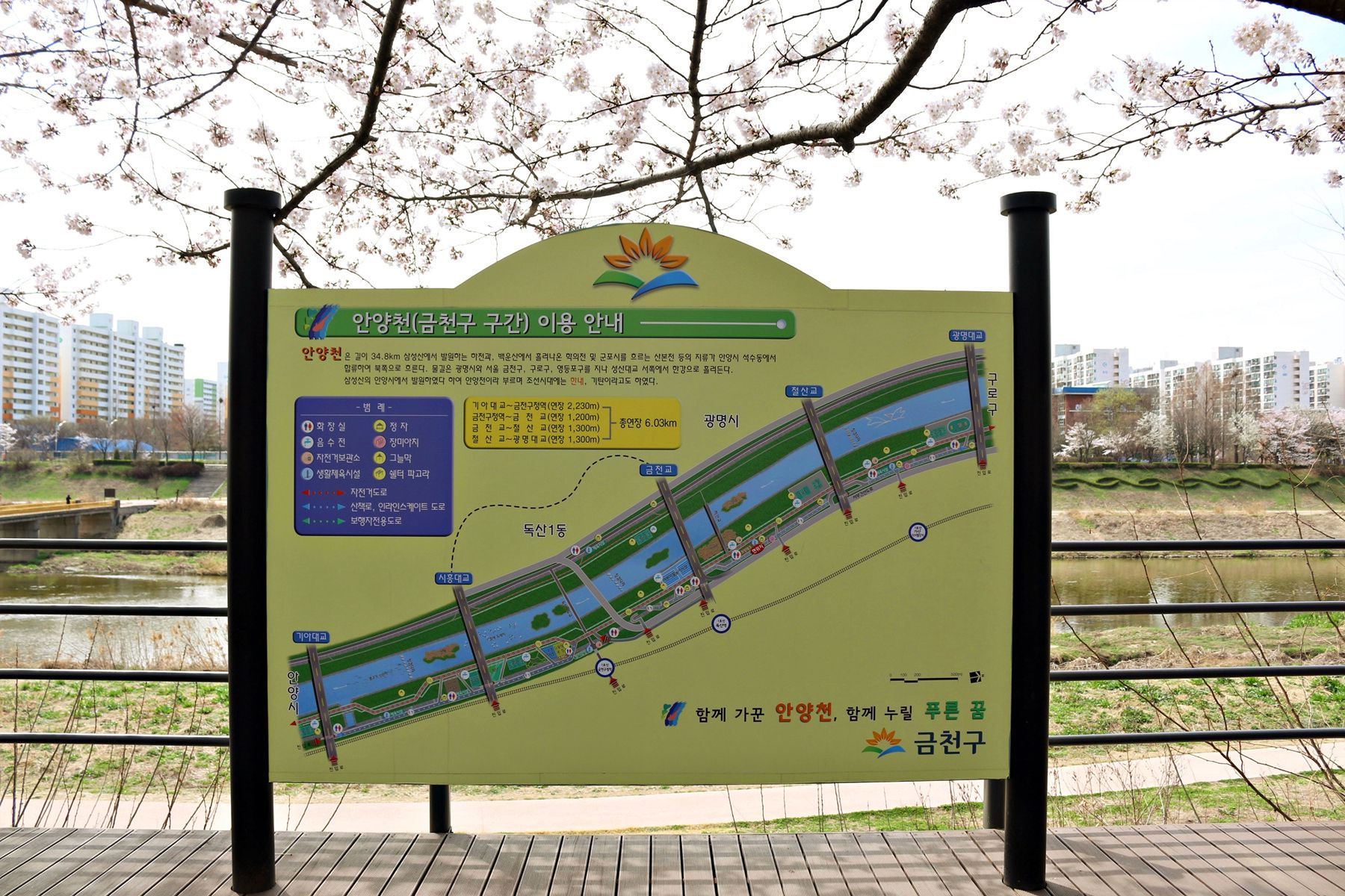 안양천의 흐르는 물과 흐드러지게 피어있는 벚꽃들을 감상하며 여유로운 시간을 보내기 손색없는 곳입니다.