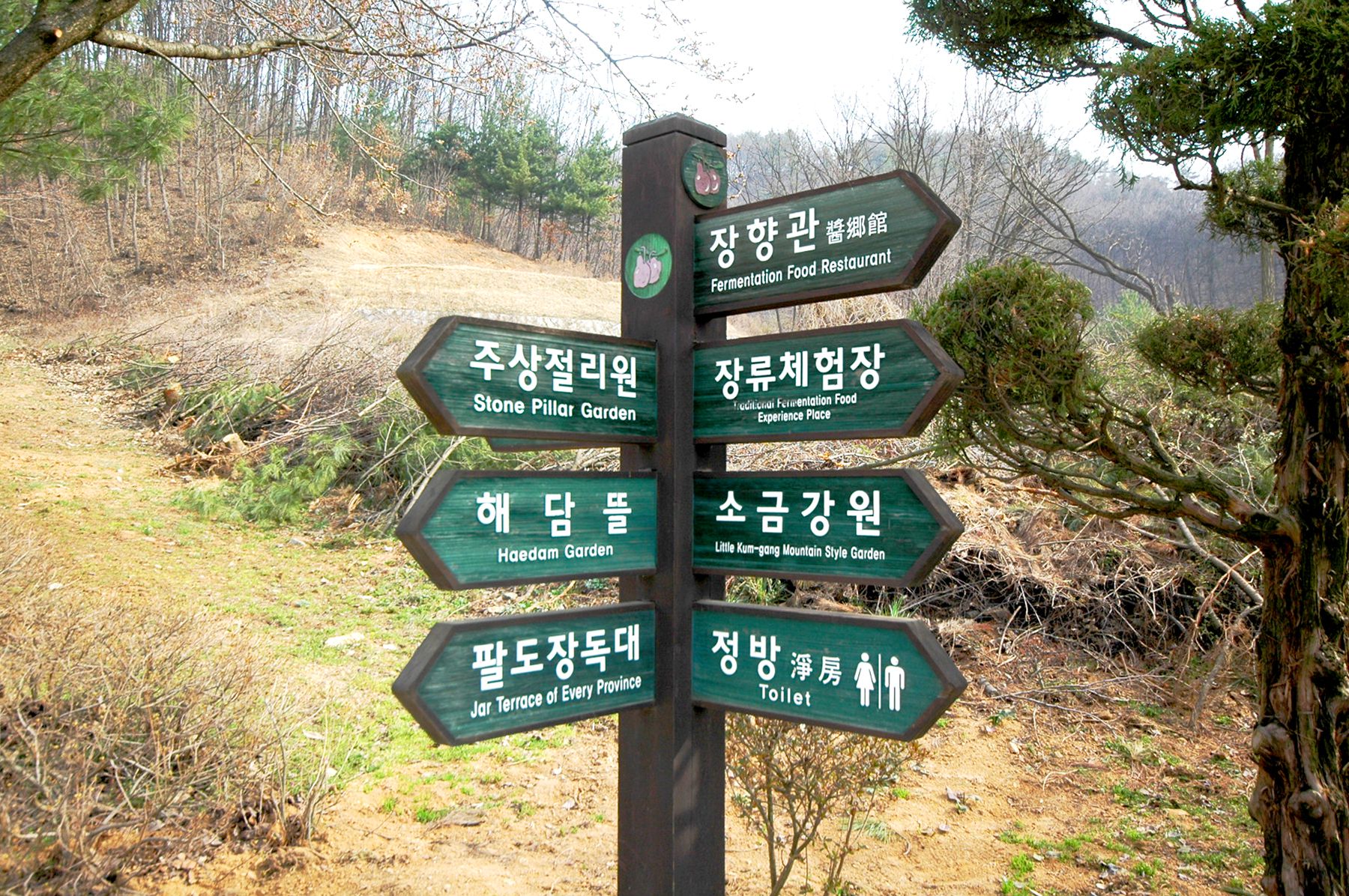 삽이지신상거리, 야생화화원, 수목화원, 주상절리원, 팔도장독대, 장류테마전시관, 발효체험가공관, 청솔관 등으로 구성되어 있습니다.