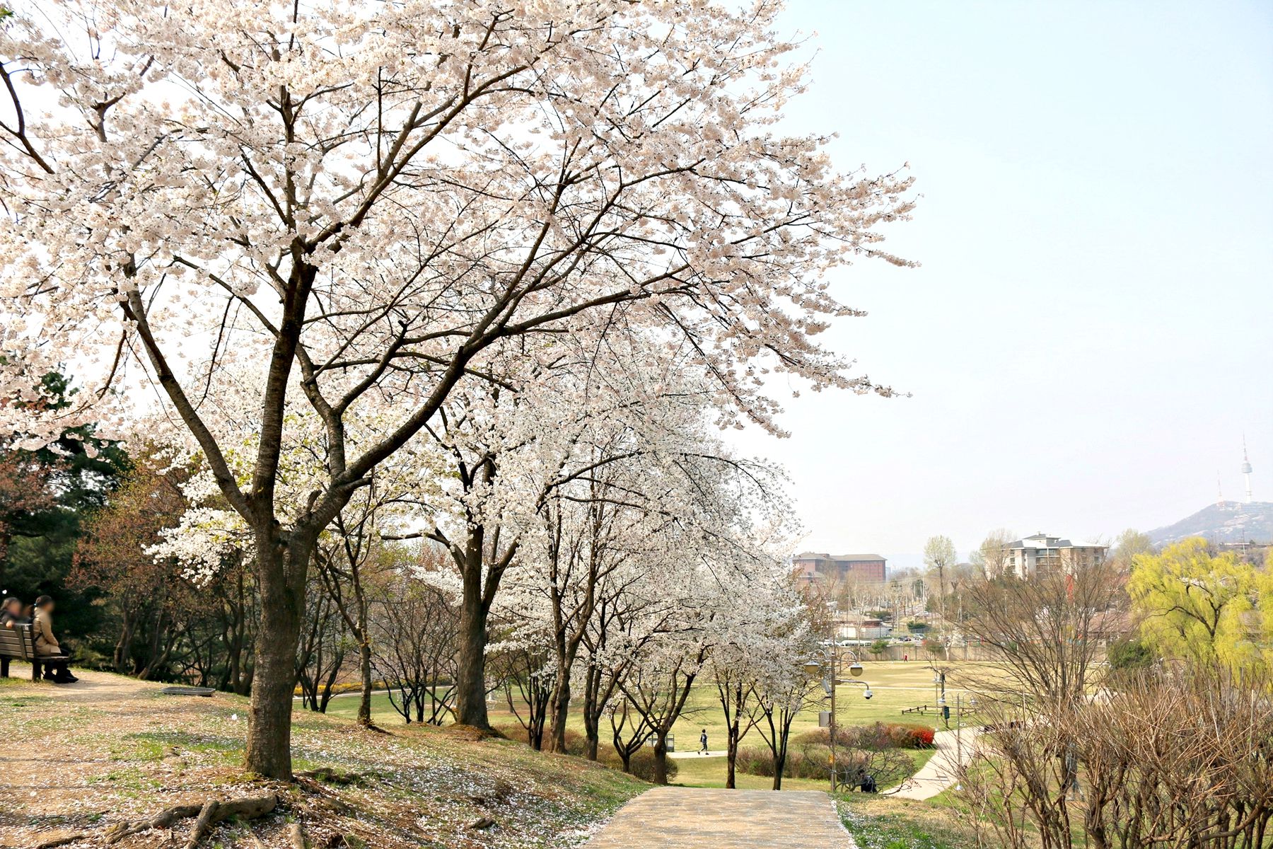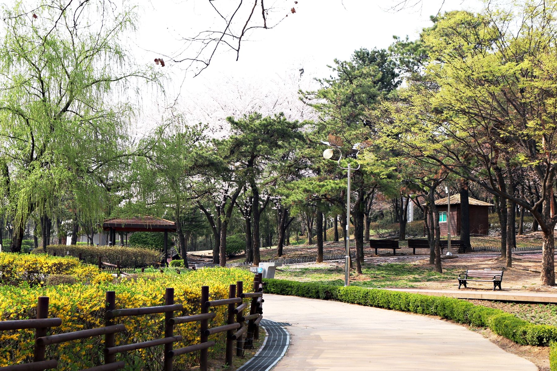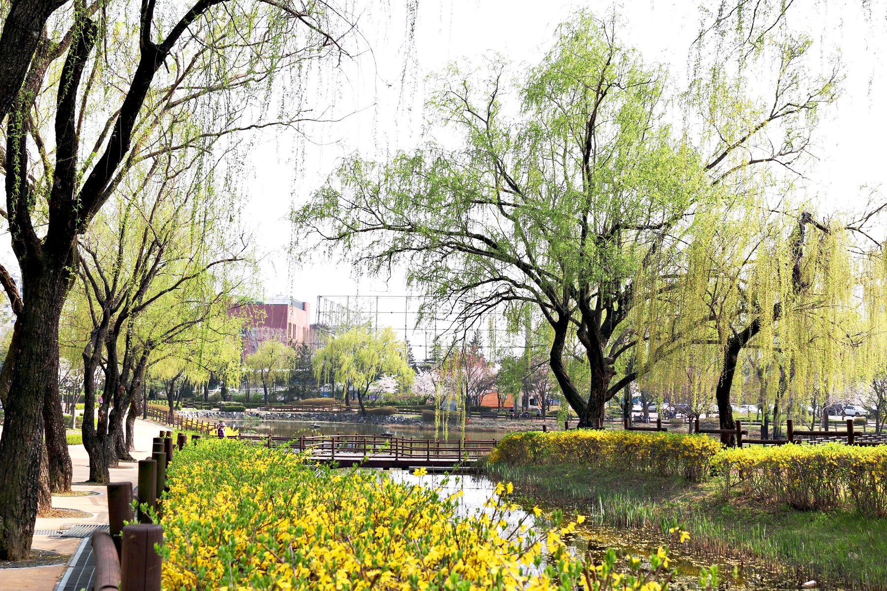 하얀 벚꽃뿐만 아니라 노란 개나리와 풋풋한 연둣빛 버드나무까지도 봄소식을 전하고 있는 용산가족공원!