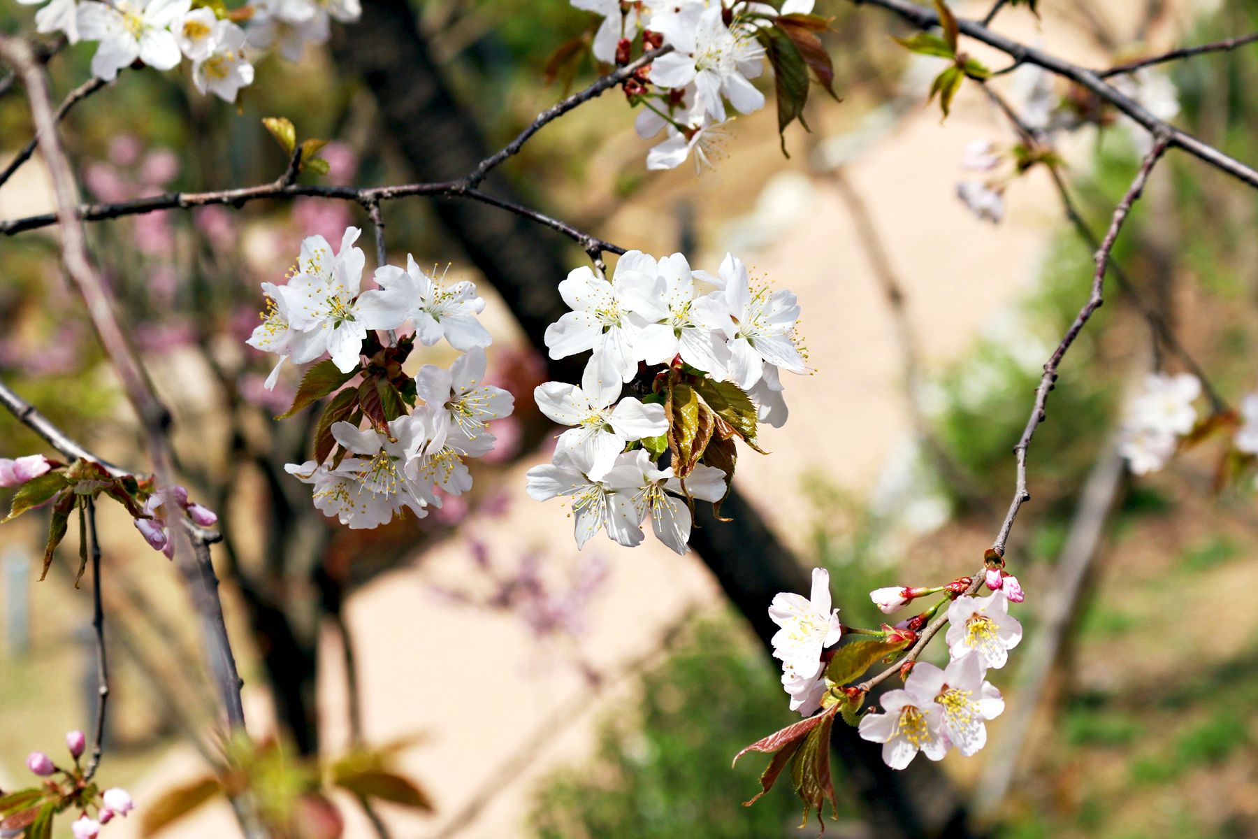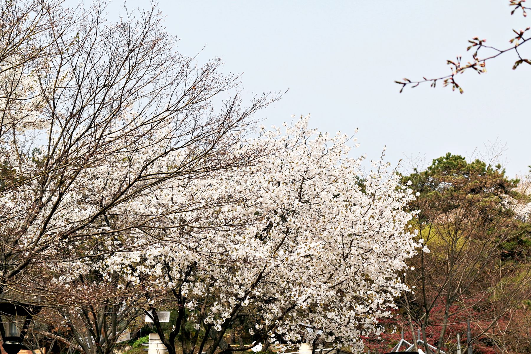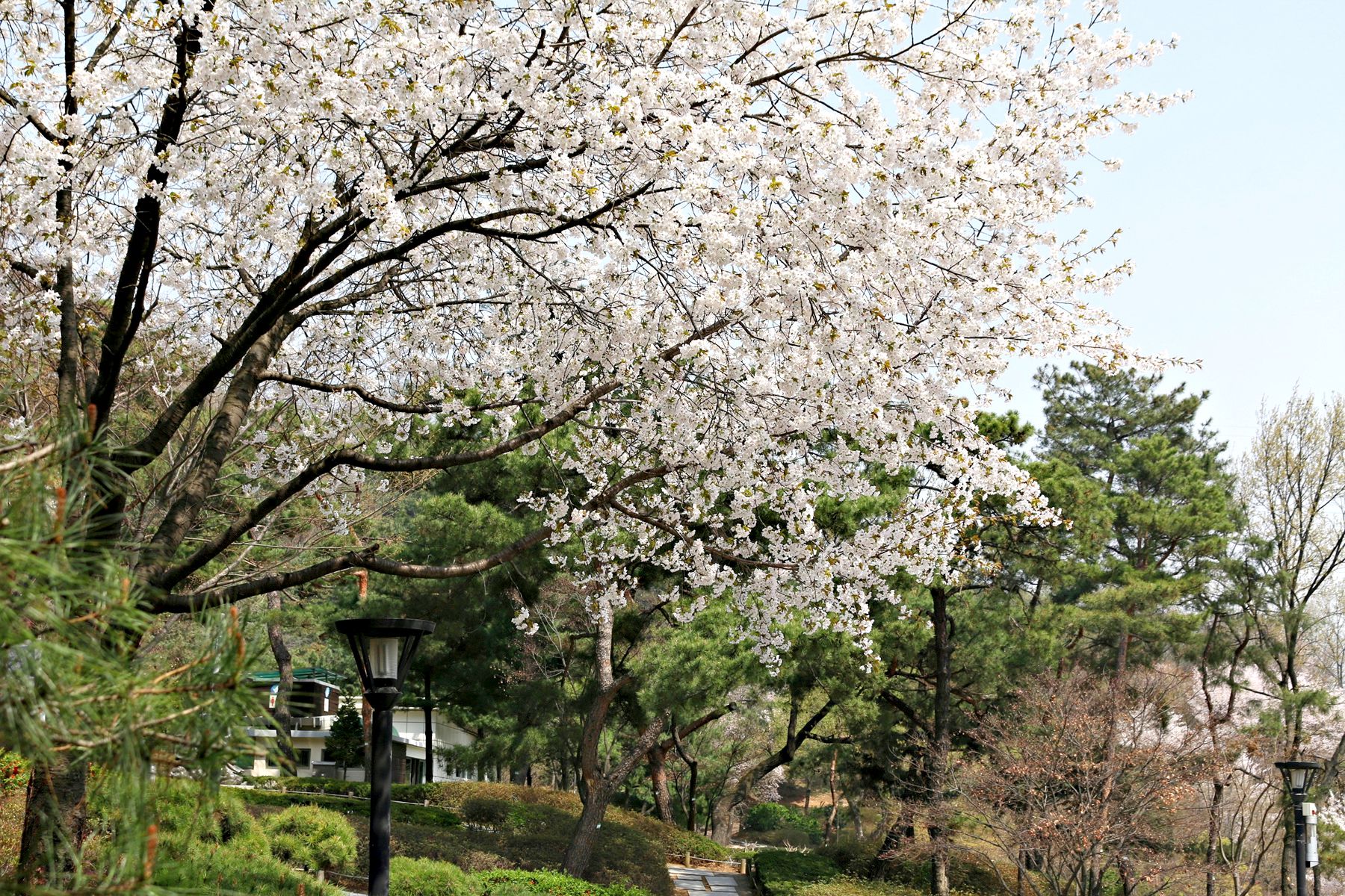 잎이 푸릇푸릇한 나무들과 벚꽃이 어우러져 봄의 기운을 물씬 풍깁니다.