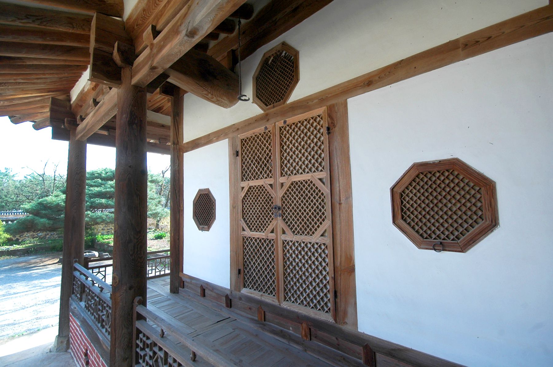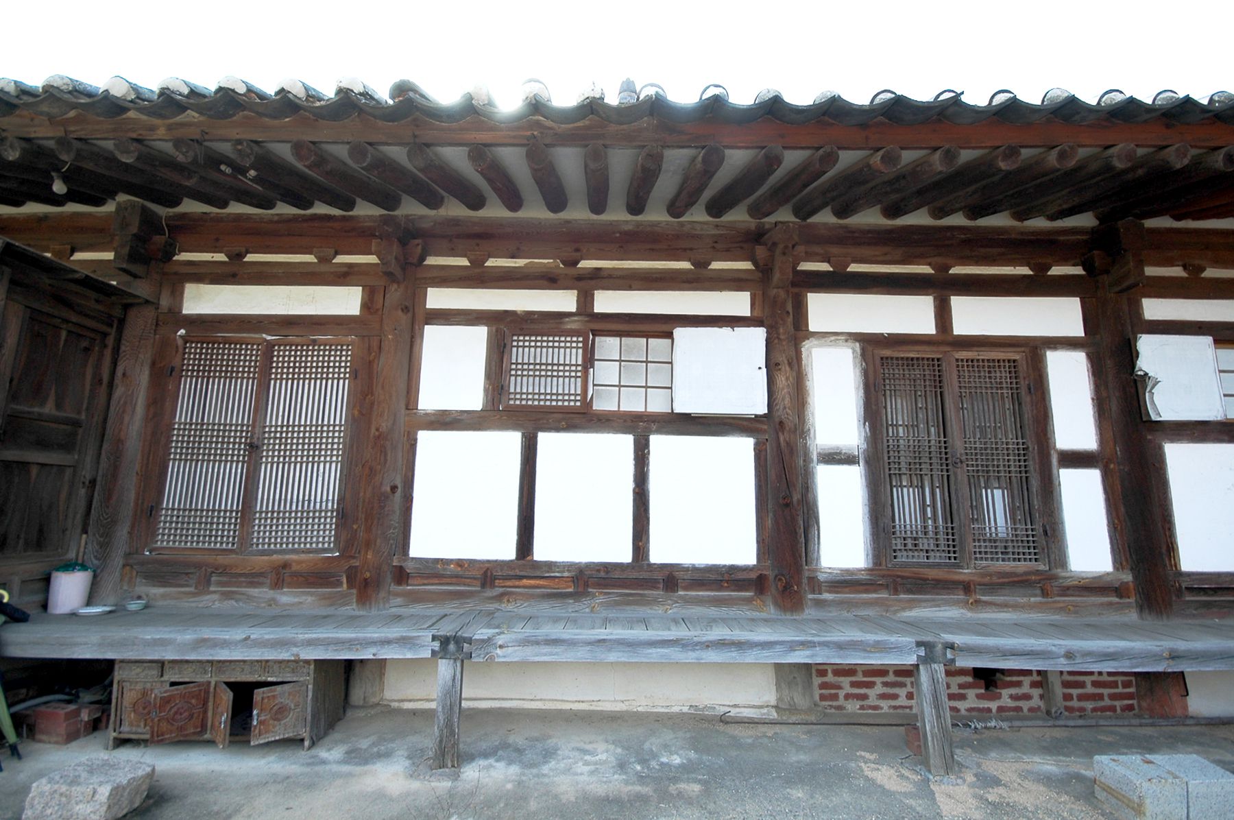 3단의 석축기단 위에 자리한 사랑채는 H자 모양의 겹집으로 집의 폭이 넓으며, 사랑채 벽면은 다양한 창호로 구성되어 있습니다.