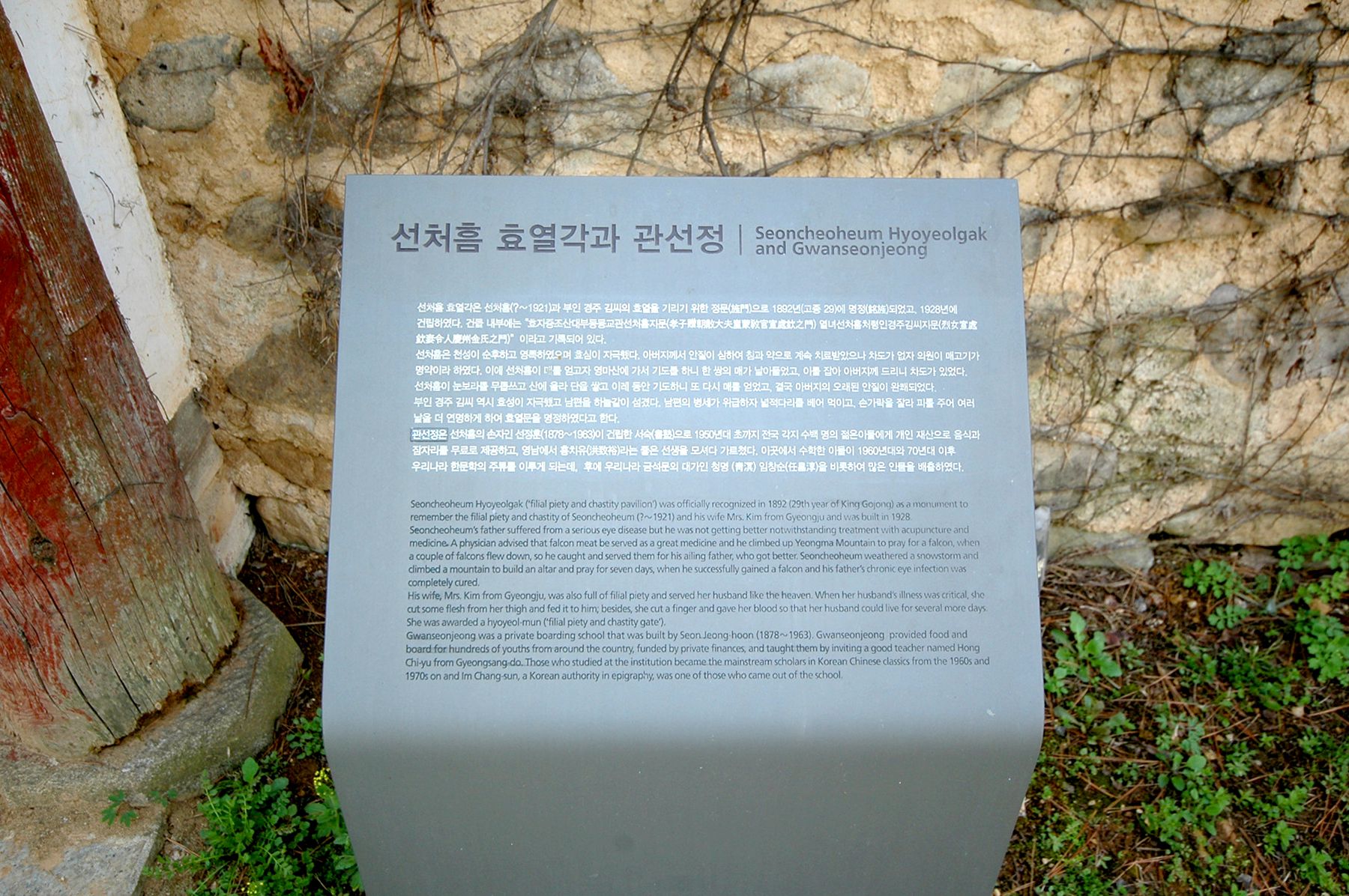 선처흠 선생의 손자인 선정훈 선생은 개인재산으로 관선정을 만들어 수백명의 젊은이들에게 잠자리와 음식을 제공하며