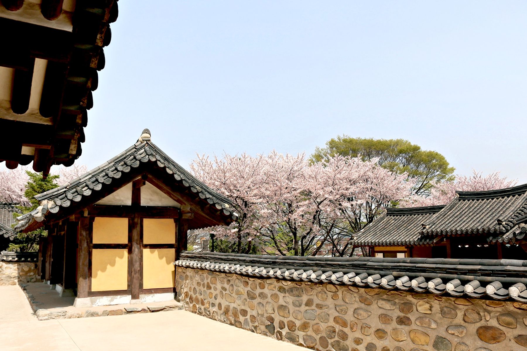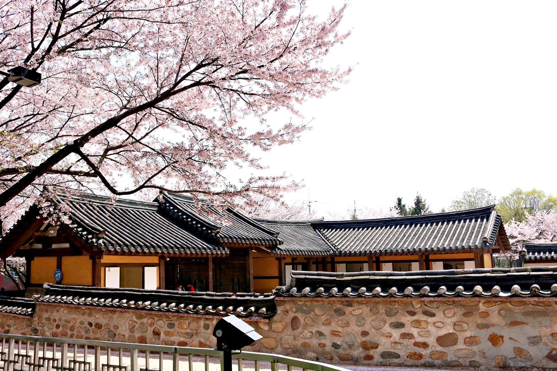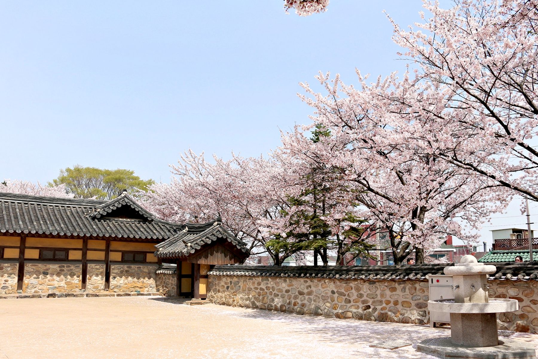 흙돌담과 멋진 기와지붕 사이로 흩날리는 벚꽃의 조화와 완벽한 조경으로 느껴지는 공간입니다.