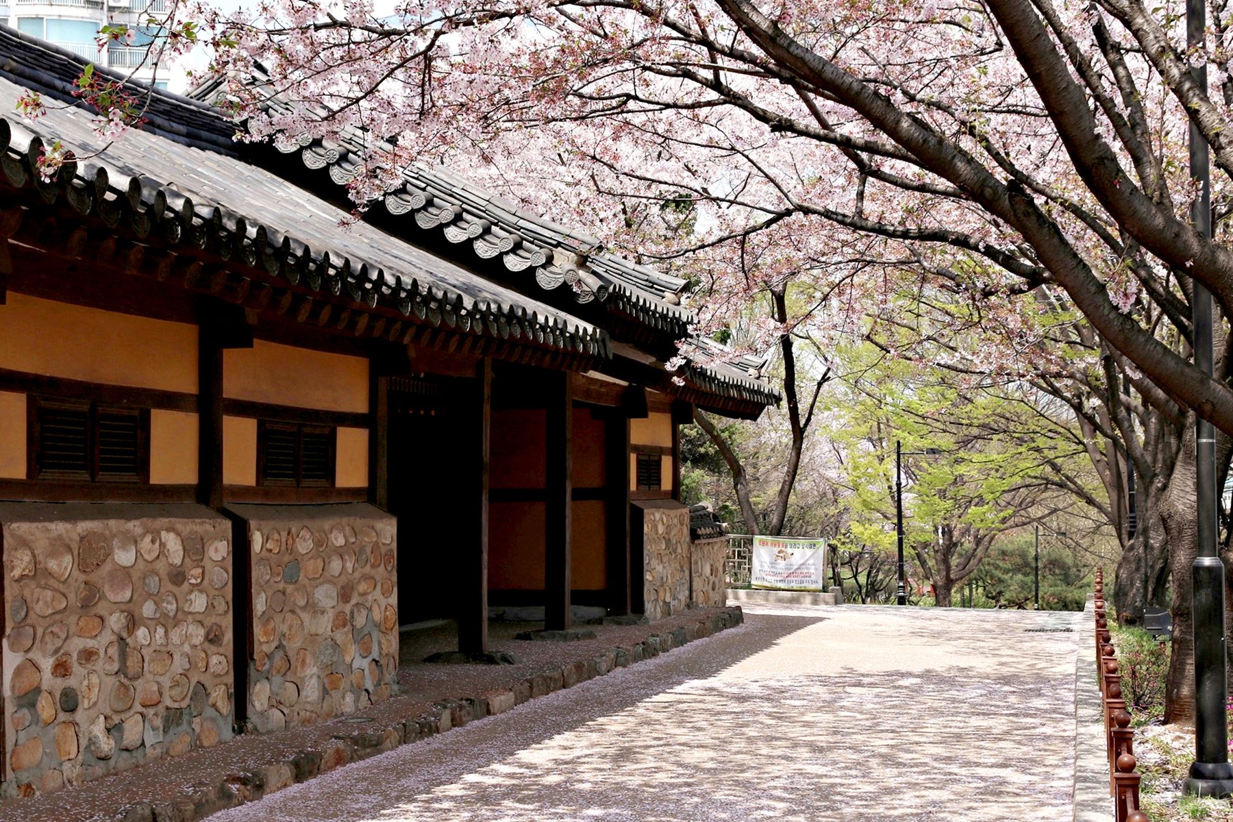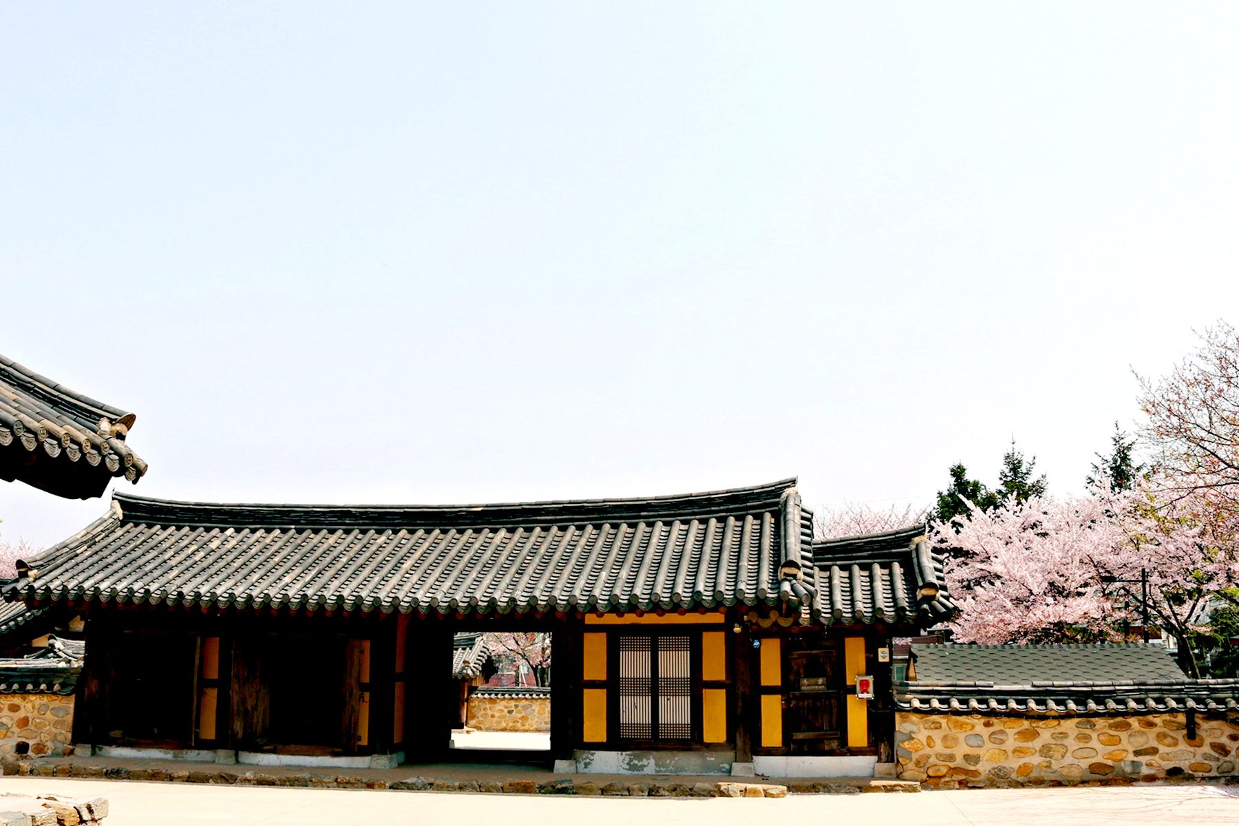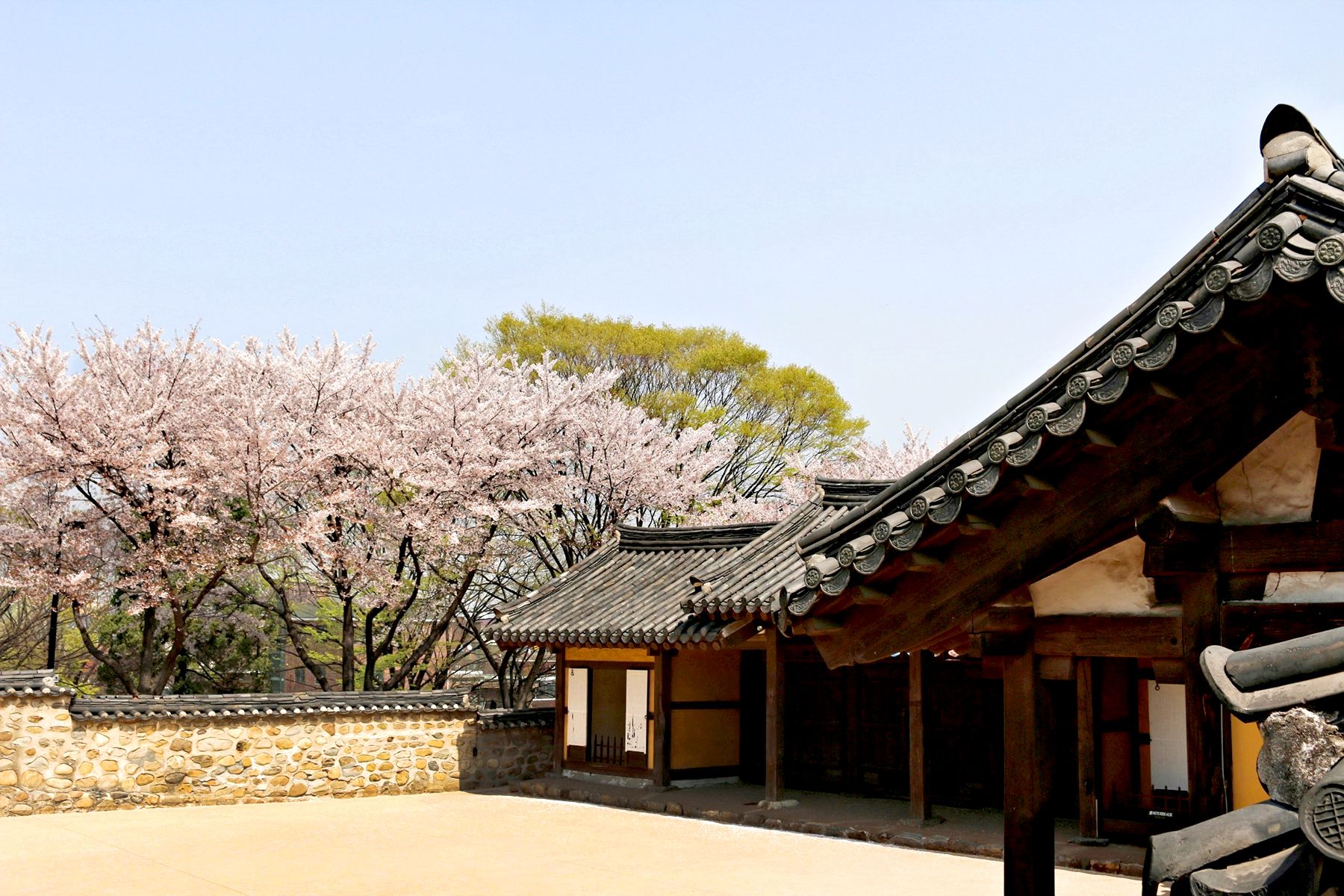흙돌담과 멋진 기와지붕 사이로 흩날리는 벚꽃의 조화와 완벽한 조경으로 느껴지는 공간입니다.