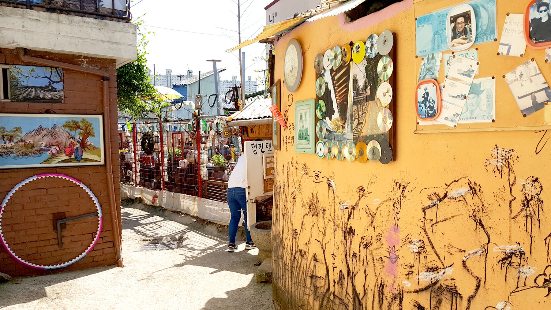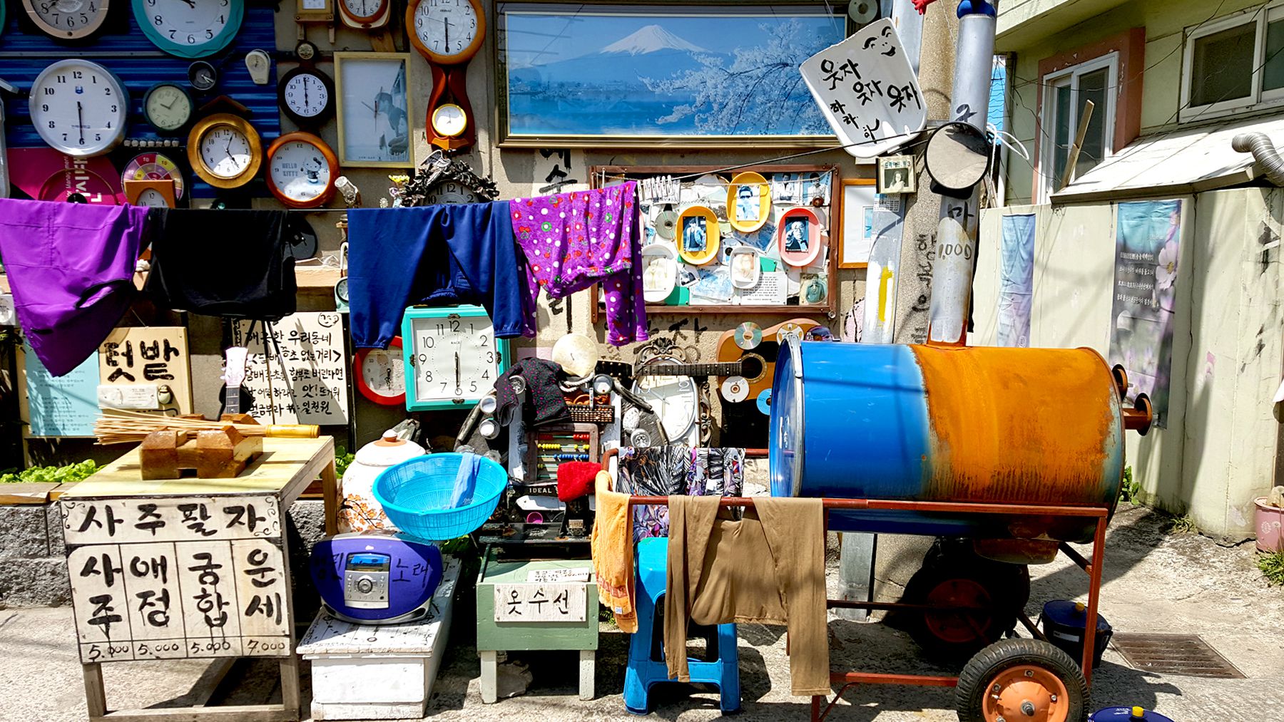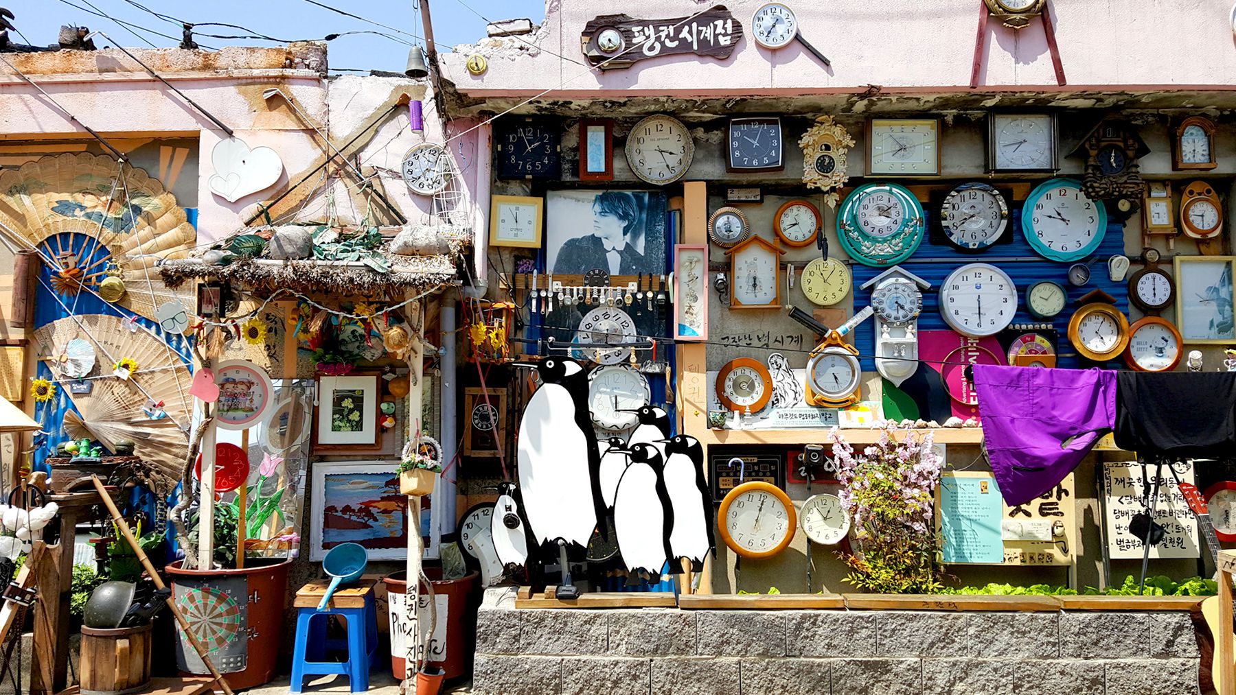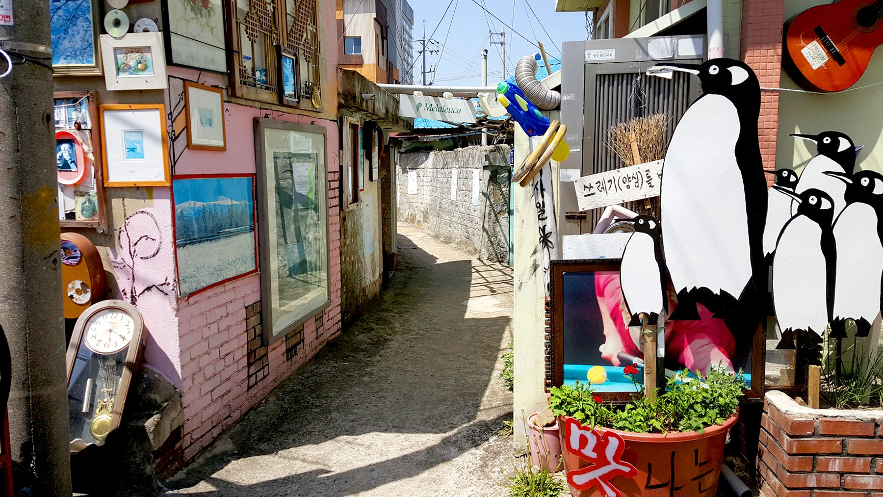 펭귄마을에서는 집집마다 누군가 쓰던 옛 물건들, 버려진 물건들로 담벼락을 빼곡히 메우고 있는 이색풍경을 만날 수 있습니다.