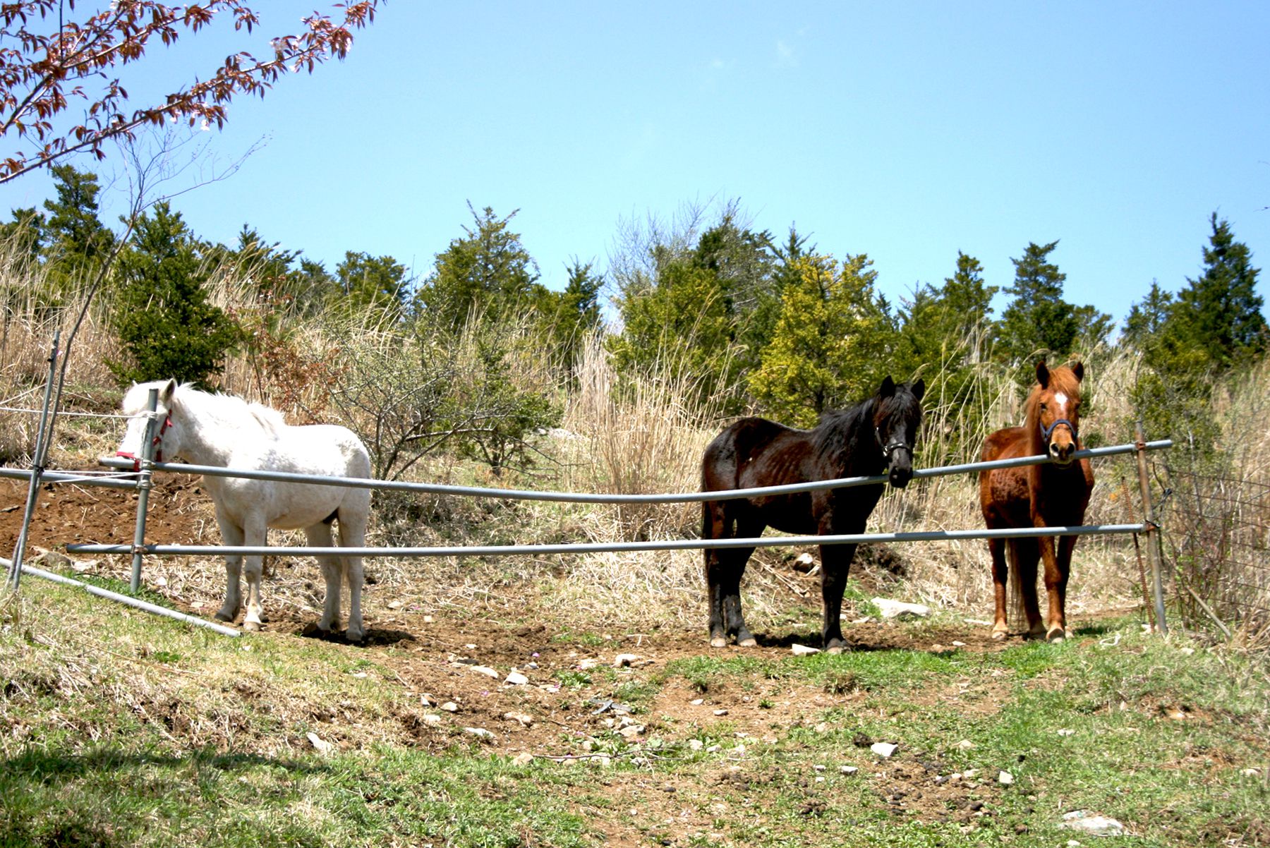 파란 하늘 아래 한가롭게 말이 풀을 뜯어먹으며 여유롭게 쉬고 있는 포니목장에