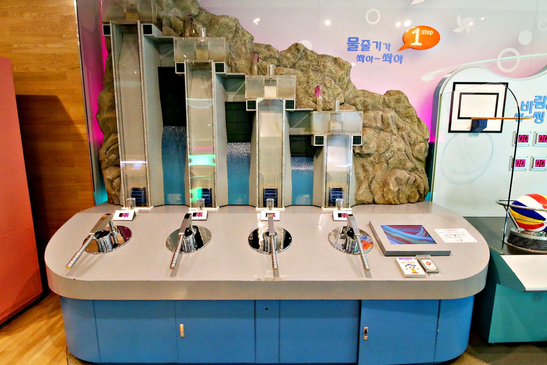 수력발전소에서 전기가 어떻게 만들어지는지 위치에너지를 통한 전기발전 원리를 체험해볼 수 있는 곳도 마련되어 있습니다.