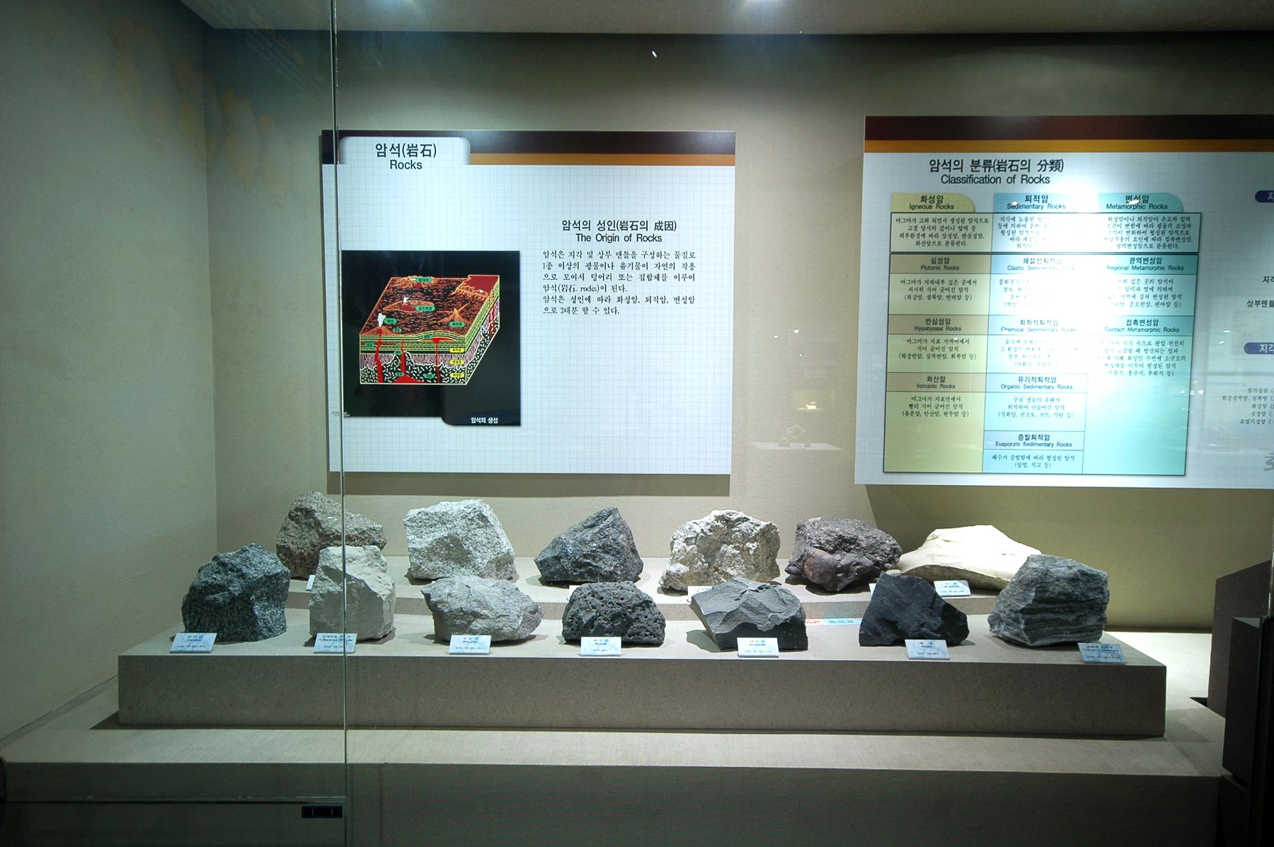 600여 점의 암석, 화석, 광물을 시대별, 성인별로 전시해 놓았습니다.